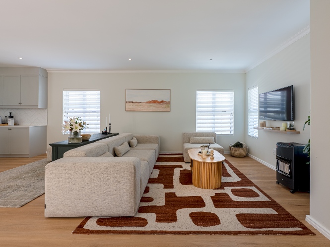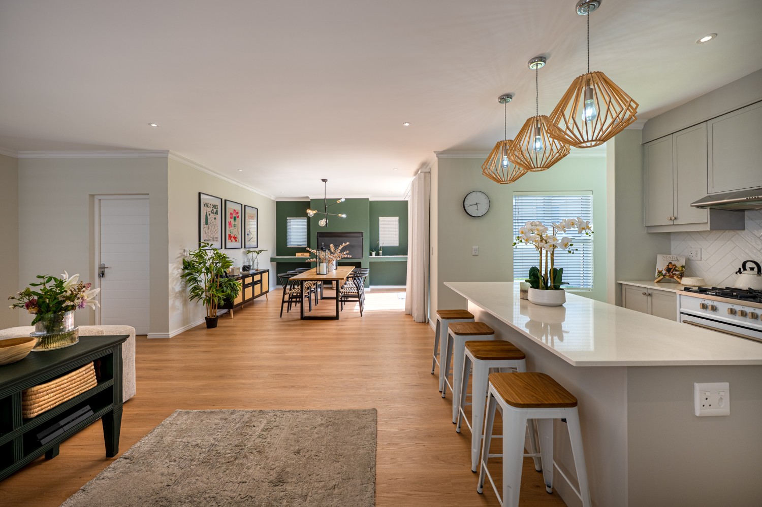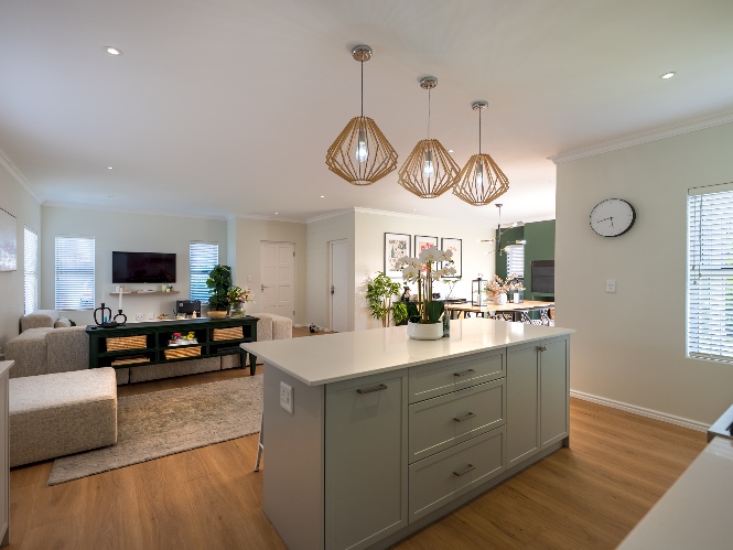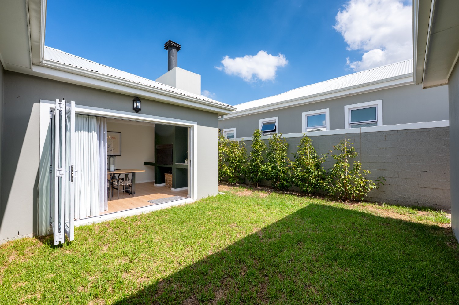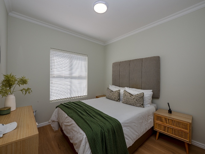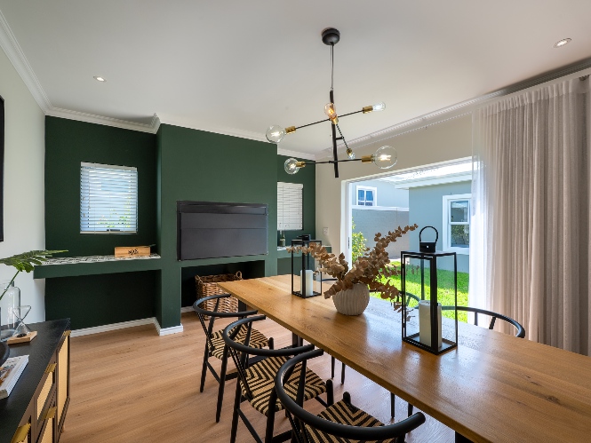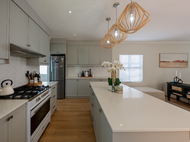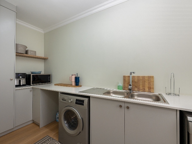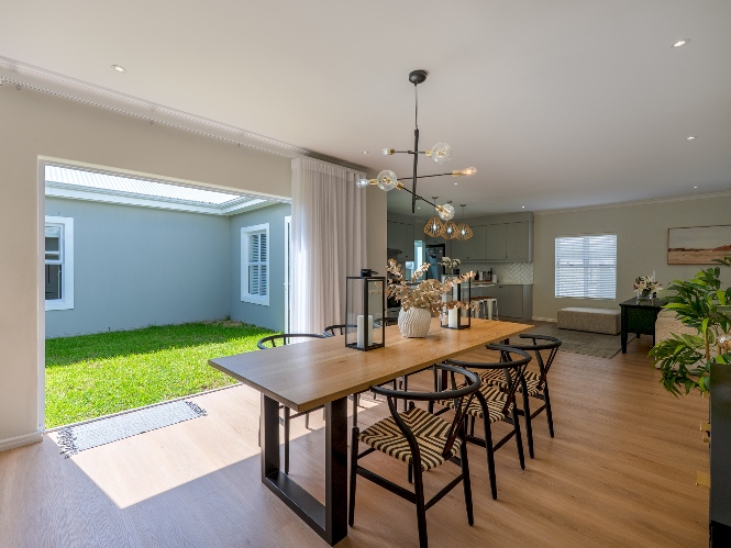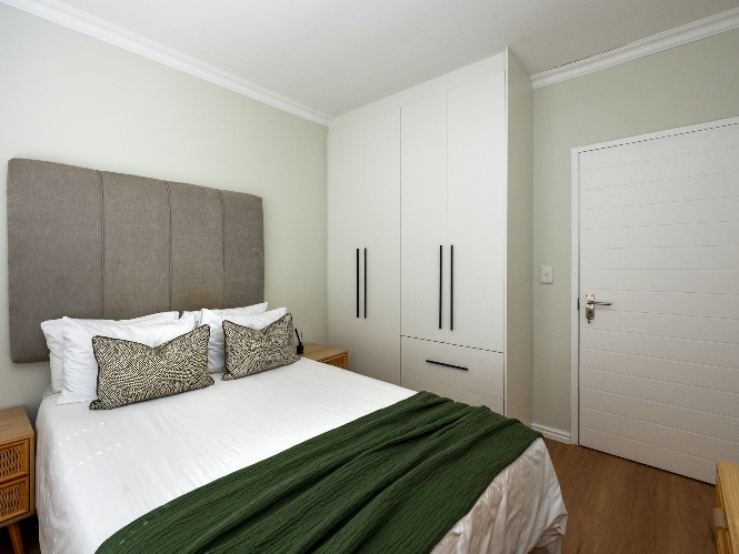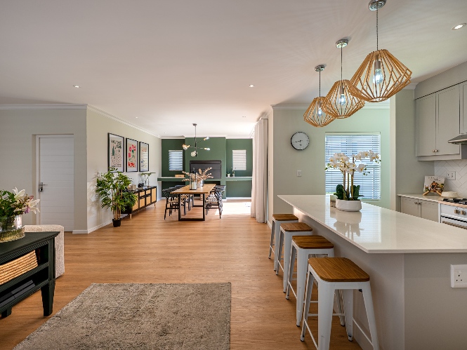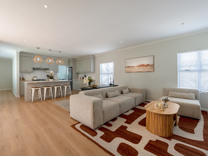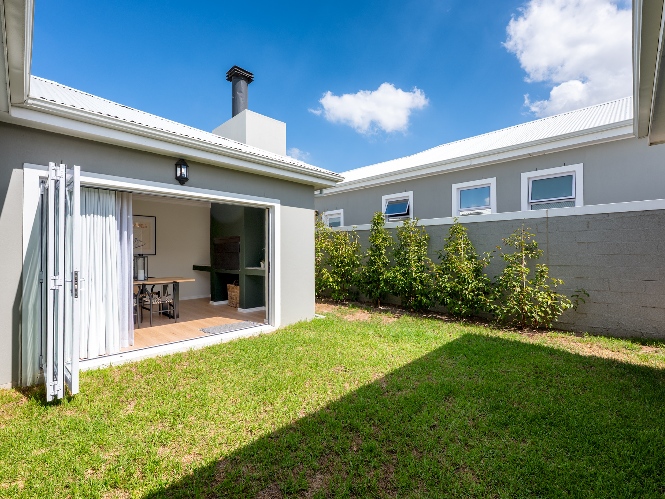 Step inside to a light-filled lounge and dining room with sleek vinyl flooring, creating a warm, contemporary feel. The modern, open-plan kitchen boasts elegant quartz countertops, a gas stove with an electric oven, extractor, and ample cupboard space to meet all your storage needs. A separate scullery offers a double sink, two plumbing points, conveniently accommodating both a dishwasher and a washing machine. The entertainment and dining room is adjacent to the lounge and features a built-in braai and stacker doors that flow seamlessly to the back garden.