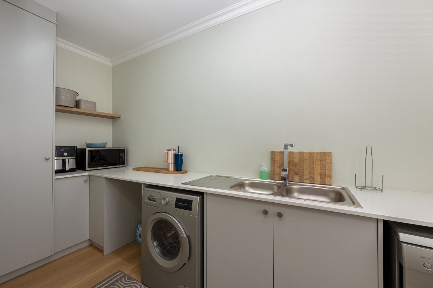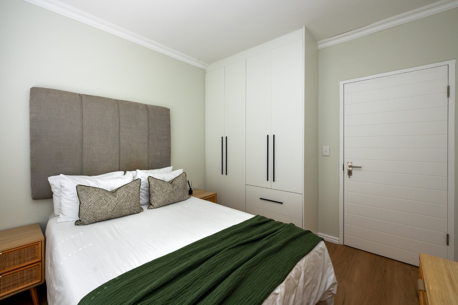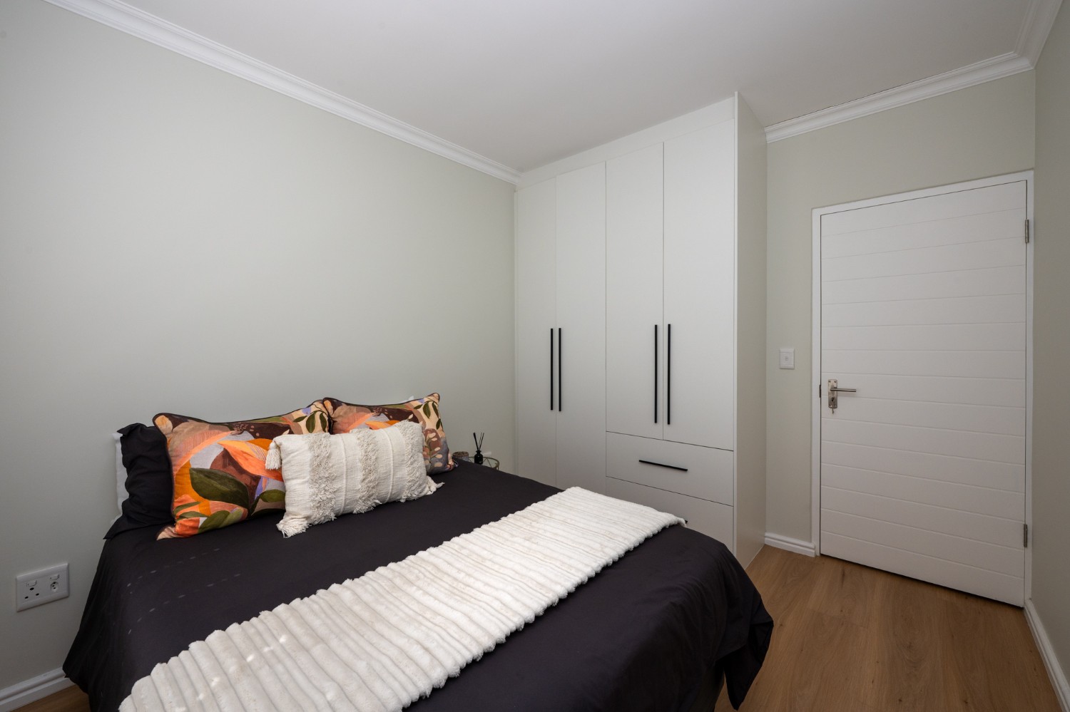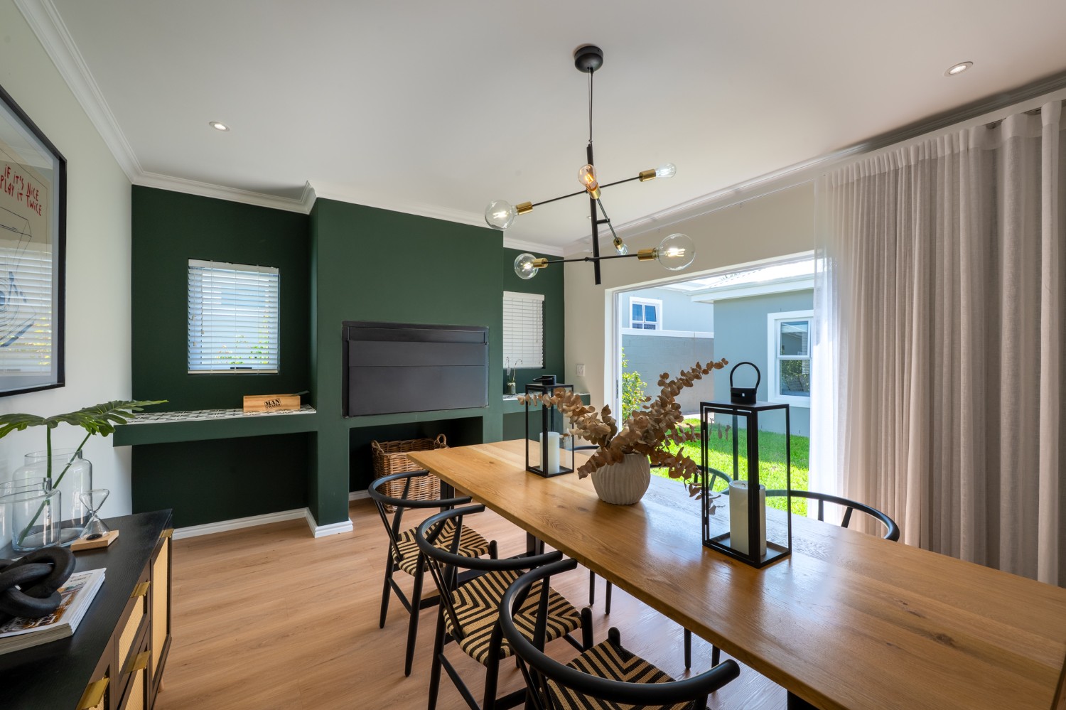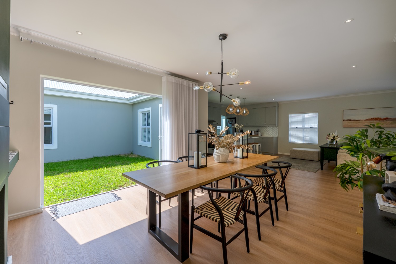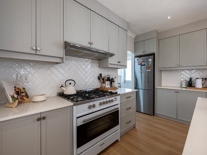 Step inside to a light-filled lounge and dining room with sleek vinyl flooring, creating a warm, contemporary feel. The modern, open-plan kitchen boasts elegant quartz countertops, a gas stove with an electric oven, extractor, and ample cupboard space to meet all your storage needs. A separate scullery offers a double sink, two plumbing points, conveniently accommodating both a dishwasher and a washing machine. The entertainment and dining room is adjacent to the lounge and features a built-in braai and stacker doors that flow seamlessly to the back garden.
