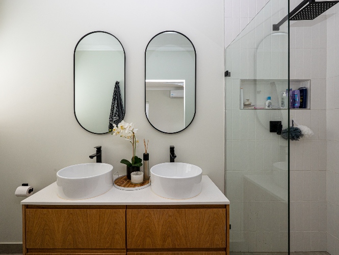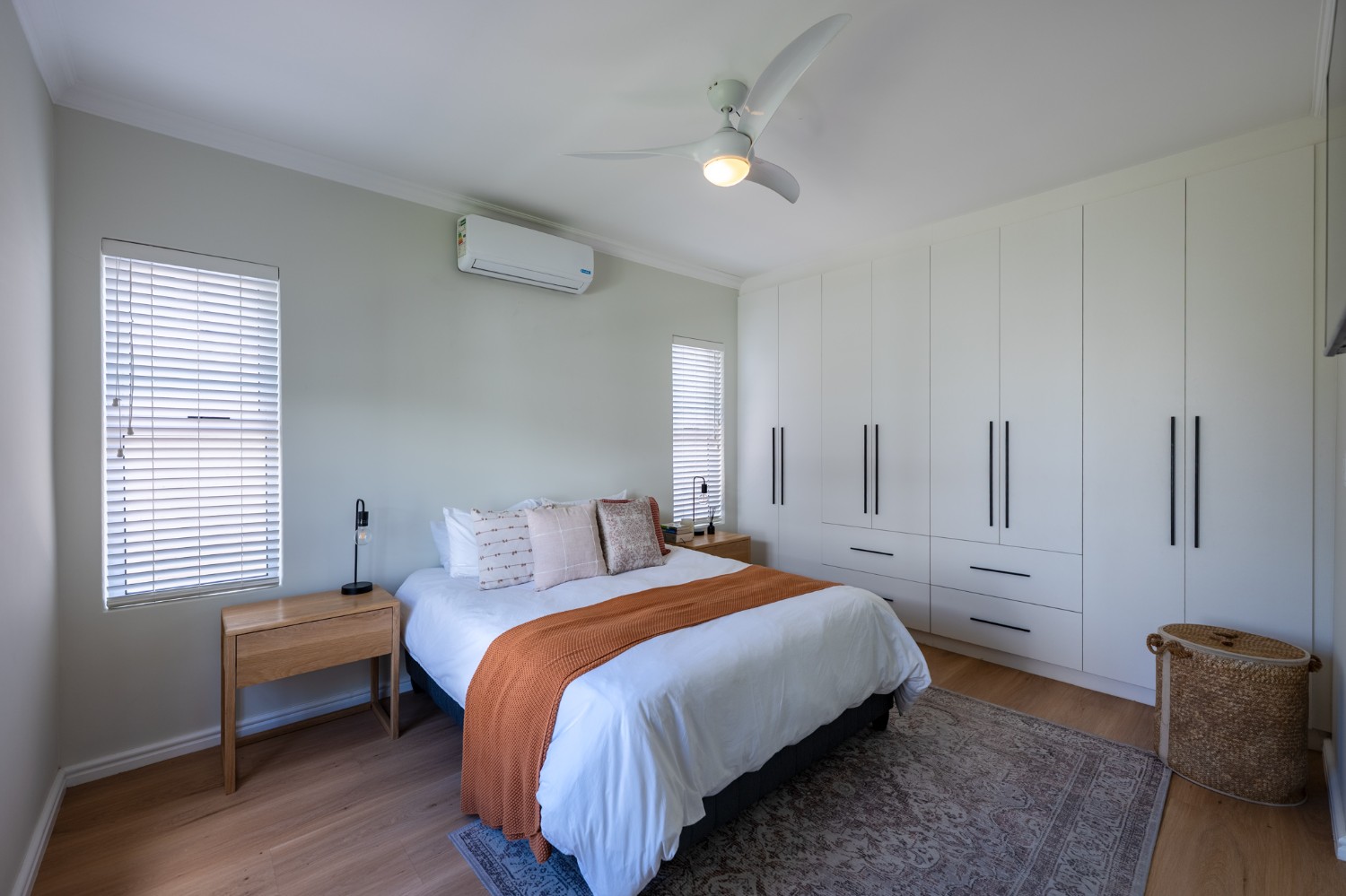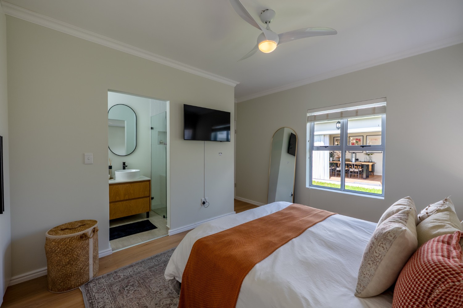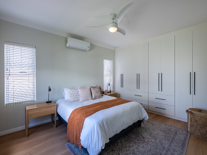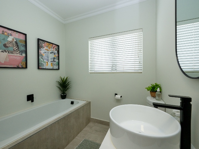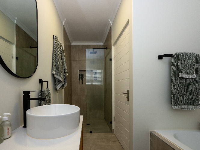 This home offers three well-sized bedrooms, all with built-in cupboards. The main bedroom includes an air-conditioner and a stylish en-suite bathroom equipped with a walk-in shower, his-and-hers basins, and a toilet. The family bathroom is equally impressive, featuring a spacious shower, bath, basin, and toilet.