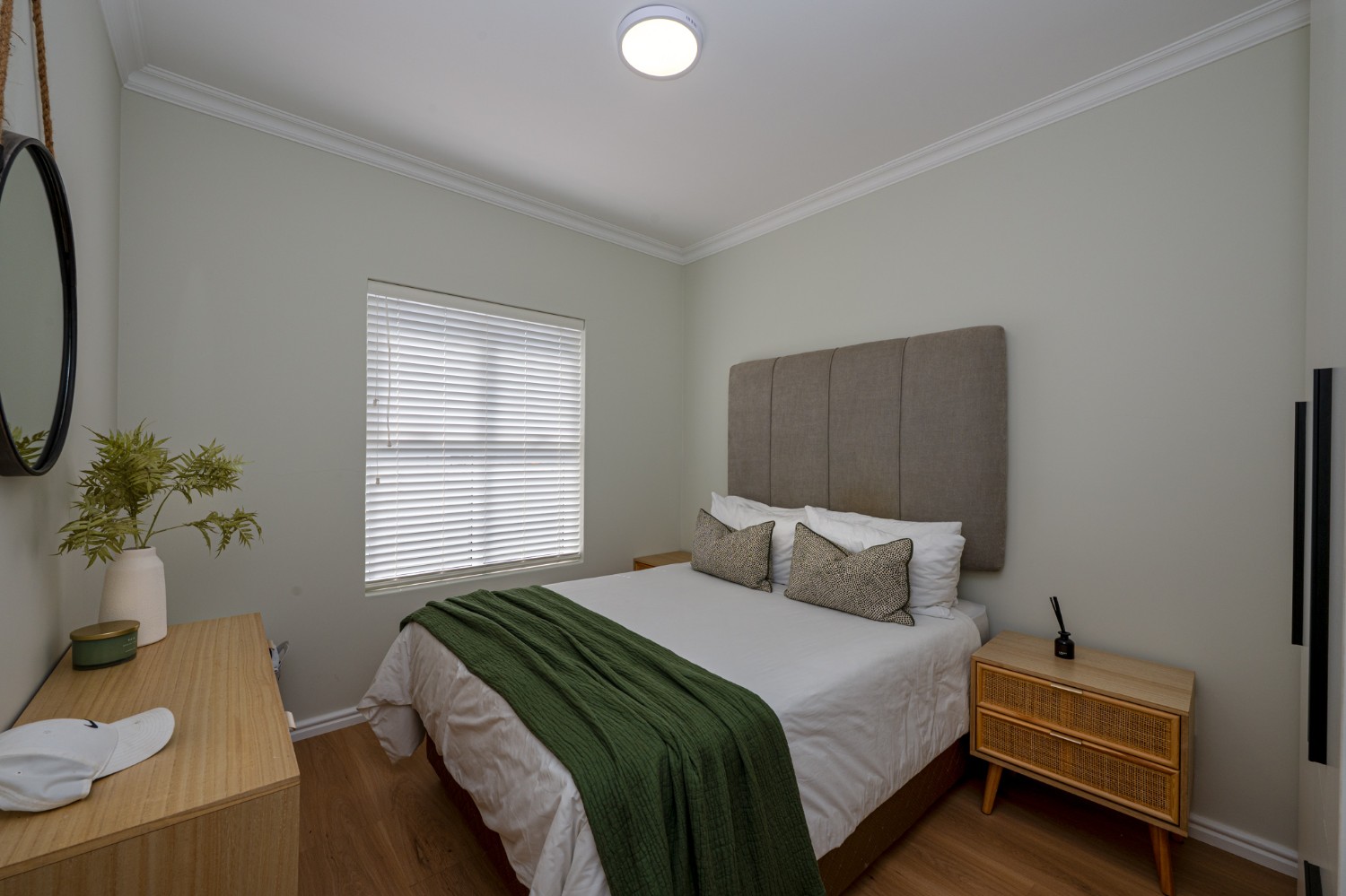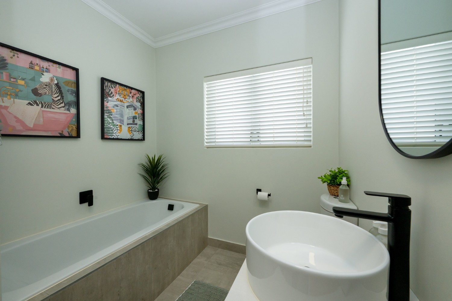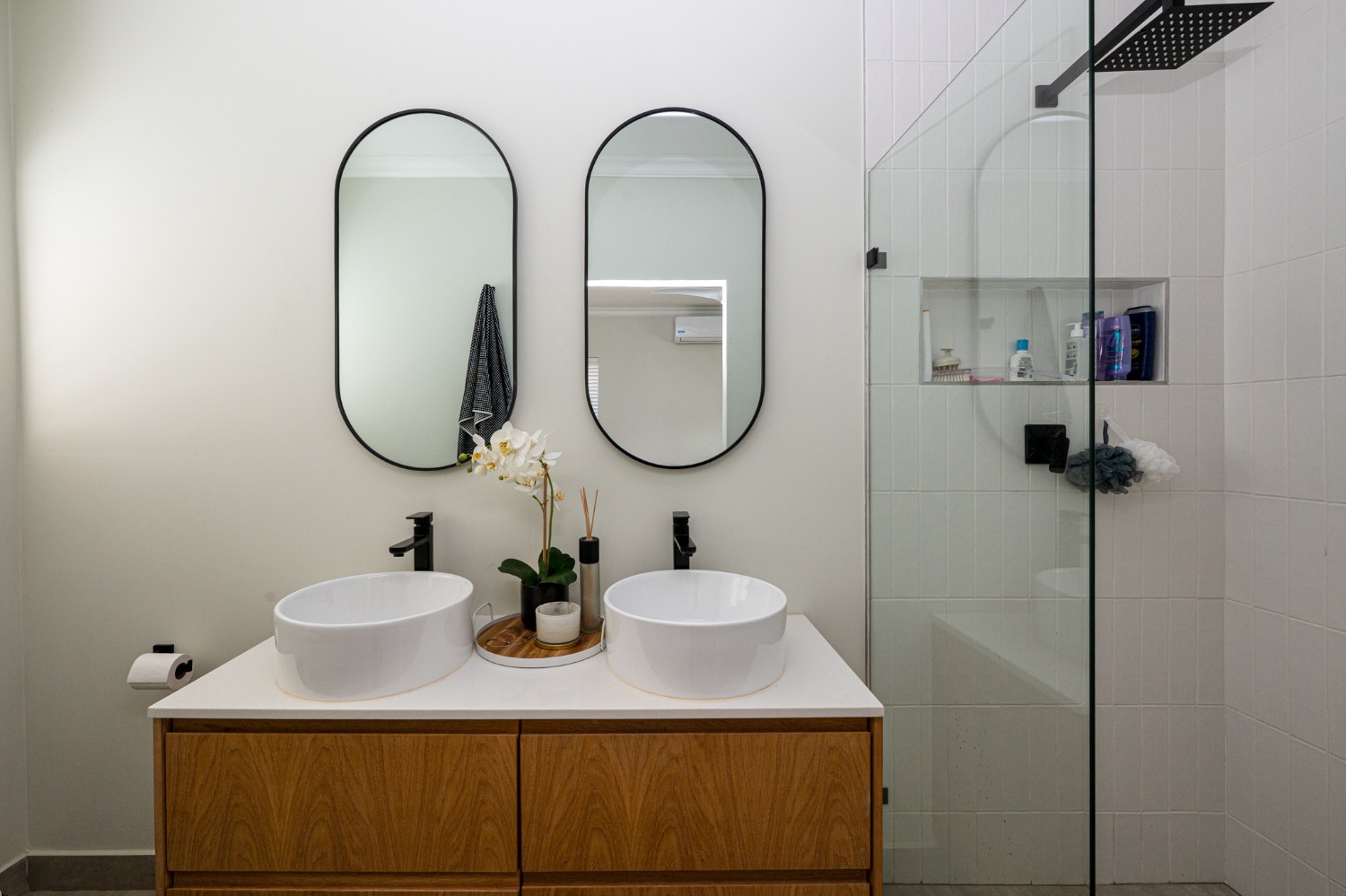 This home offers three well-sized bedrooms, all with built-in cupboards. The main bedroom includes an air-conditioner and a stylish en-suite bathroom equipped with a walk-in shower, his-and-hers basins, and a toilet. The family bathroom is equally impressive, featuring a spacious shower, bath, basin, and toilet.