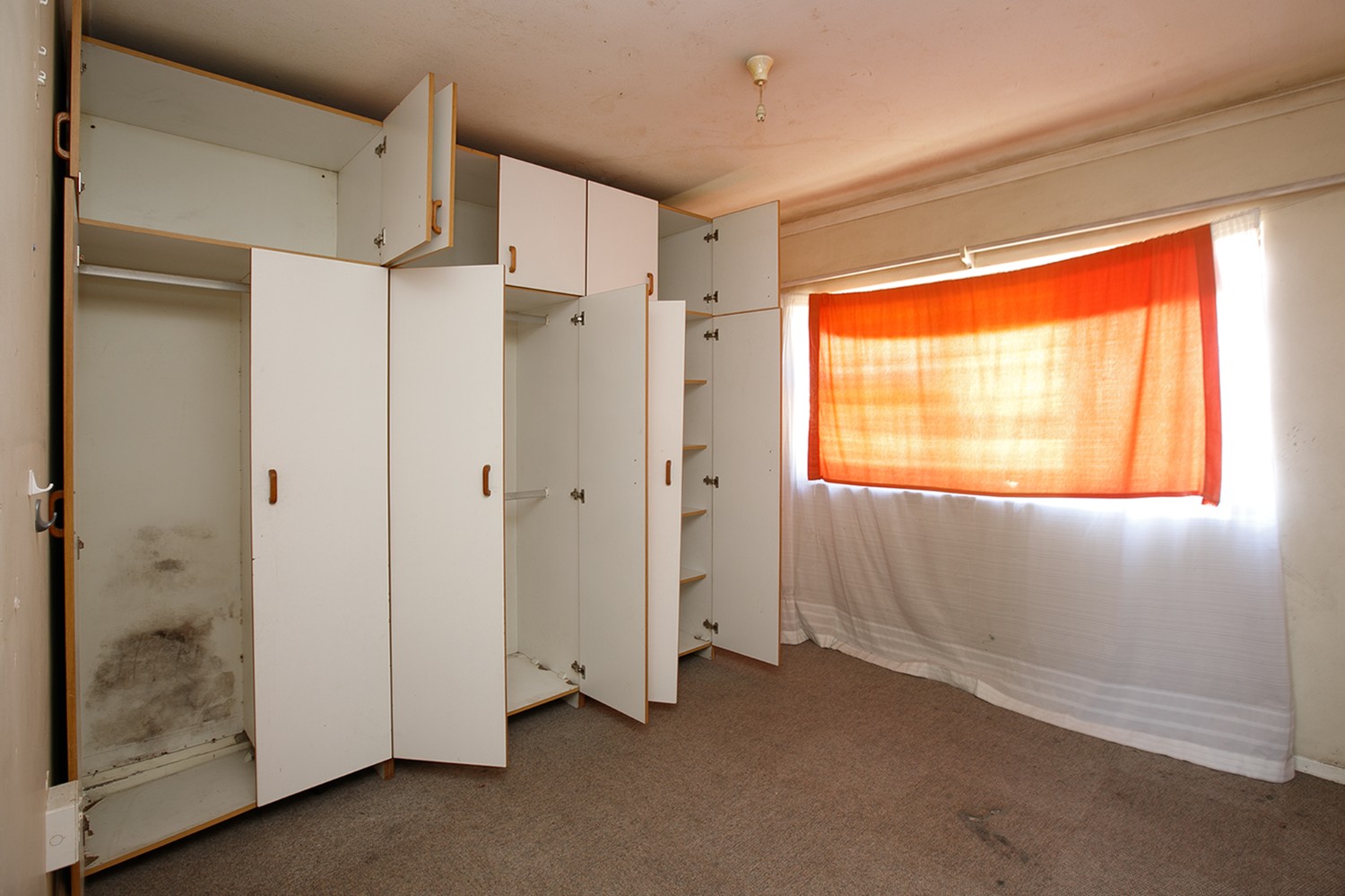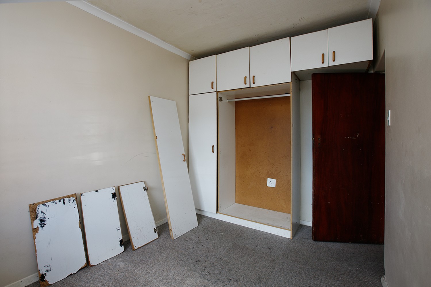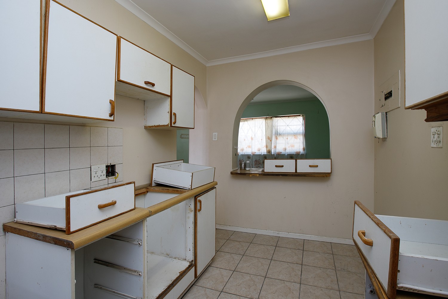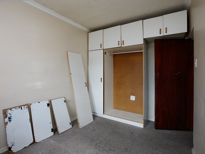 As you arrive, you are welcomed through a hallway leading into the living area, which offers a comfortable lounge and kitchen space. The kitchen is fitted with built-in cupboards.