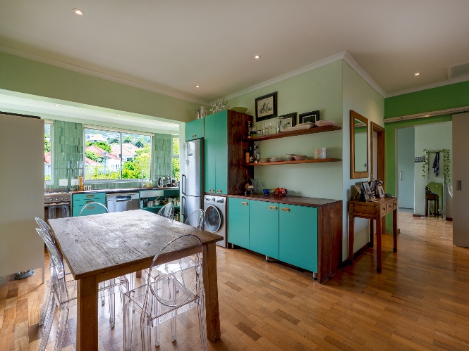 Gorgeous wooden flooring adds warmth and charm, while large windows invite in an abundance of natural sunlight, enhancing the sense of openness throughout. The living area is both practical and inviting, a relaxed space to unwind while enjoying the spectacular outlook.