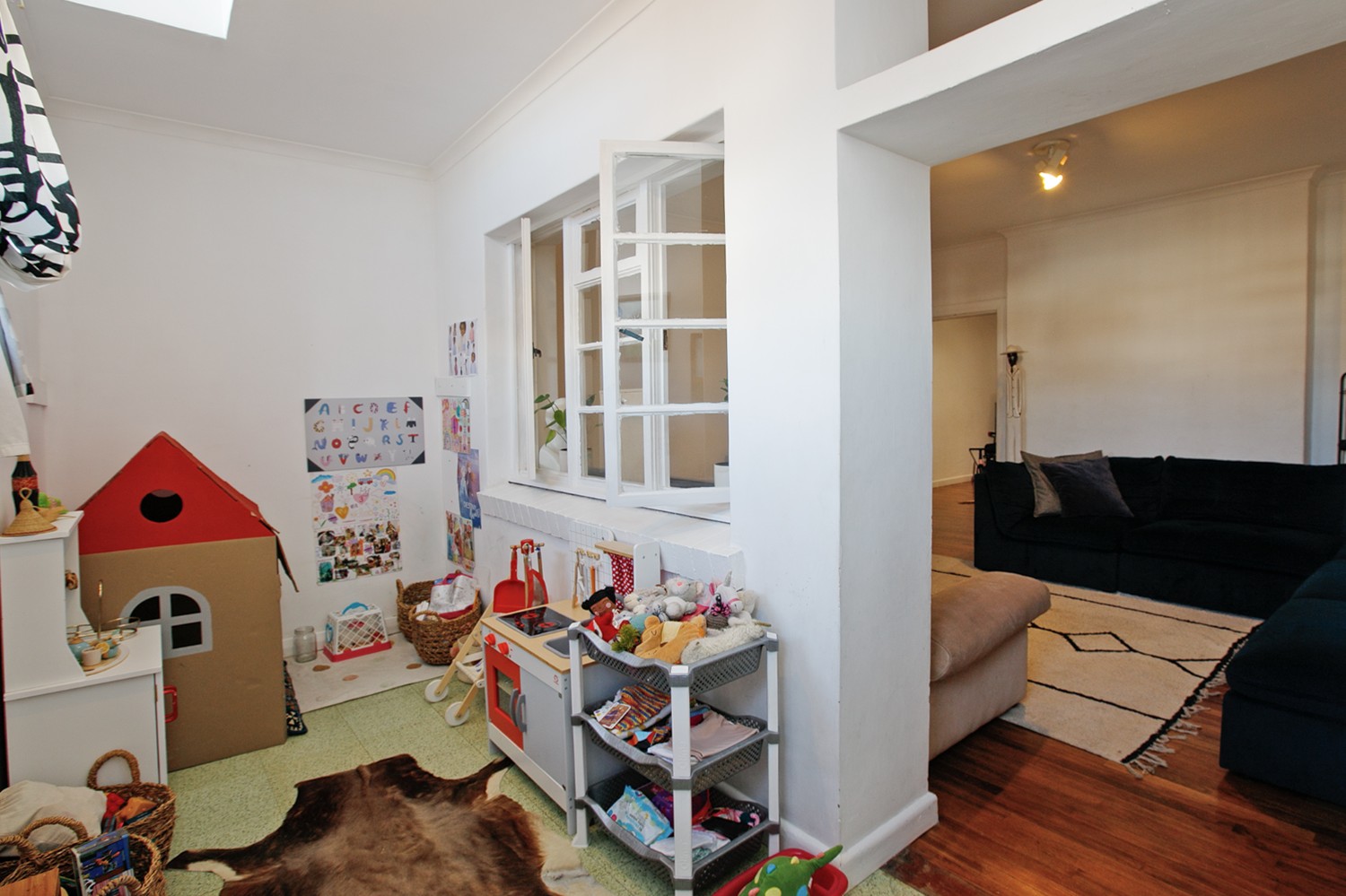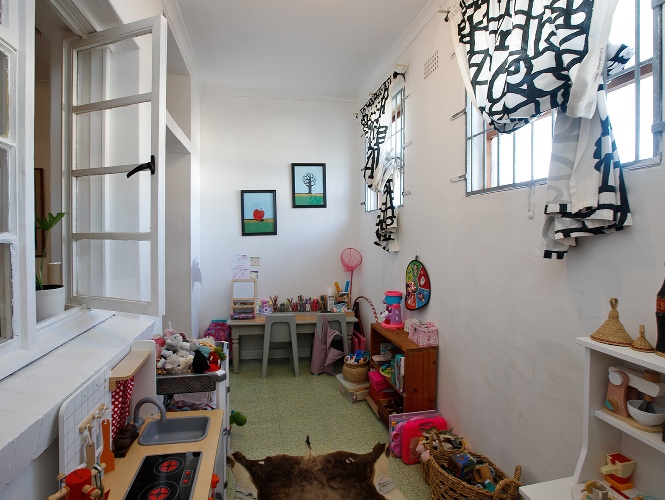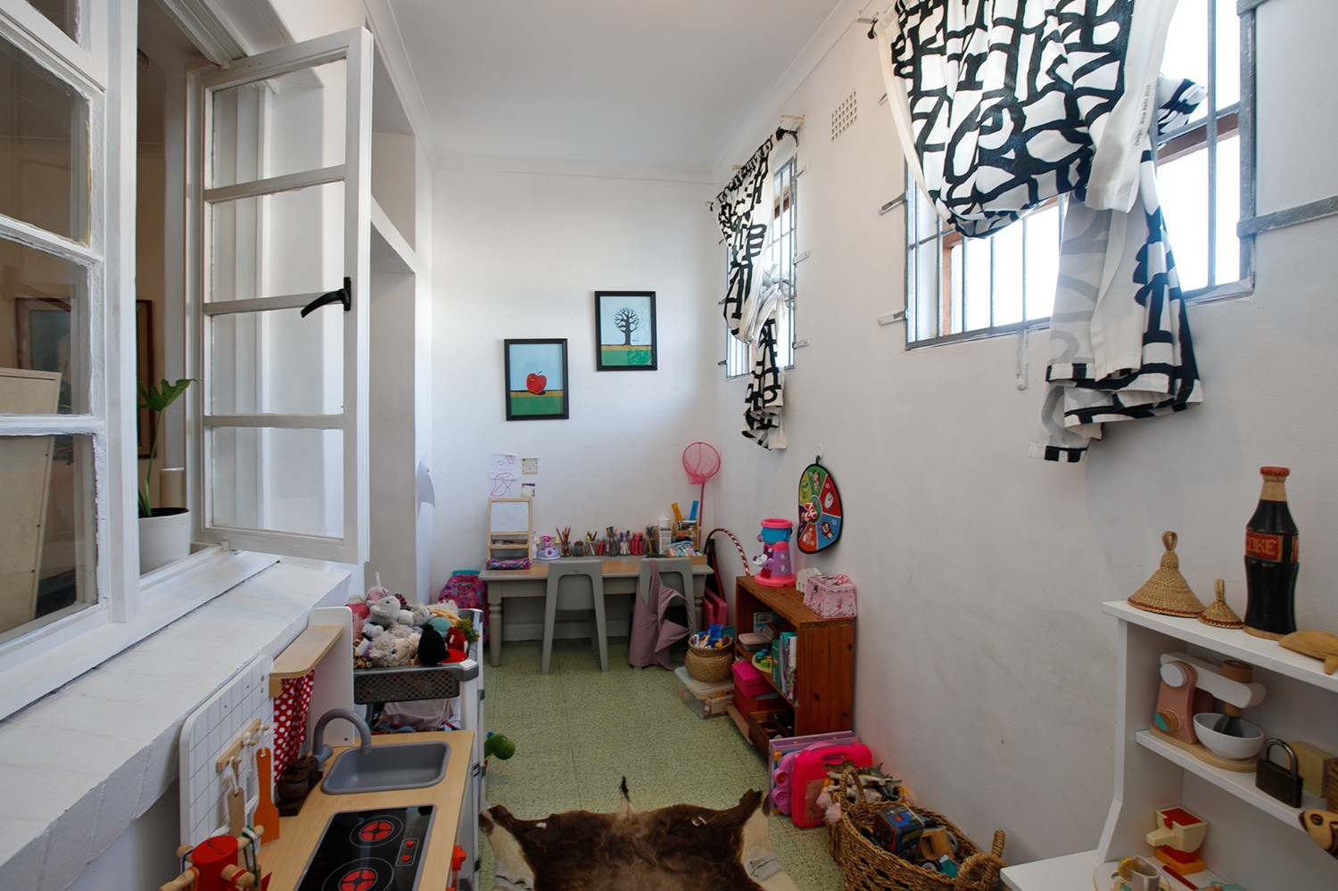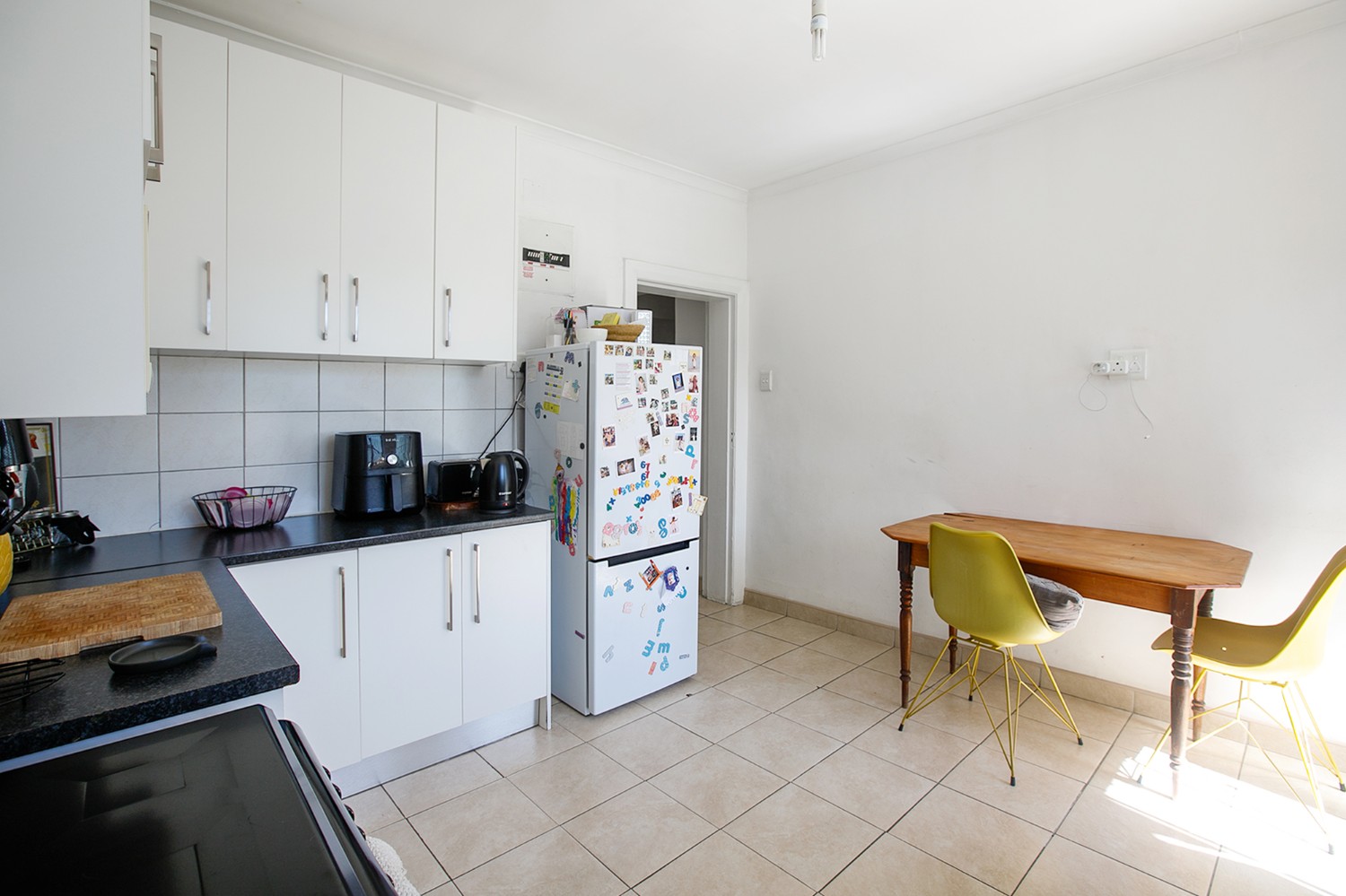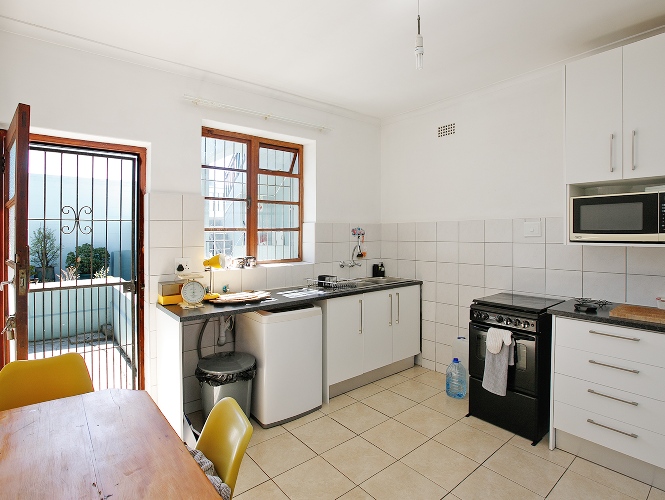 The apartment features a separate, bright kitchen fitted with built-in cupboards.
