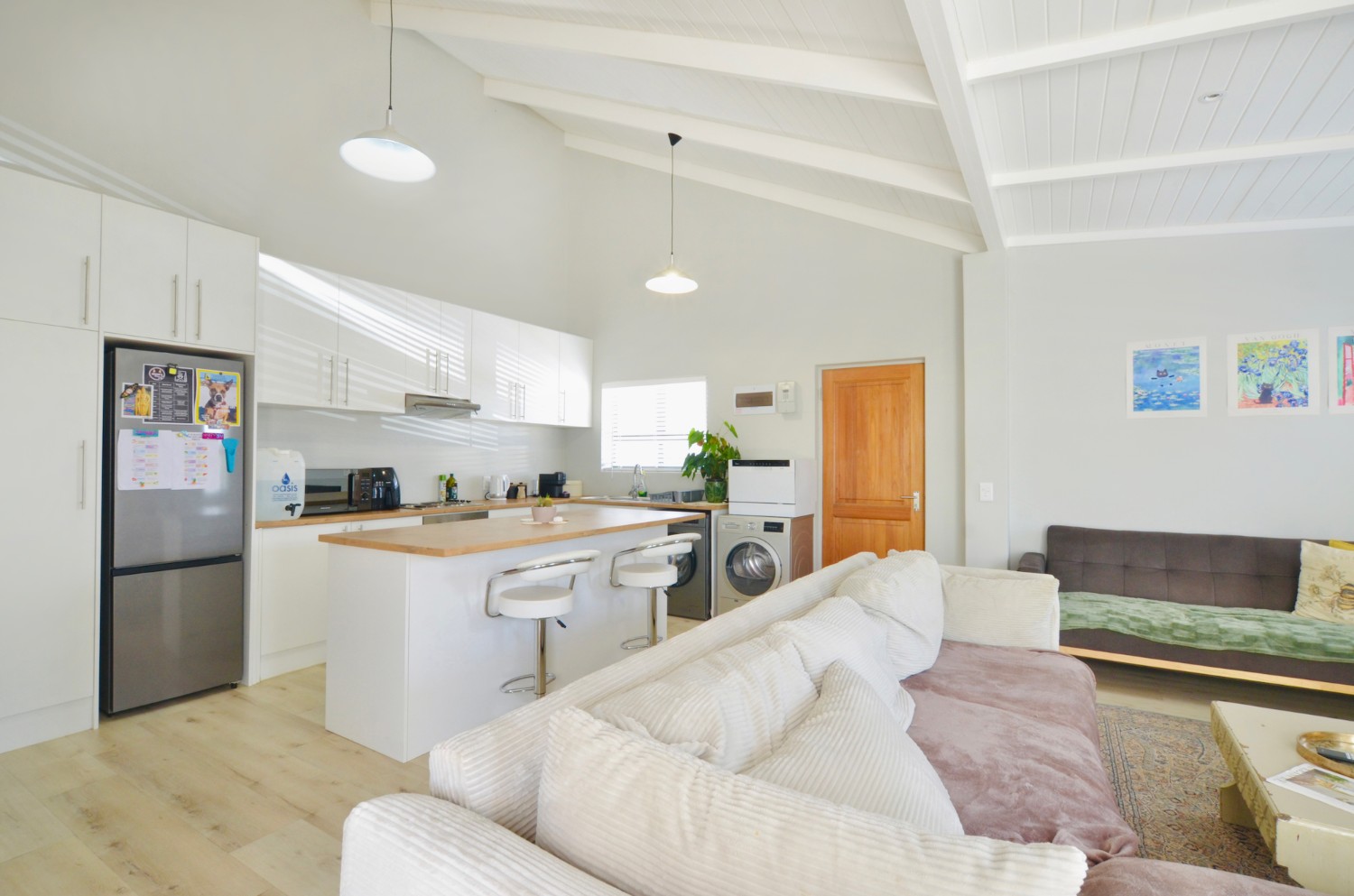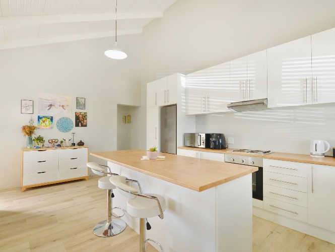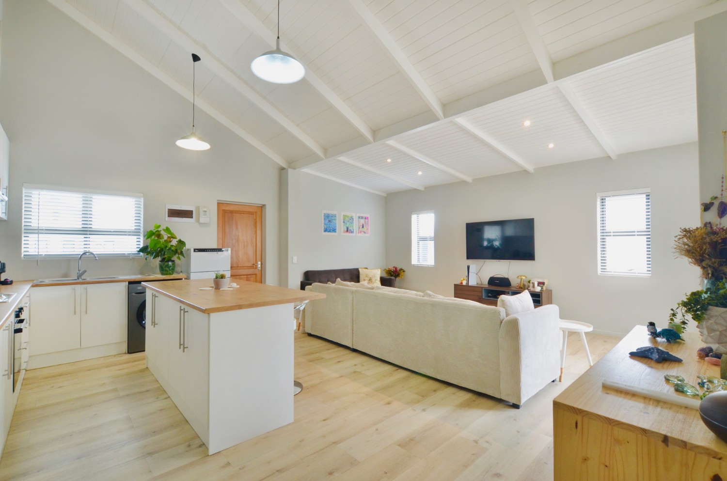 Starting with a lovely open-plan kitchen, overlooking the lounge area - it offers plenty of cupboard space, wood veneer countertops, oven and electric hob with extractor, double wash sinks, plumbing for two appliances; and a spacious island counter for additional work surfaces, as well as a breakfast counter.