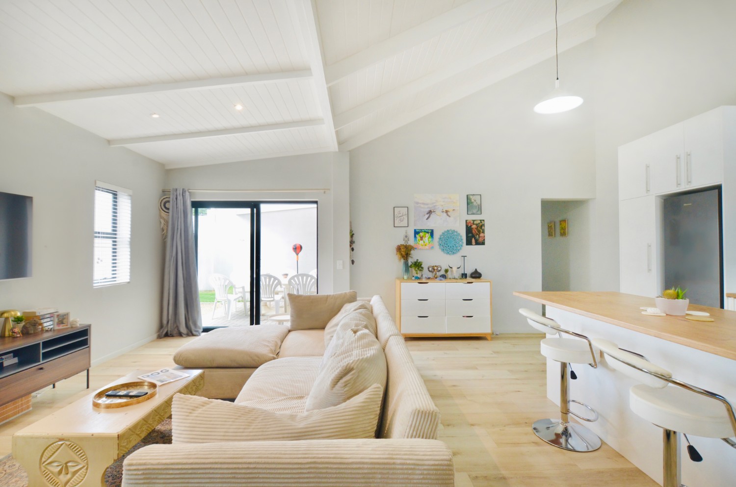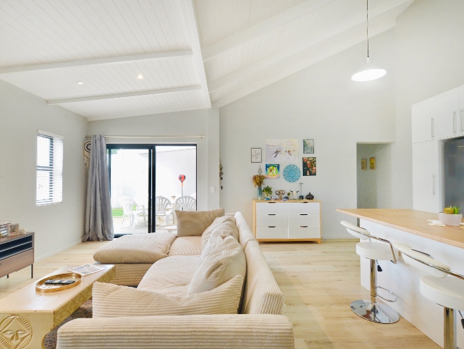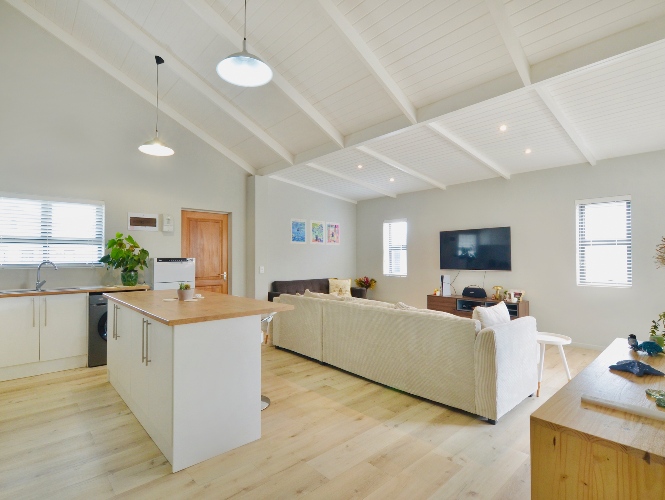 The lounge is spacious enough to fit in family-sized couches, and opens directly onto quiet covered patio area, which then leads up the side of the house to a neat and easy-to-maintain back garden which is completely enclosed – perfectly safe for playtime and roaming furry friends.