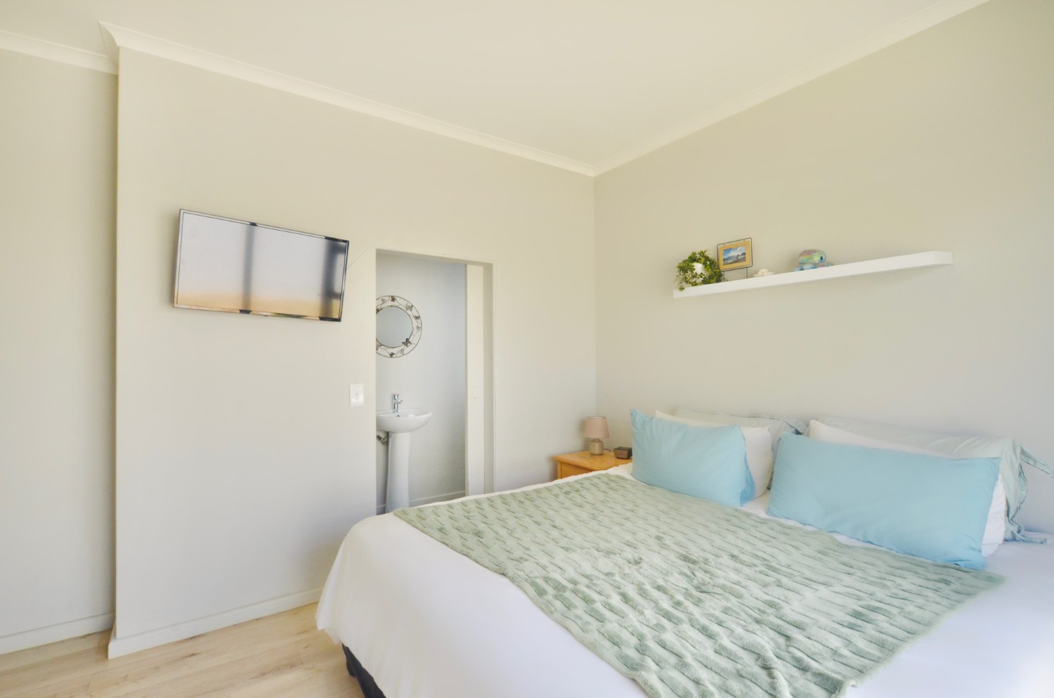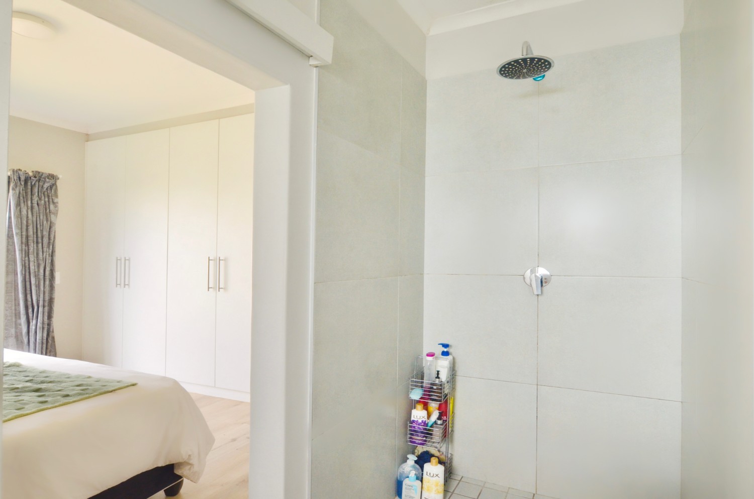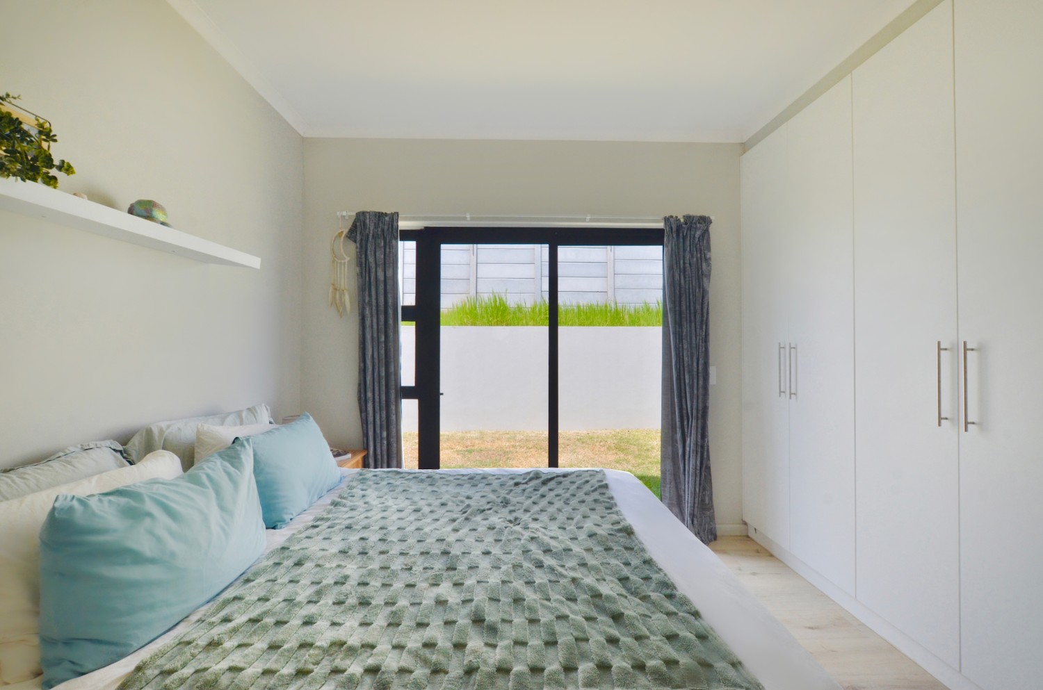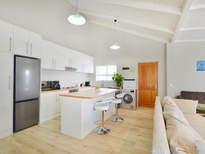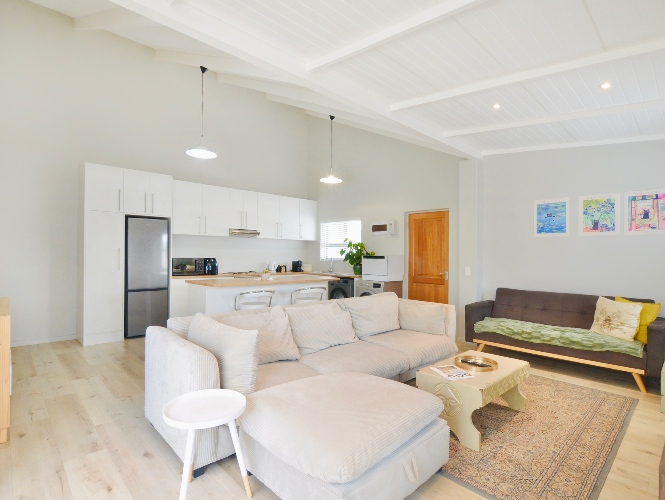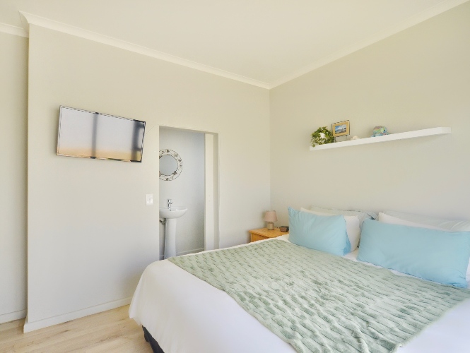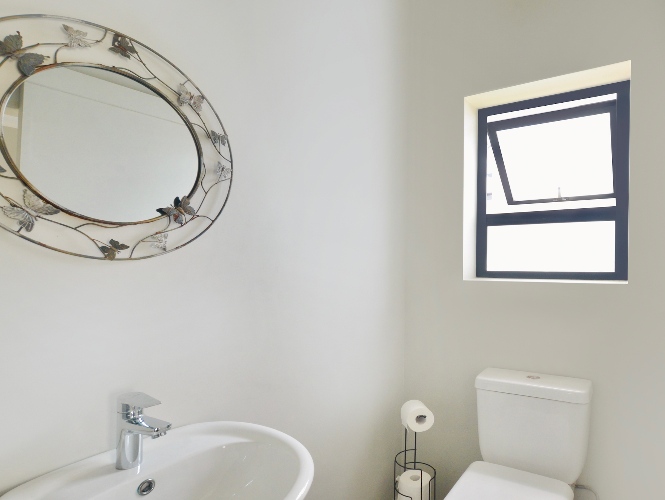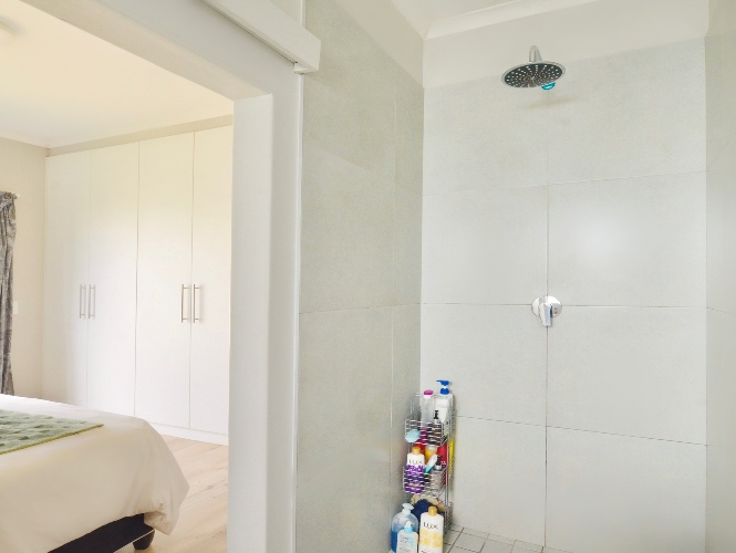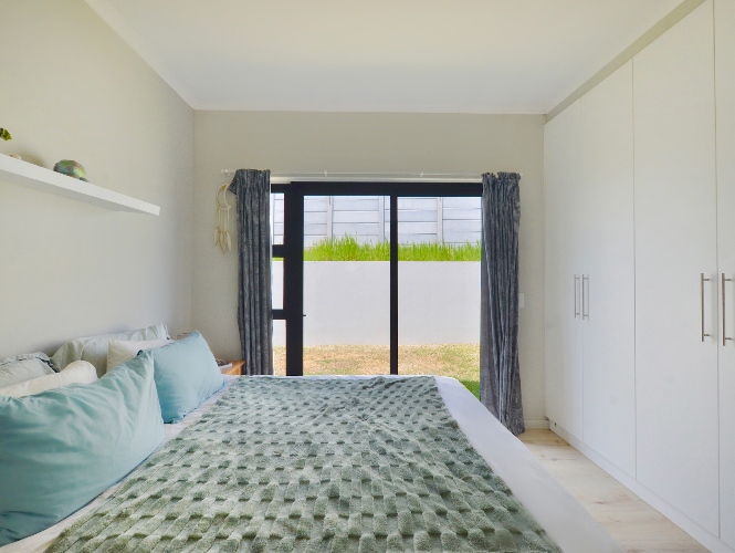 The main bedroom opens up directly to the back garden, creating a sense of separation from the living room space. It has built-in-cupboards, and it also features an ensuite bathroom with shower, handbasin and toilet.