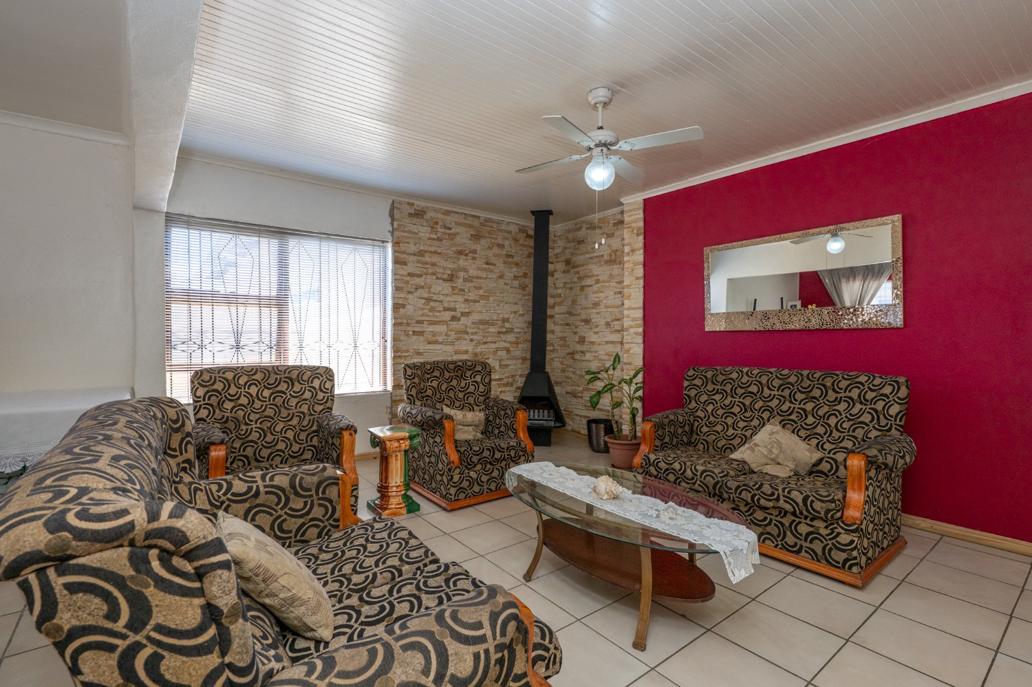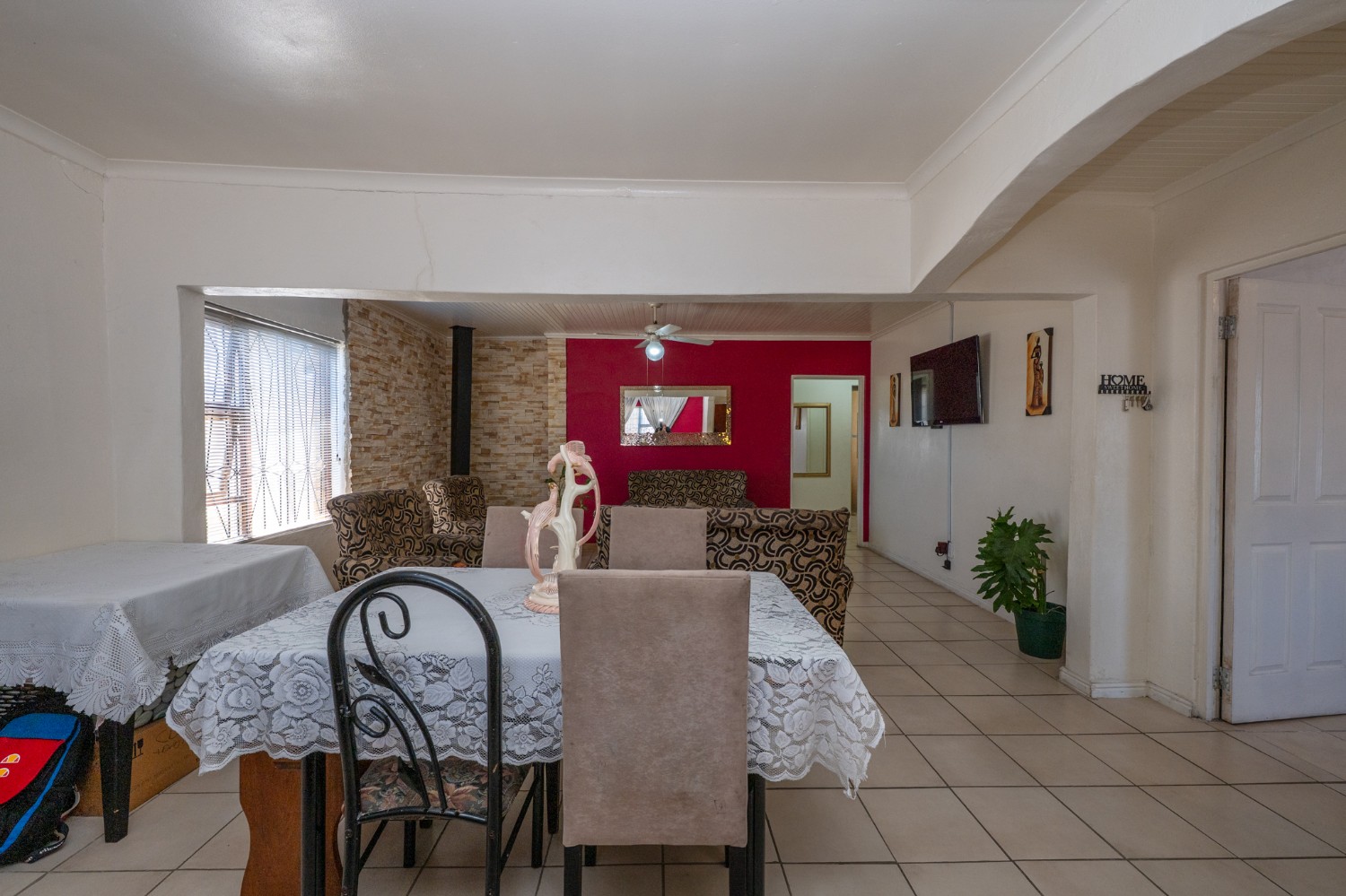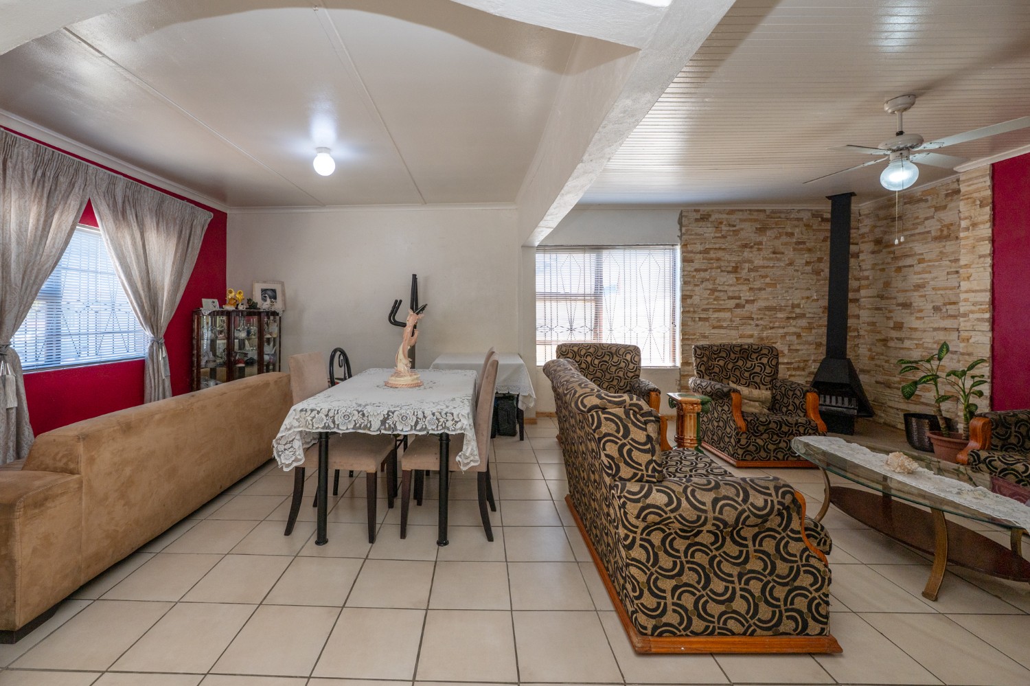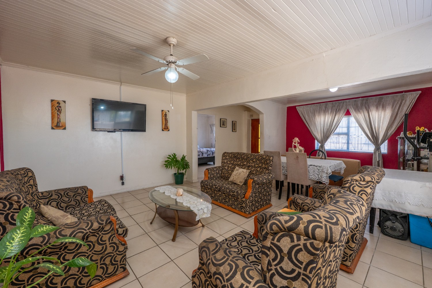 Step inside to a spacious open-plan lounge and dining area, complete with tiled flooring, a ceiling fan, and large windows that flood the space with natural light. The fully fitted kitchen features light wood cabinetry, an under-counter oven and hob, as well as a cosy breakfast nook for relaxed family meals.