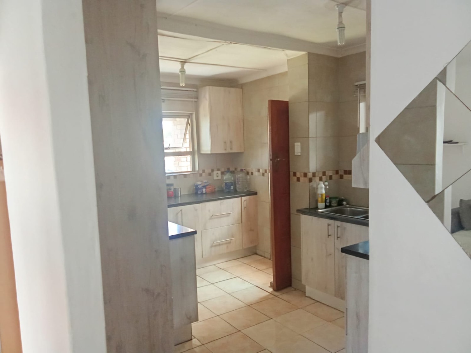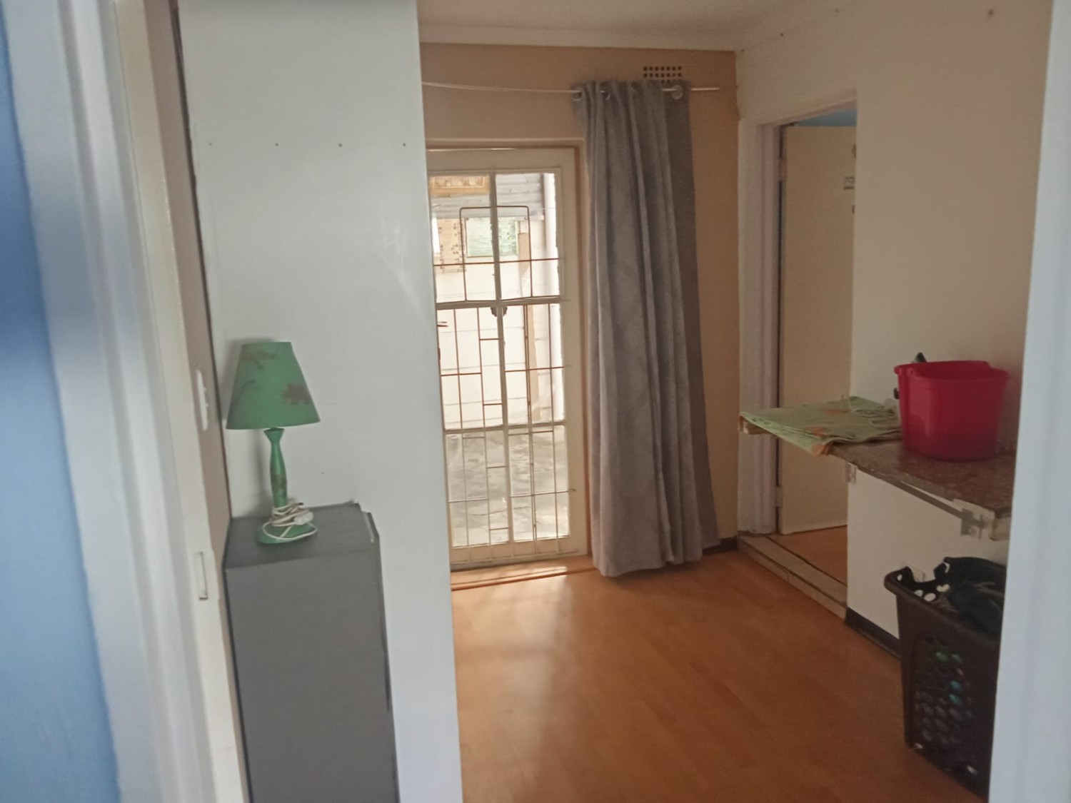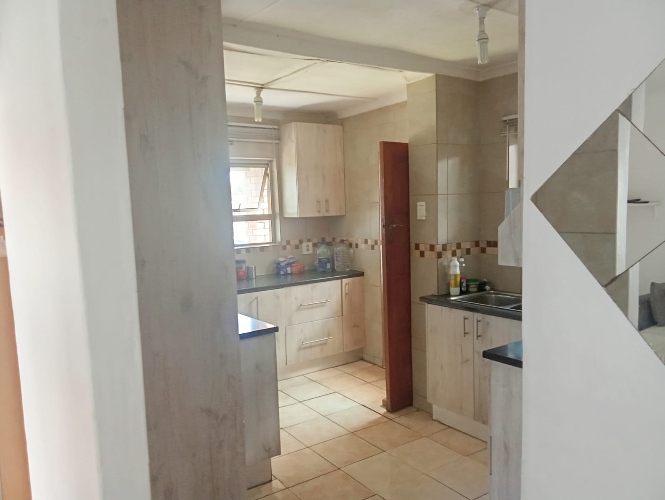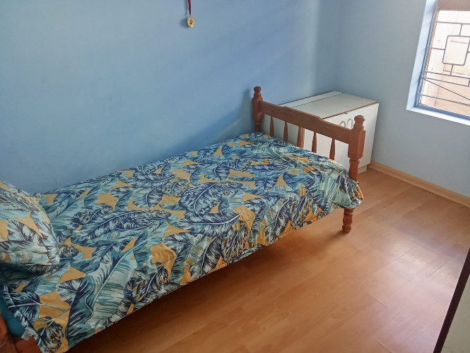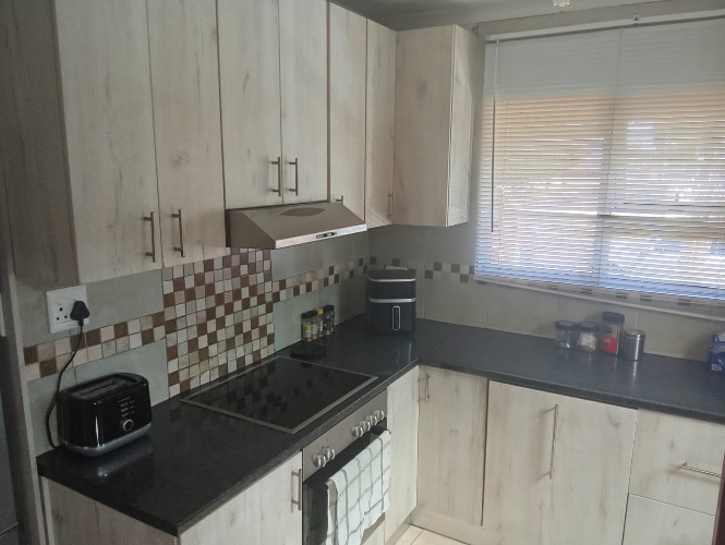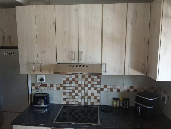 There are three bedrooms, two of which feature built-in cupboards. One bedroom is fitted with carpets, while the other two boast laminated flooring for a modern and low-maintenance finish. The home includes a family bathroom equipped with a bath, toilet, and basin. The en-suite bathroom offers a bath with a hand shower, toilet, and basin, as well as a convenient washing machine point.