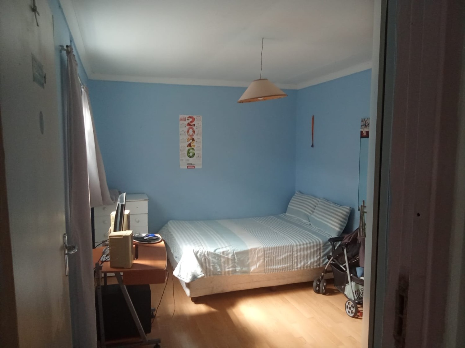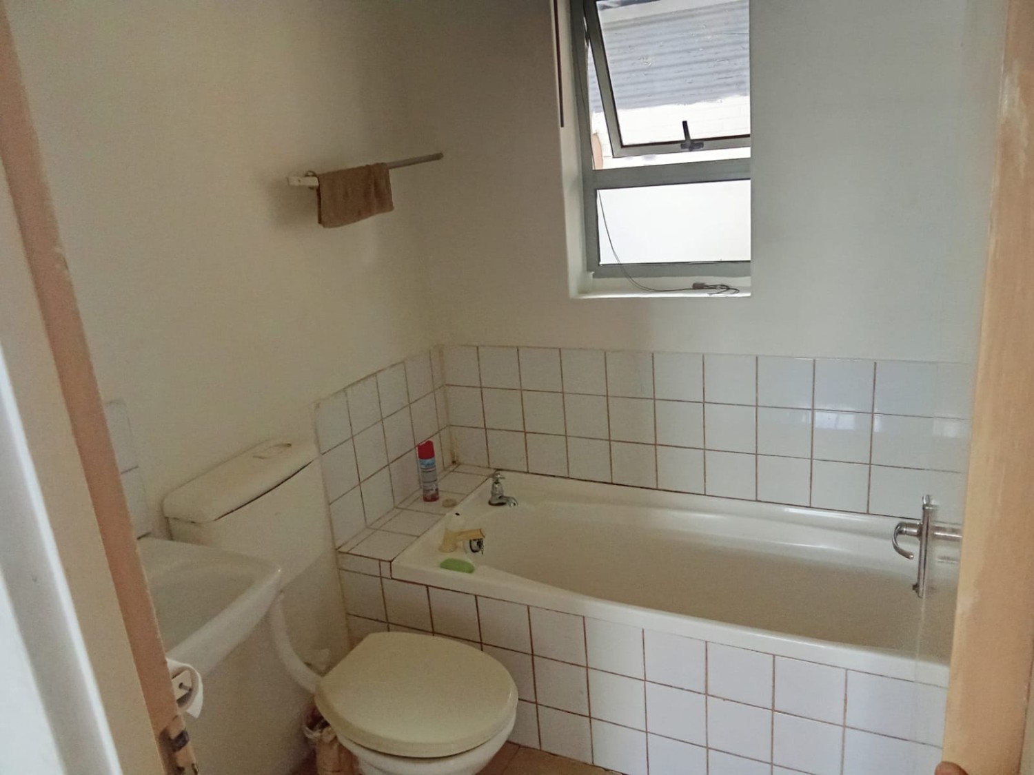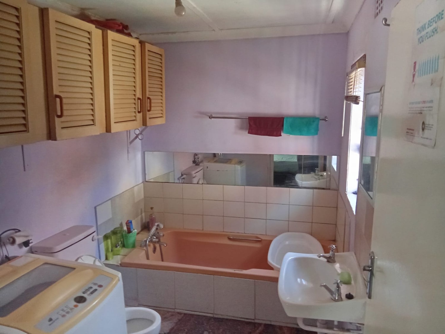 There are three bedrooms, two of which feature built-in cupboards. One bedroom is fitted with carpets, while the other two boast laminated flooring for a modern and low-maintenance finish. The home includes a family bathroom equipped with a bath, toilet, and basin. The en-suite bathroom offers a bath with a hand shower, toilet, and basin, as well as a convenient washing machine point.