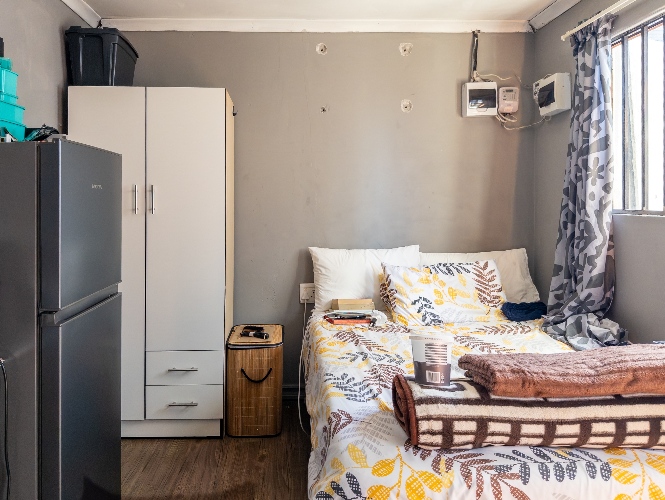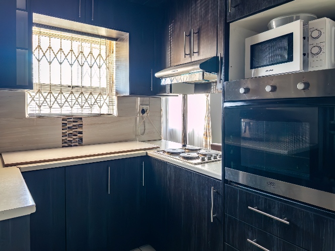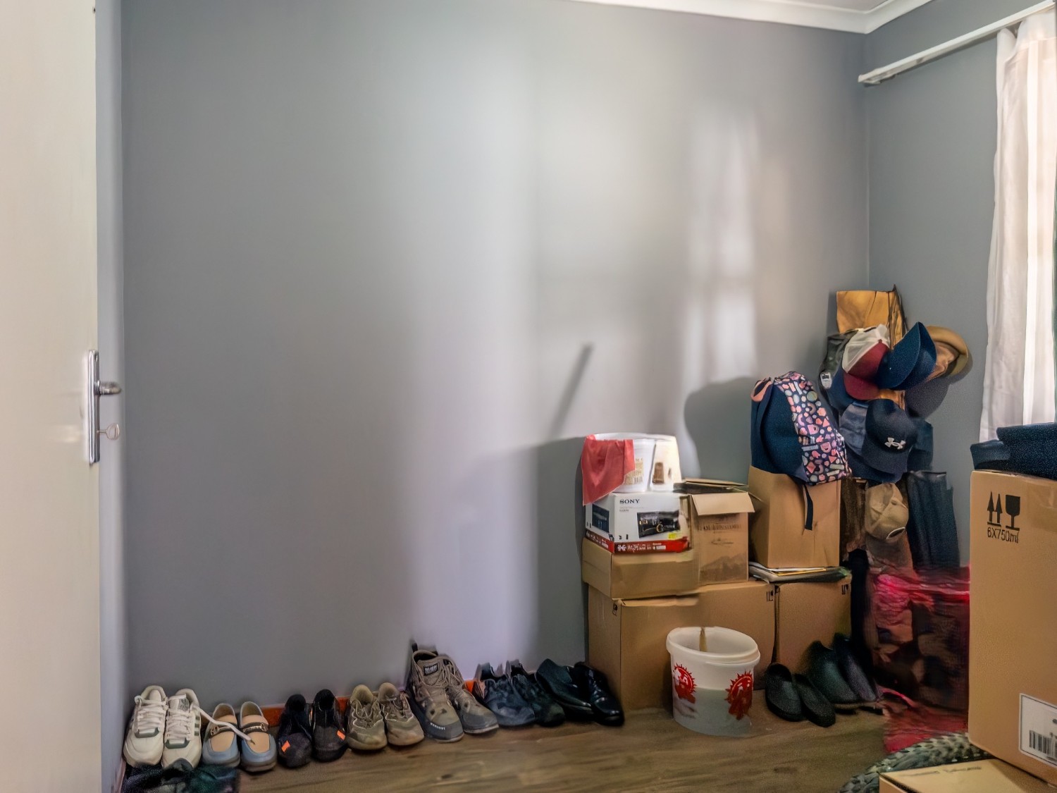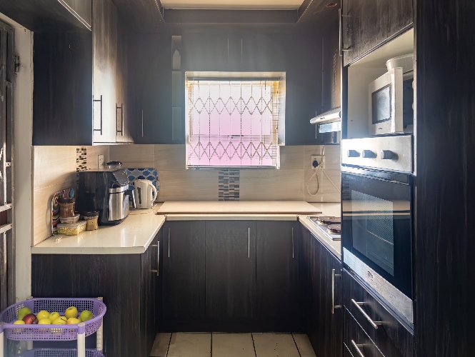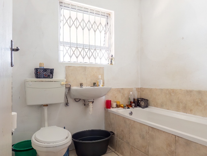 Three well-sized bedrooms are serviced by a bathroom equipped with a bath, toilet, and basin. The space is finished with tiled flooring throughout, while the bedrooms offer laminated floors, and aluminium windows ensure durability and low maintenance.