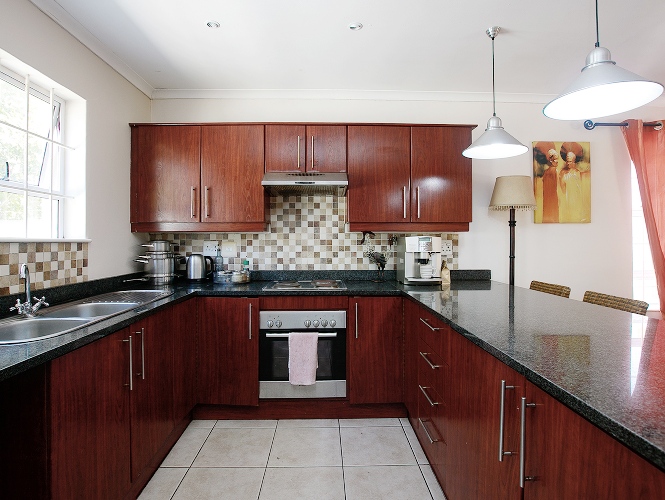 The open-plan tiled kitchen has lovely granite countertops with over-counter lighting, an electric oven, a hob and extractor, and is plumbed for both dishwasher and washing machine. The kitchen opens out onto the courtyard behind.
