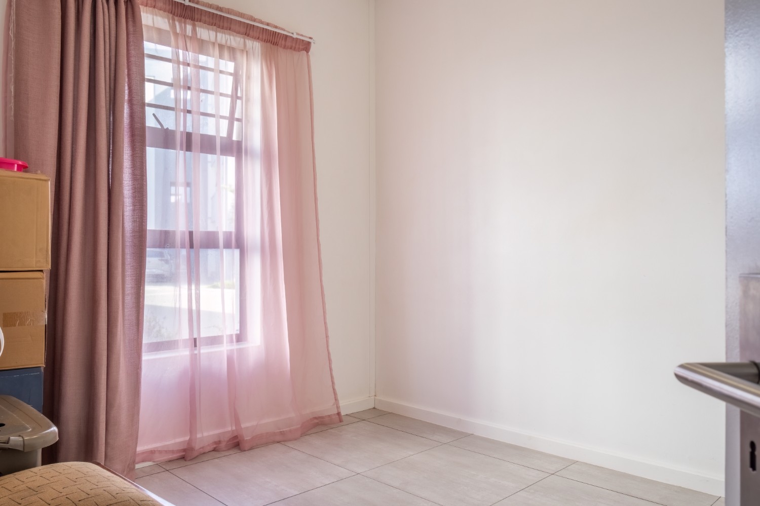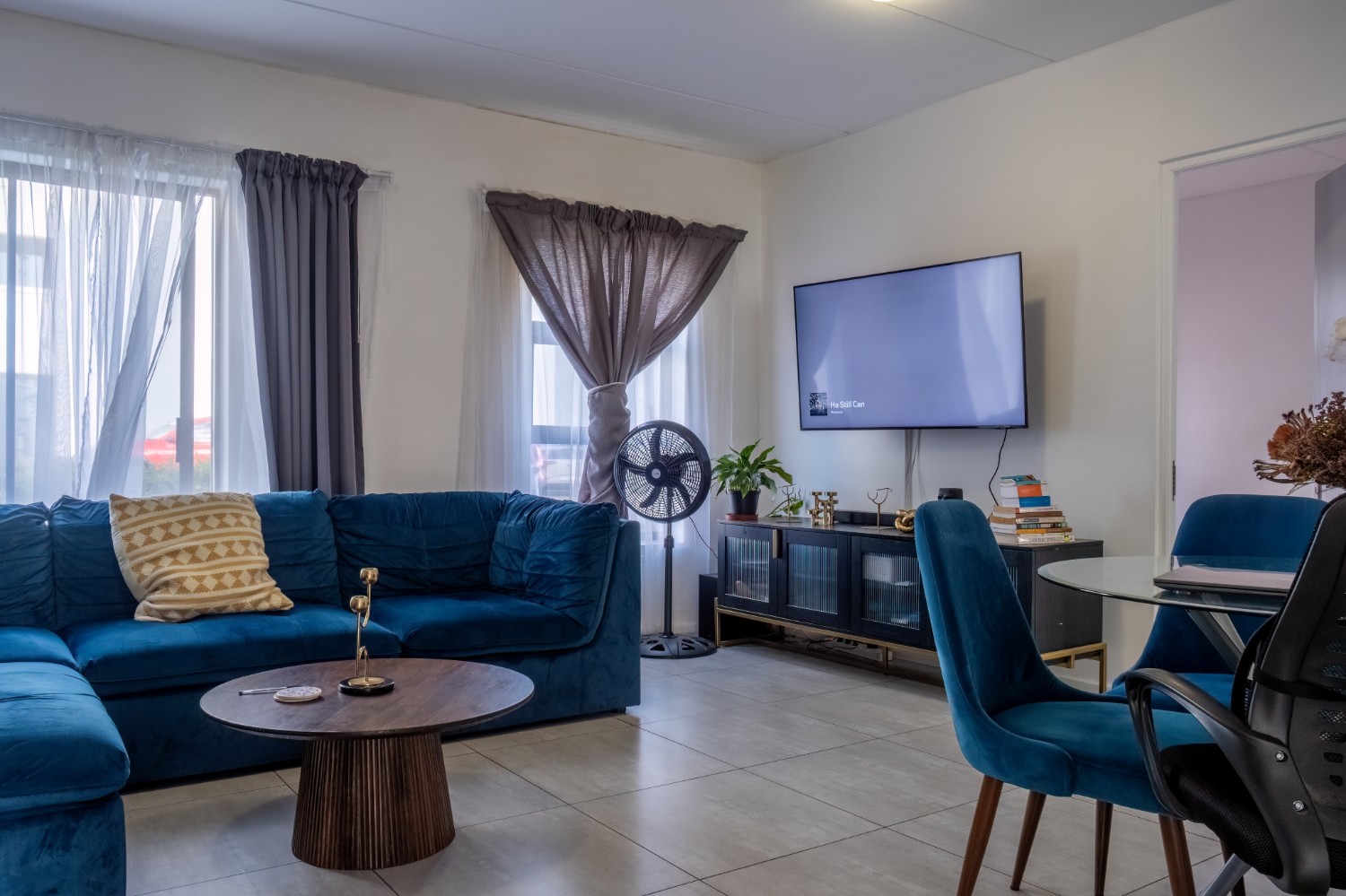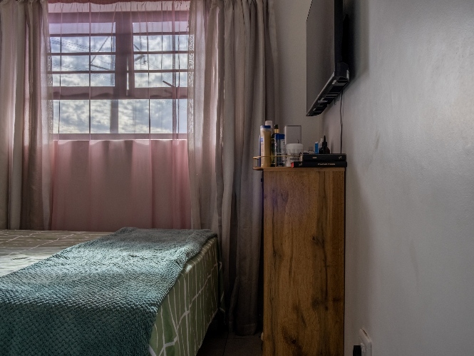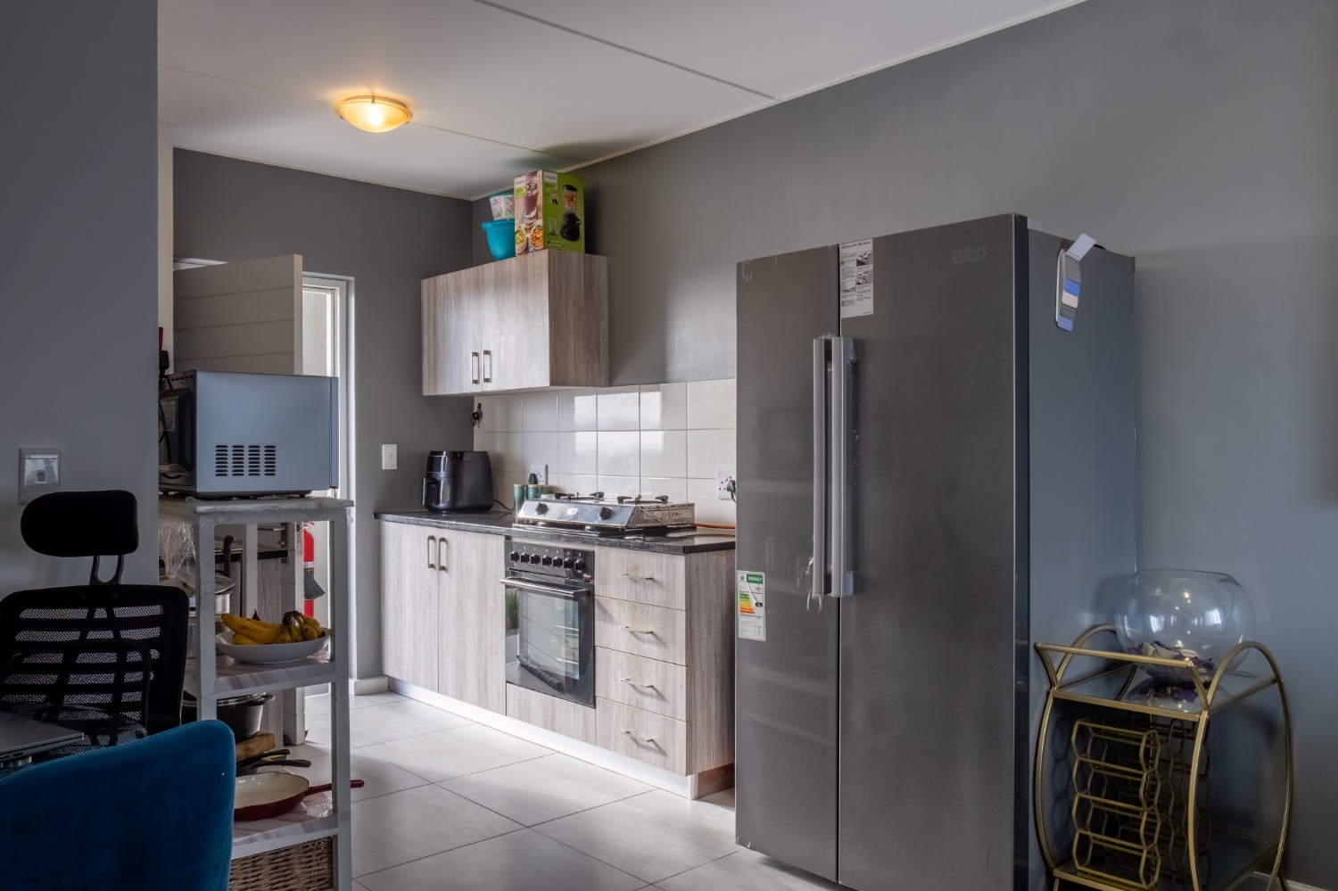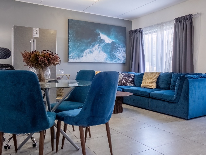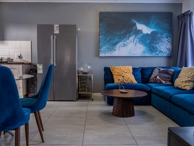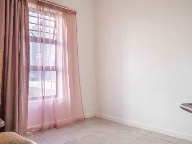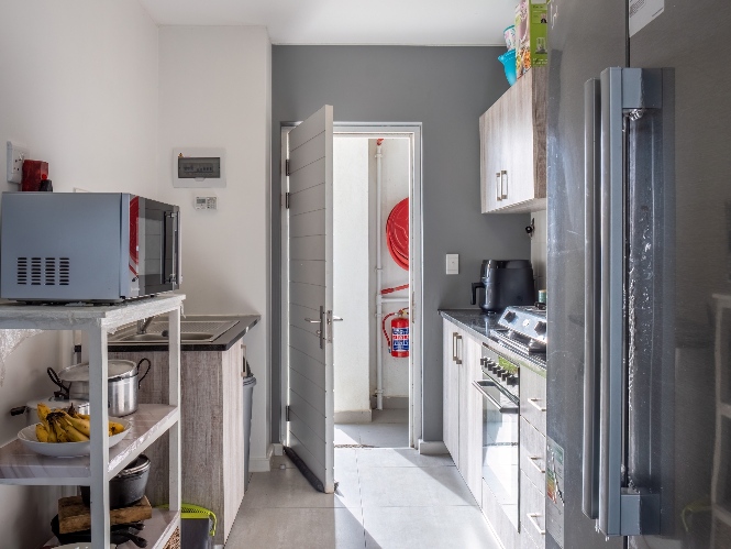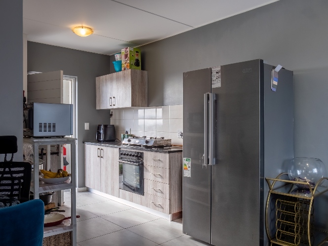 The lounge area is bright and welcoming, featuring tiled flooring and large windows that allow plenty of natural sunlight to fill the space, creating a warm and inviting atmosphere for everyday living and entertaining. The kitchen is well designed with built-in cupboards that provide ample storage space. It includes a fitted stove and oven, one plumbing point for an appliance, and space for a fridge, making it both practical and functional for daily use.