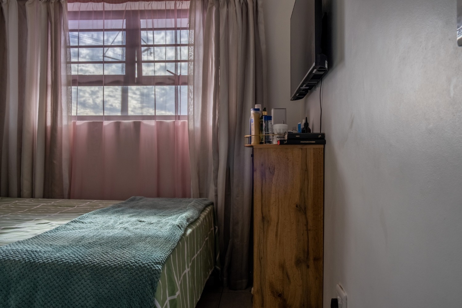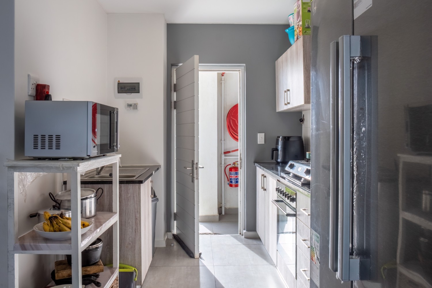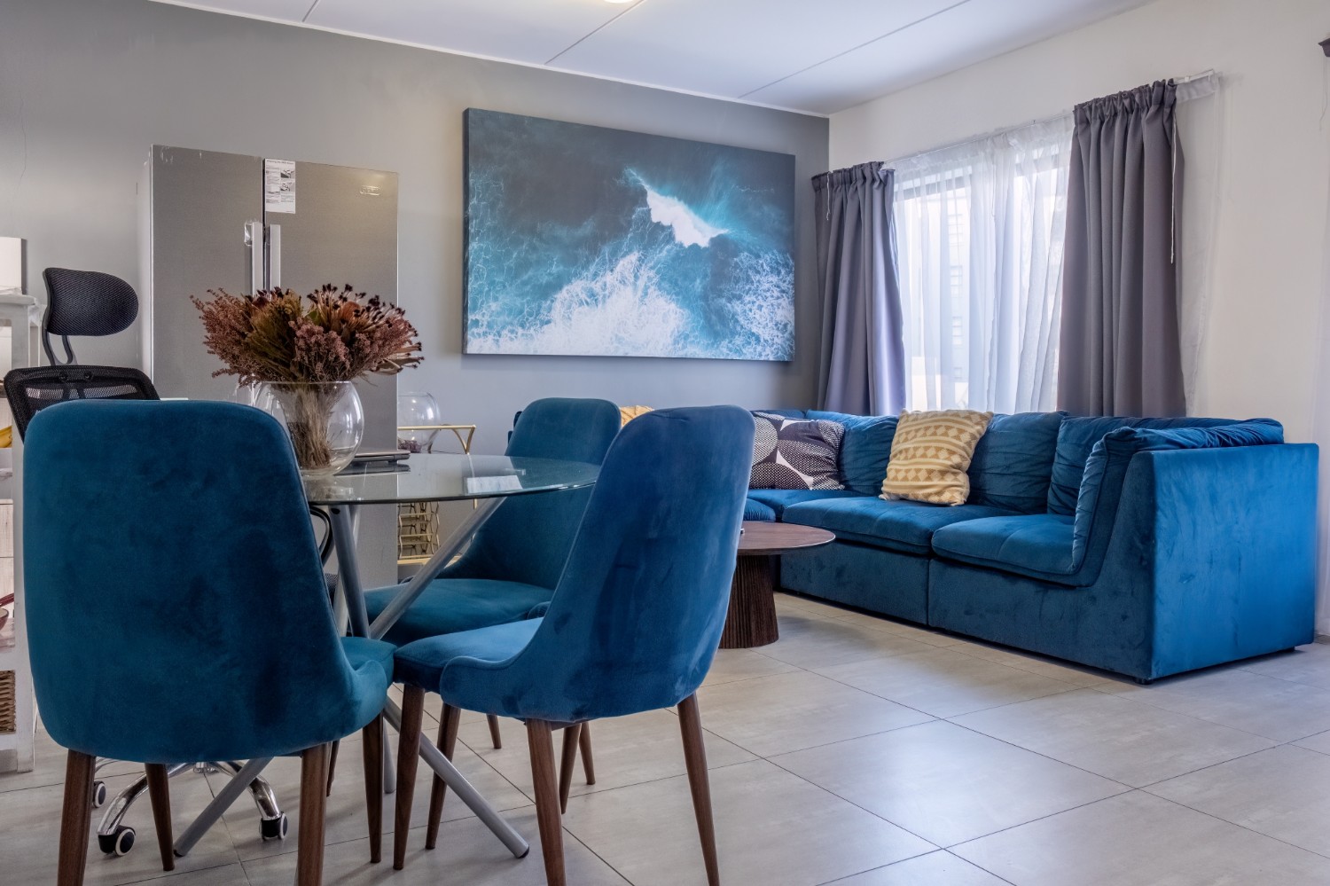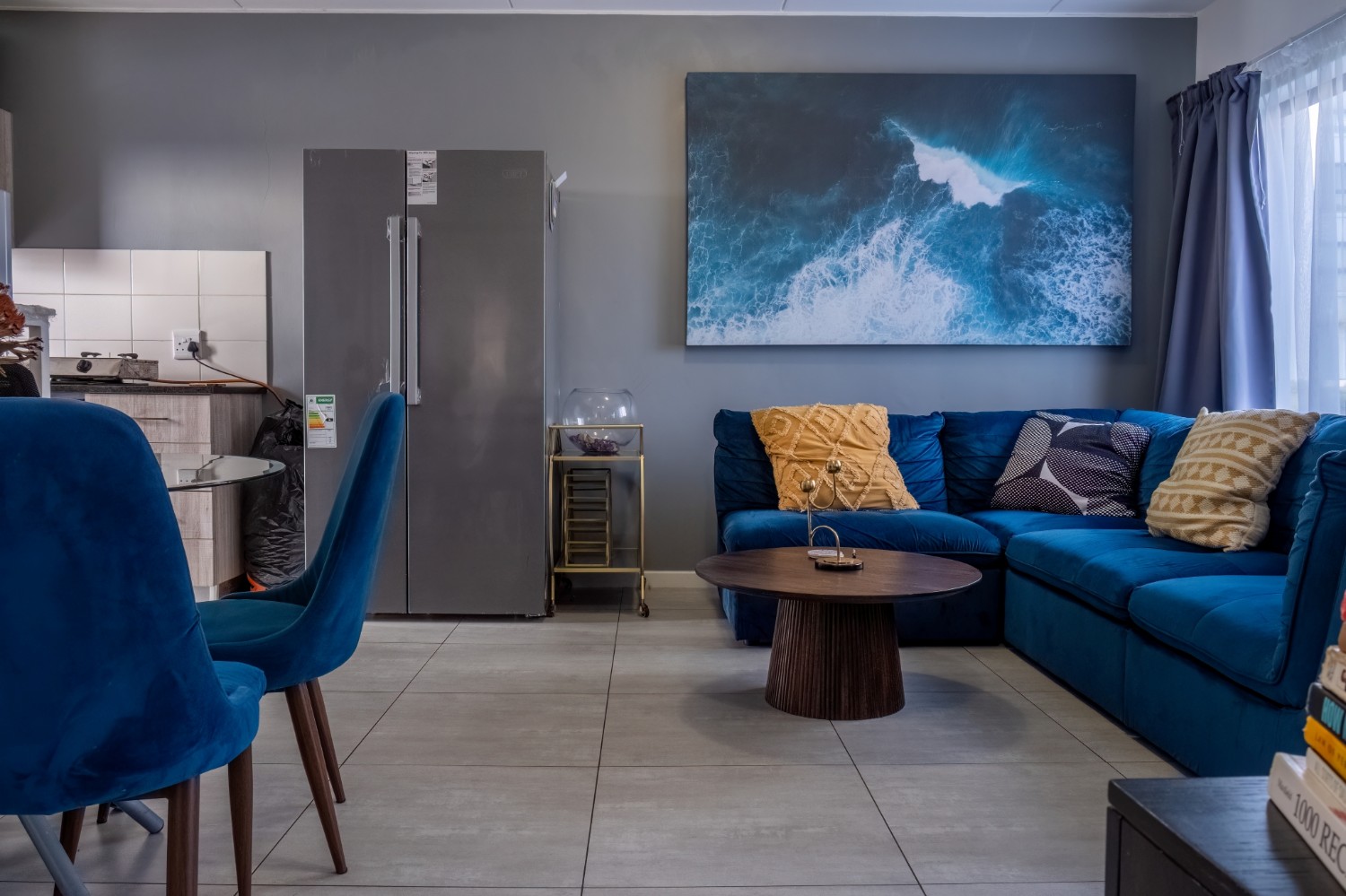 The lounge area is bright and welcoming, featuring tiled flooring and large windows that allow plenty of natural sunlight to fill the space, creating a warm and inviting atmosphere for everyday living and entertaining. The kitchen is well designed with built-in cupboards that provide ample storage space. It includes a fitted stove and oven, one plumbing point for an appliance, and space for a fridge, making it both practical and functional for daily use.