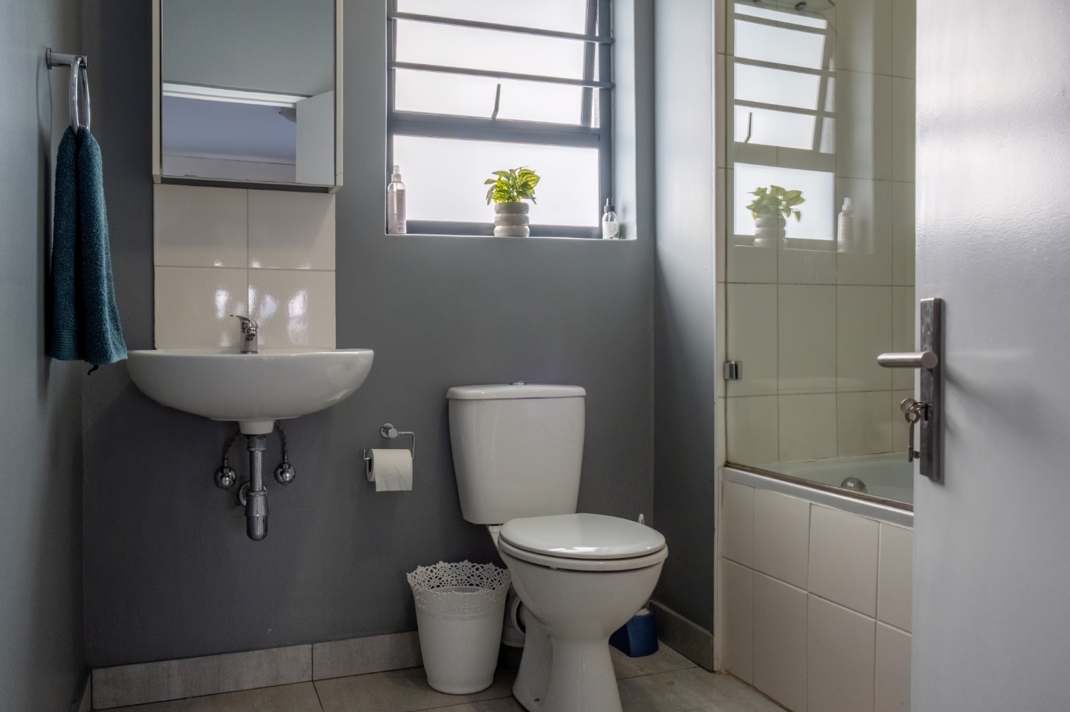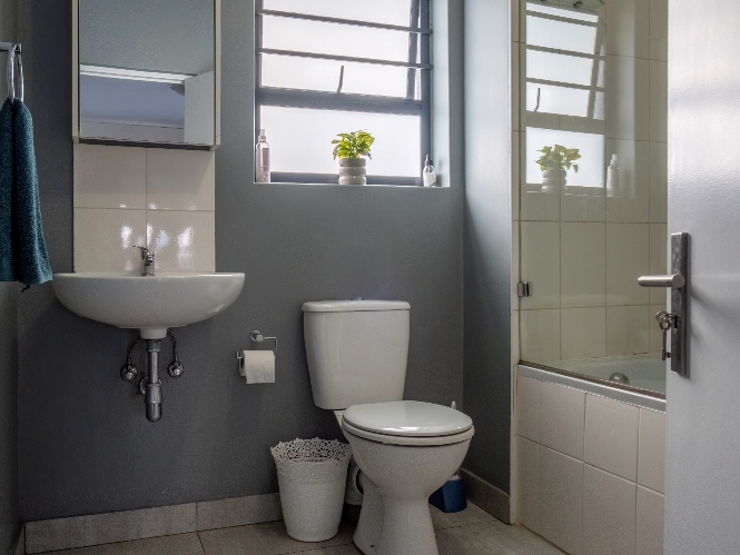 Both bedrooms offer tiled flooring and built-in cupboards, providing comfortable living spaces with convenient storage. The bathroom is equipped with a bathtub with an overhanging showerhead, a basin, and a toilet, offering everything needed for everyday convenience.