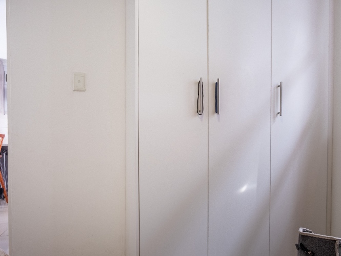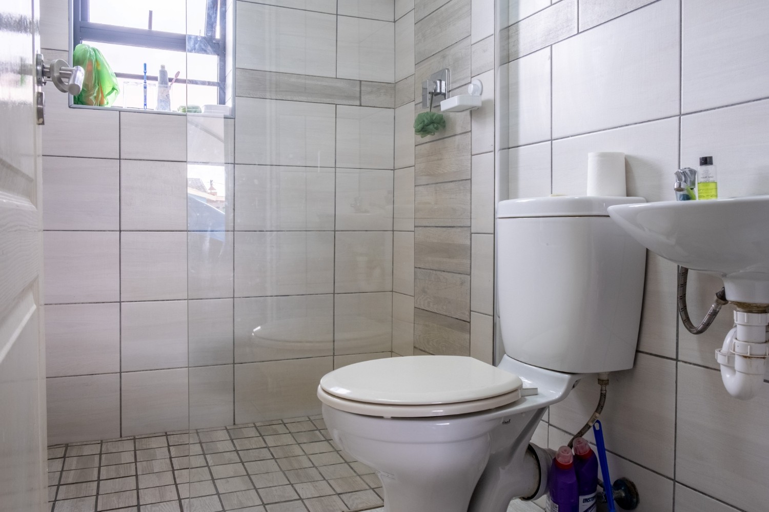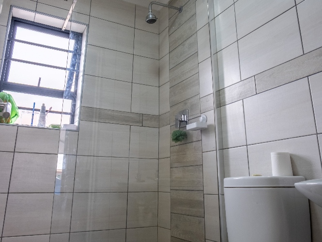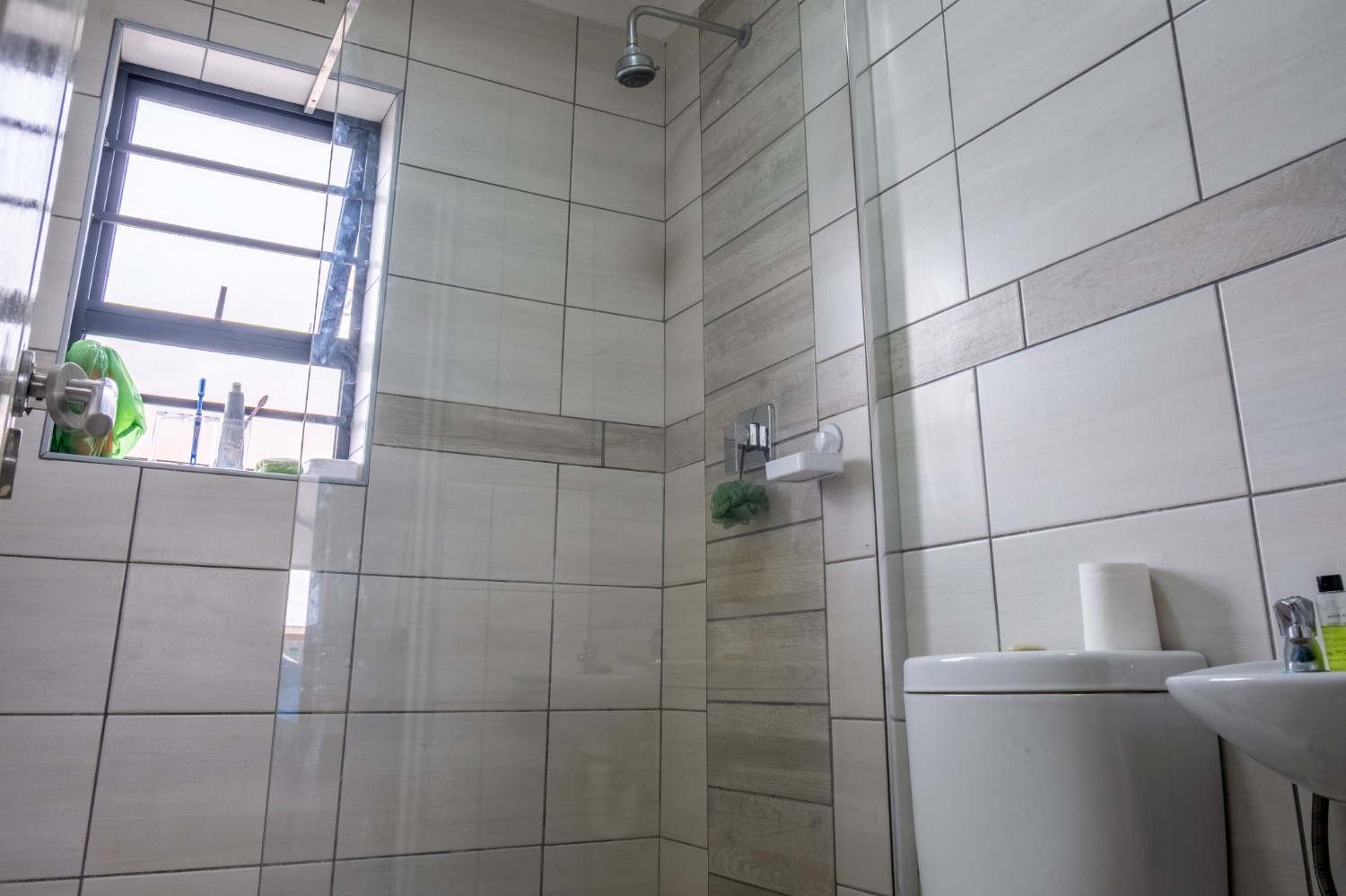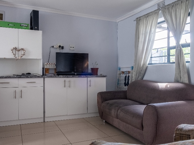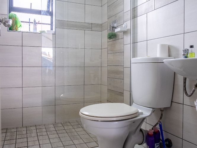 The home features two well-sized bedrooms, both fitted with built-in cupboards and enhanced by plenty of natural light. The tastefully tiled family bathroom is fitted with a shower, basin, and toilet, offering both functionality and a clean, modern finish.