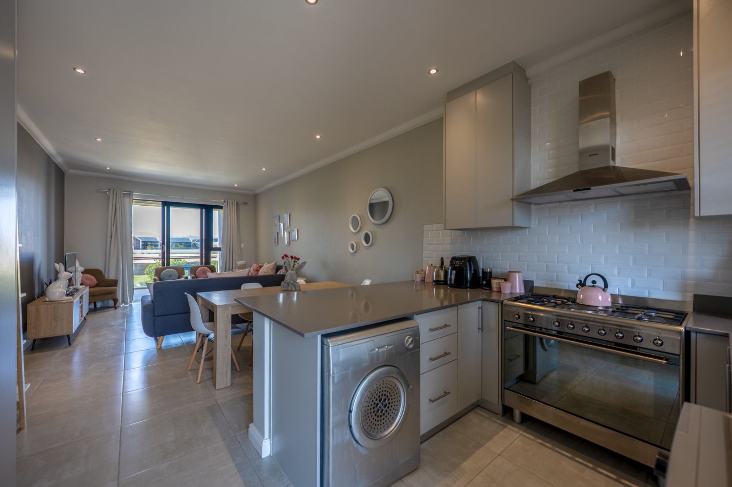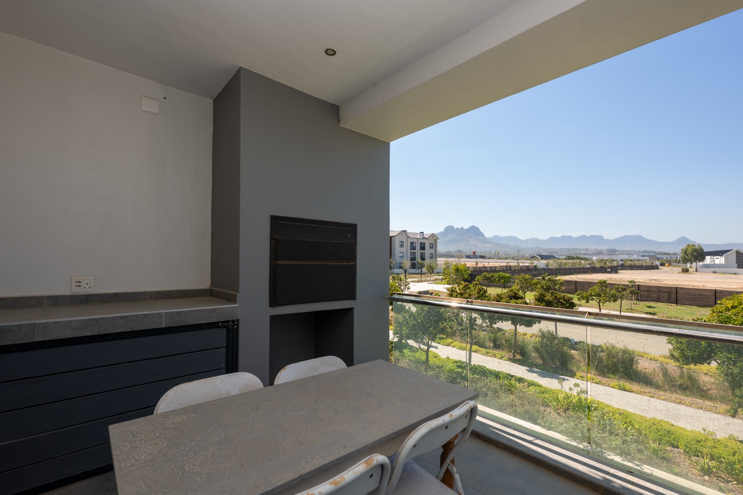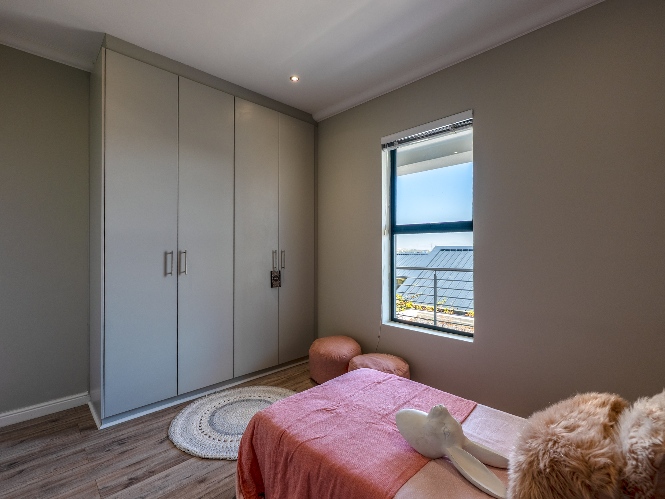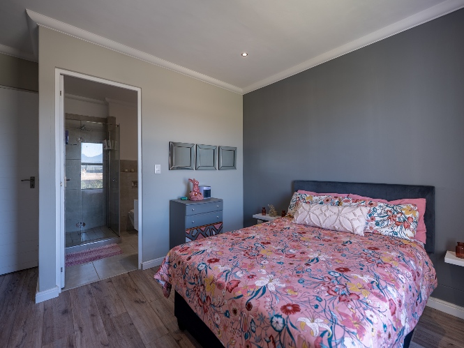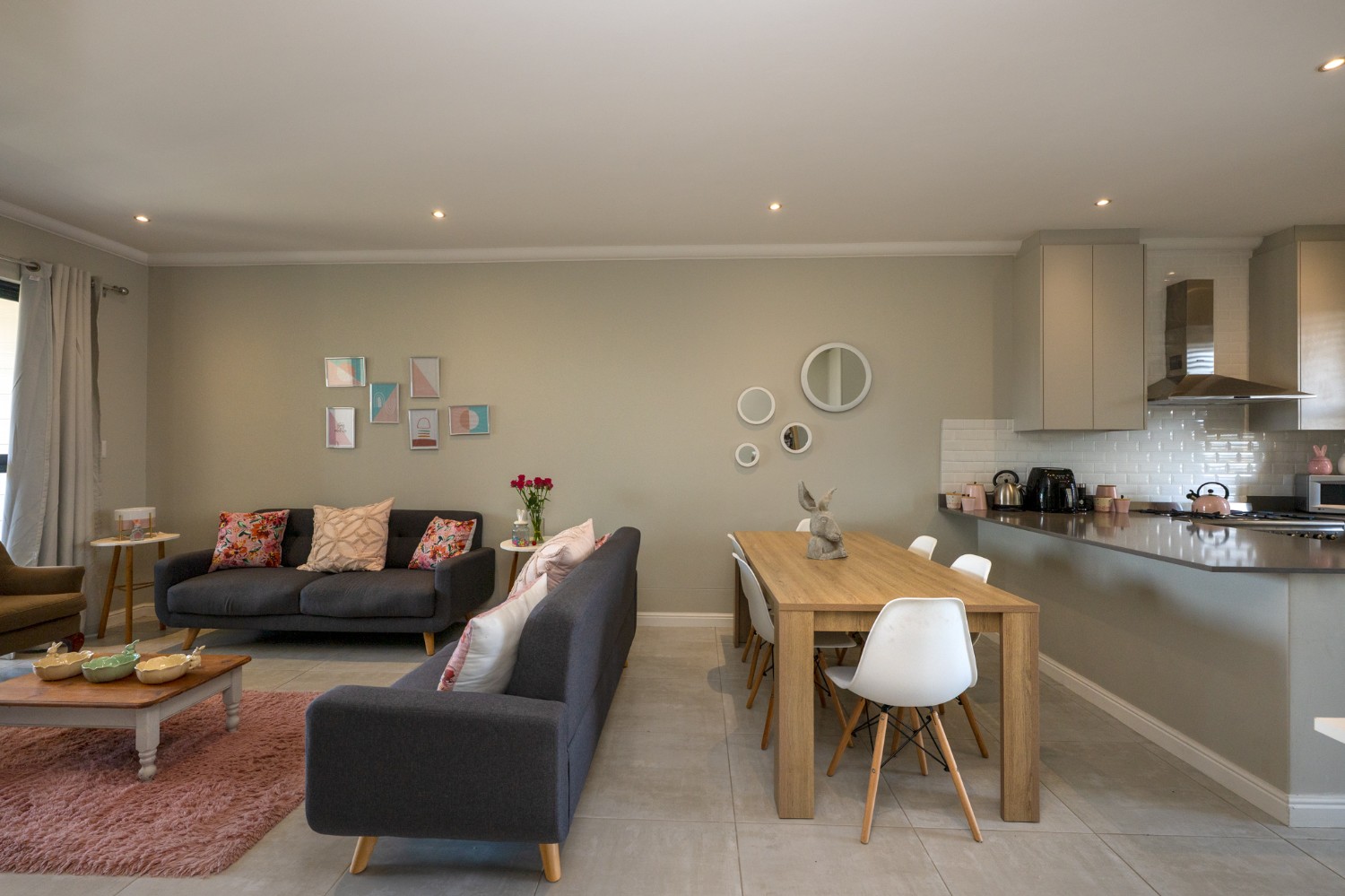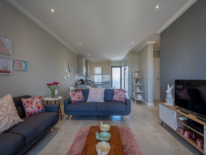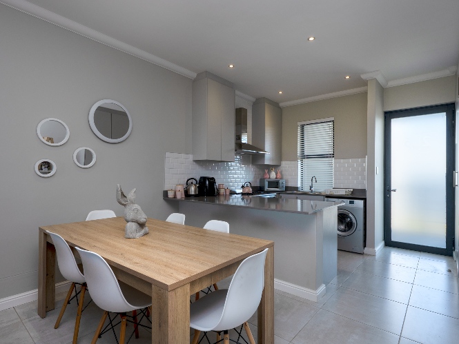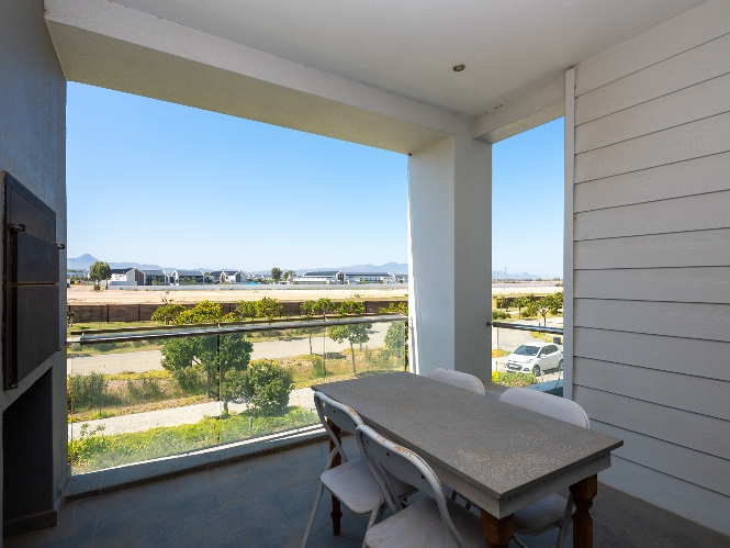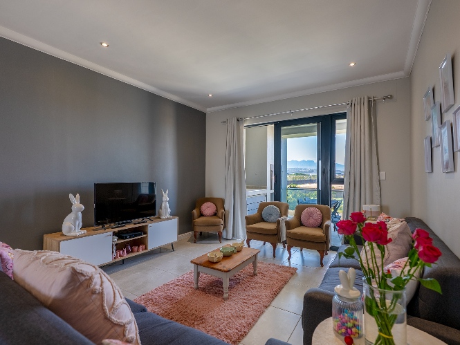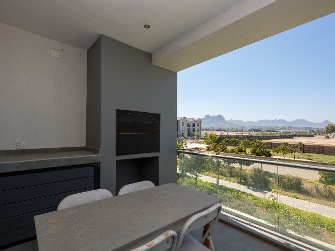 The home features downlights and blinds throughout and welcomes you into a spacious open-plan kitchen, dining and lounge area that flows effortlessly onto the balcony, which includes a built-in braai and enjoys beautiful mountain views — perfect for relaxed entertaining.