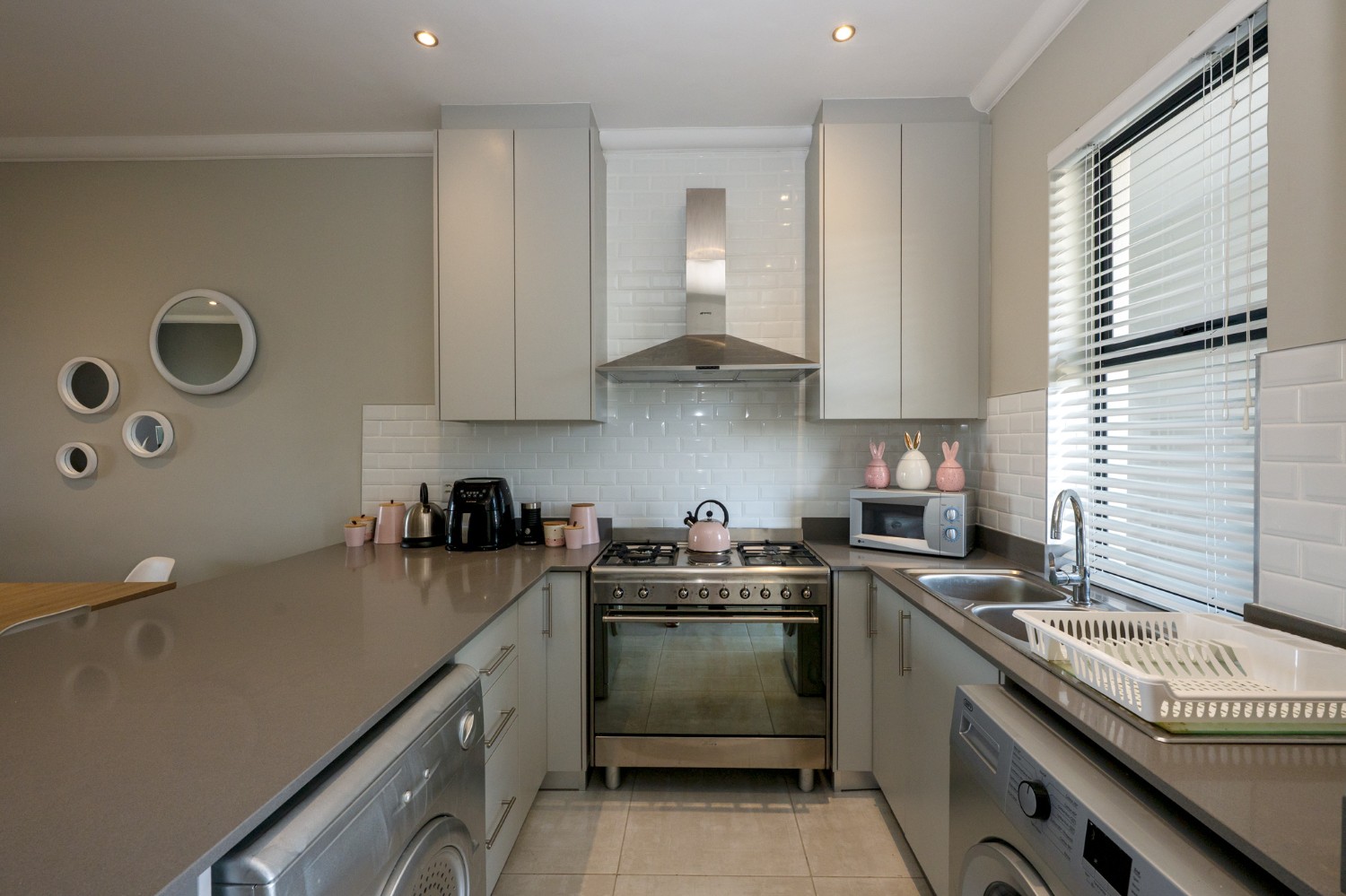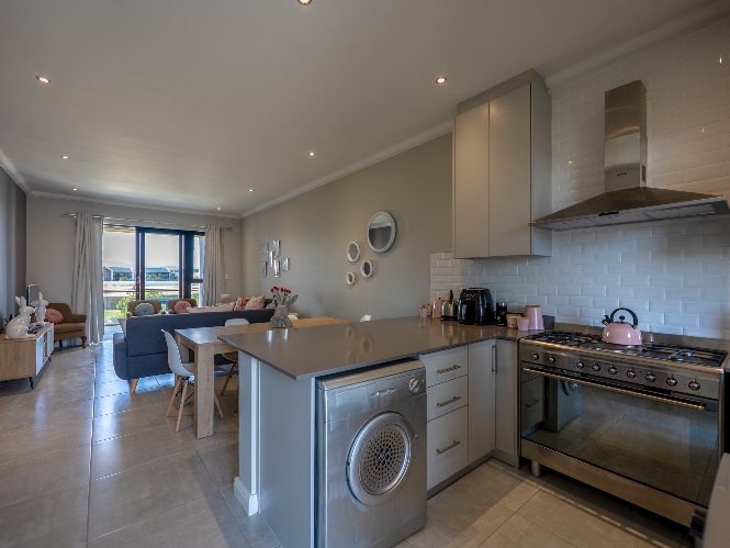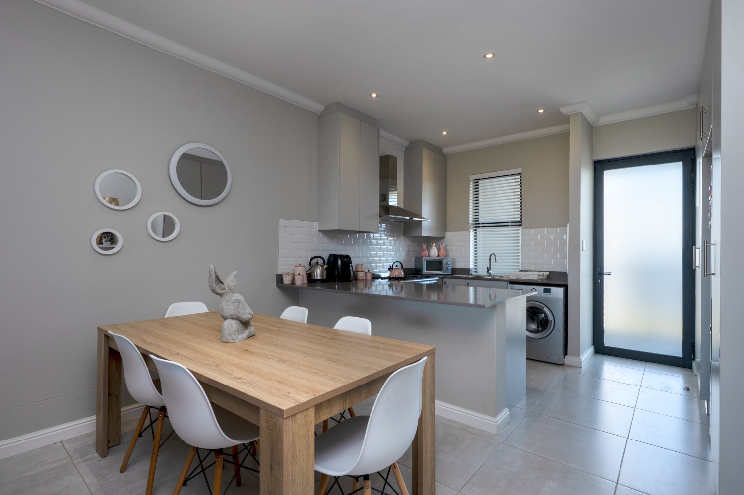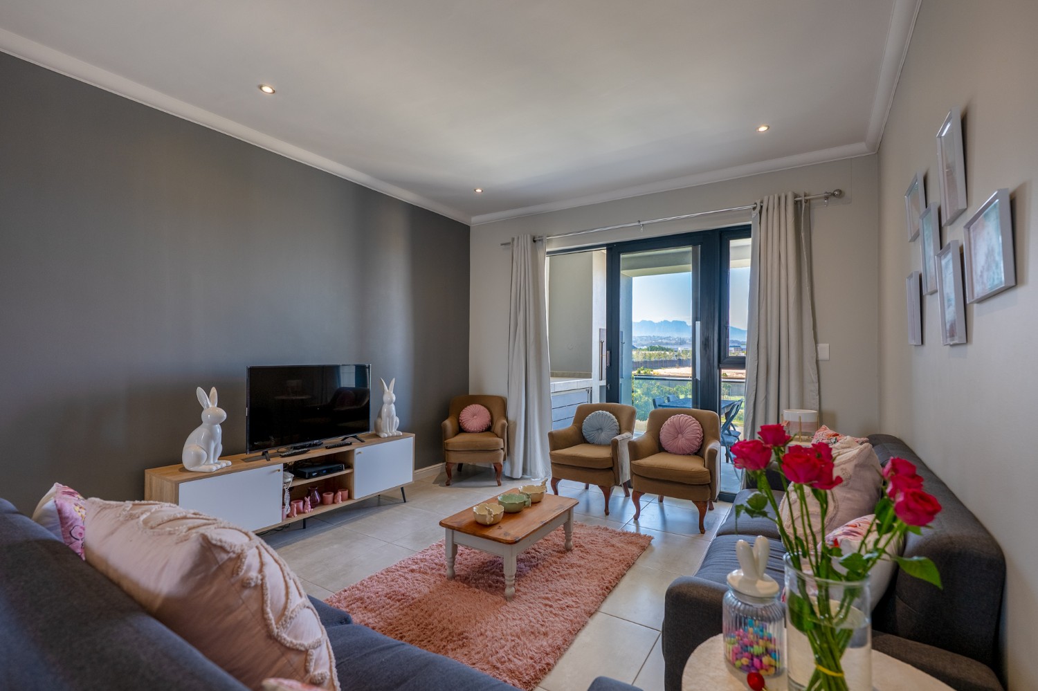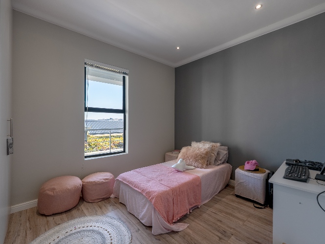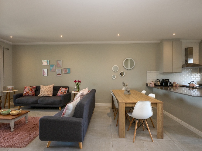 The home features downlights and blinds throughout and welcomes you into a spacious open-plan kitchen, dining and lounge area that flows effortlessly onto the balcony, which includes a built-in braai and enjoys beautiful mountain views — perfect for relaxed entertaining.