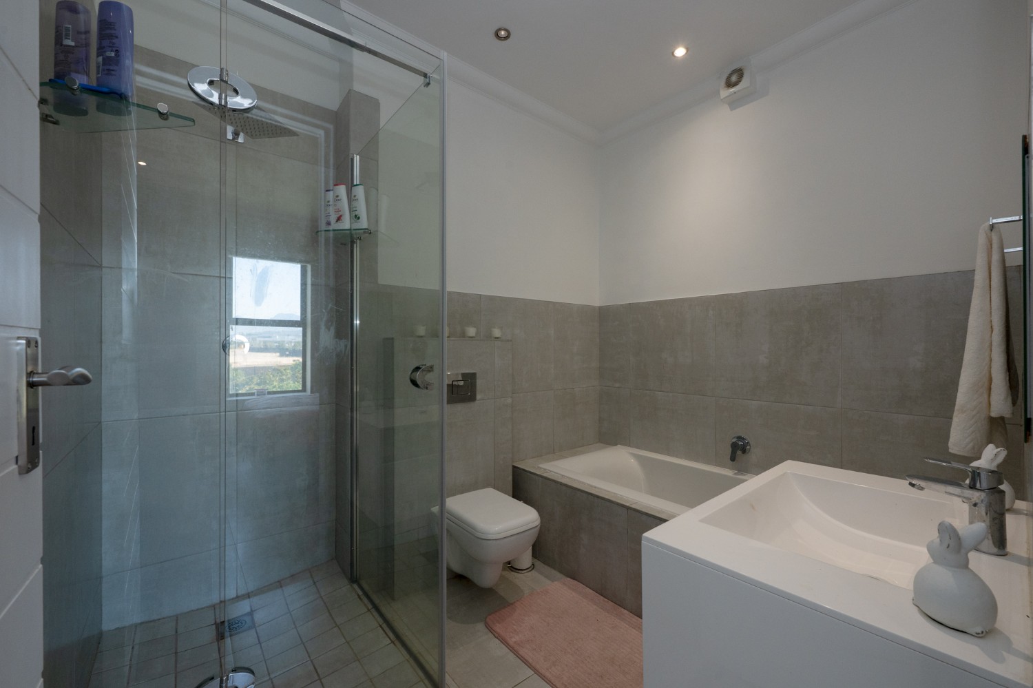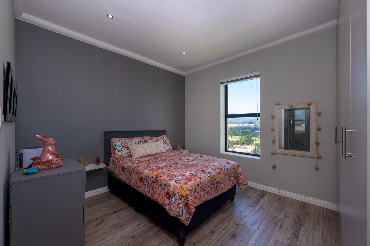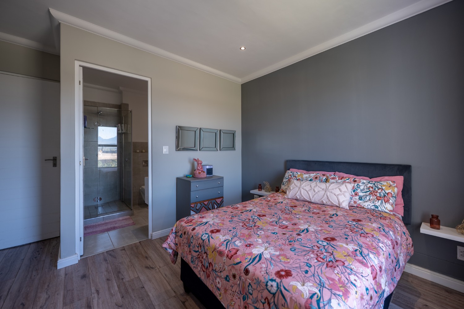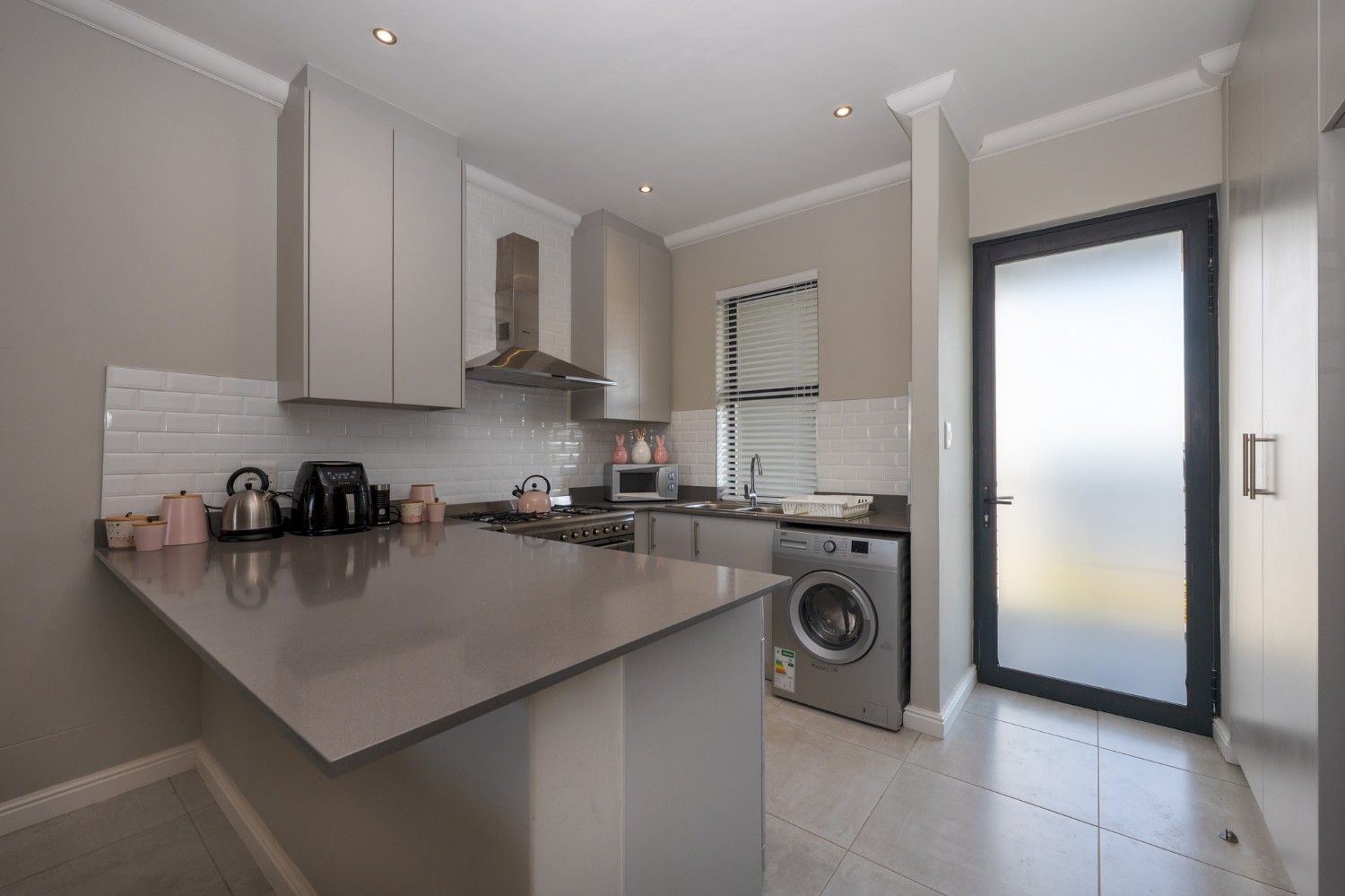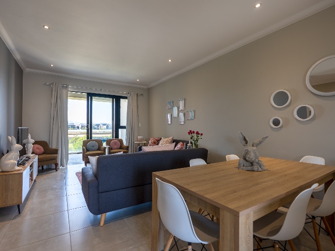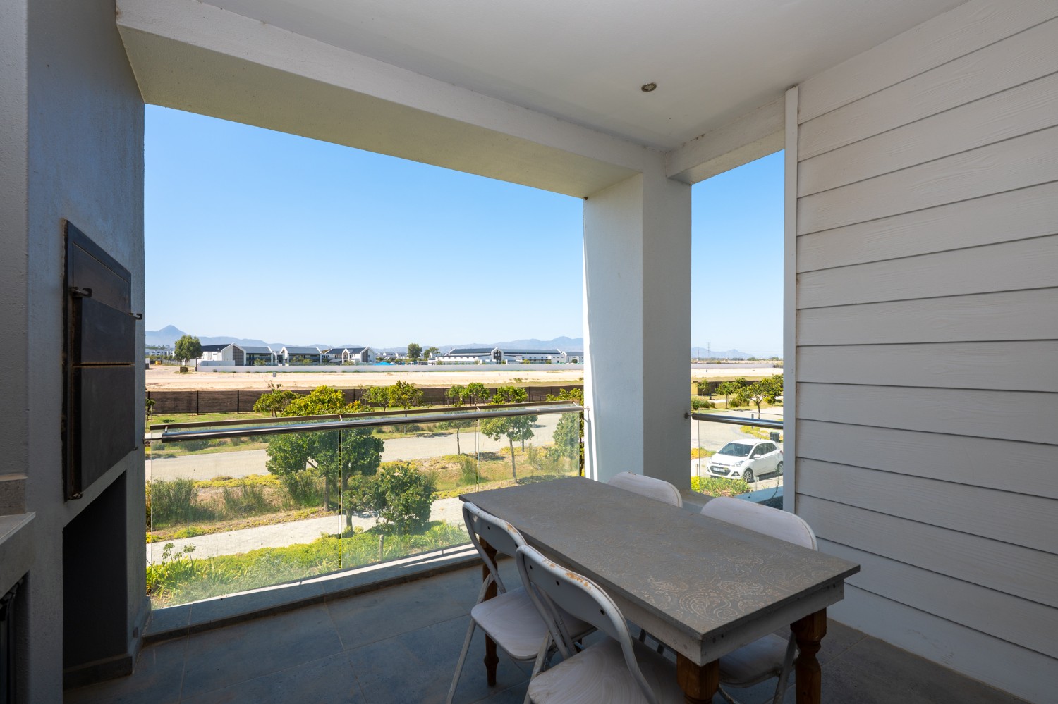 The home features downlights and blinds throughout and welcomes you into a spacious open-plan kitchen, dining and lounge area that flows effortlessly onto the balcony, which includes a built-in braai and enjoys beautiful mountain views — perfect for relaxed entertaining.