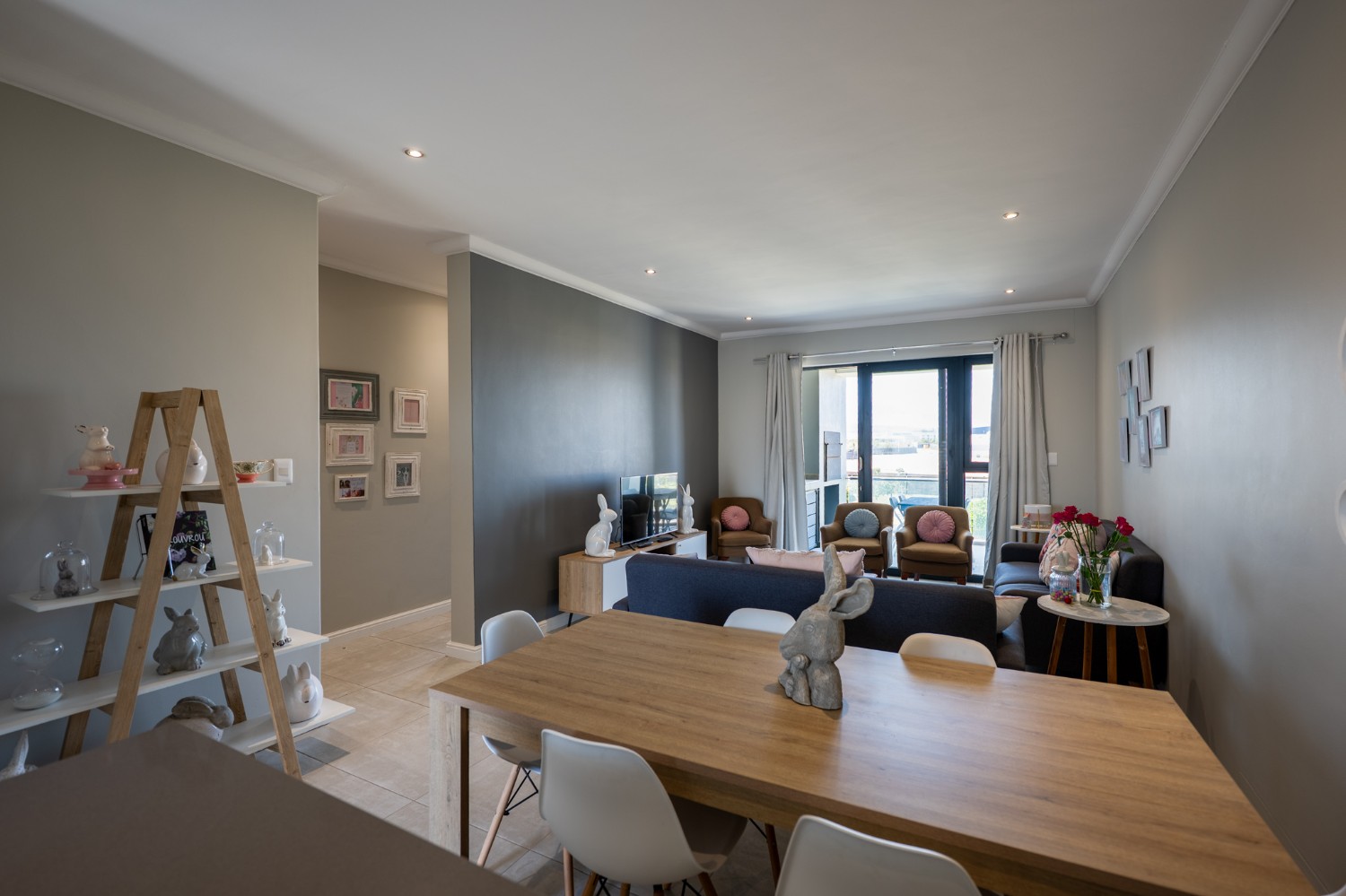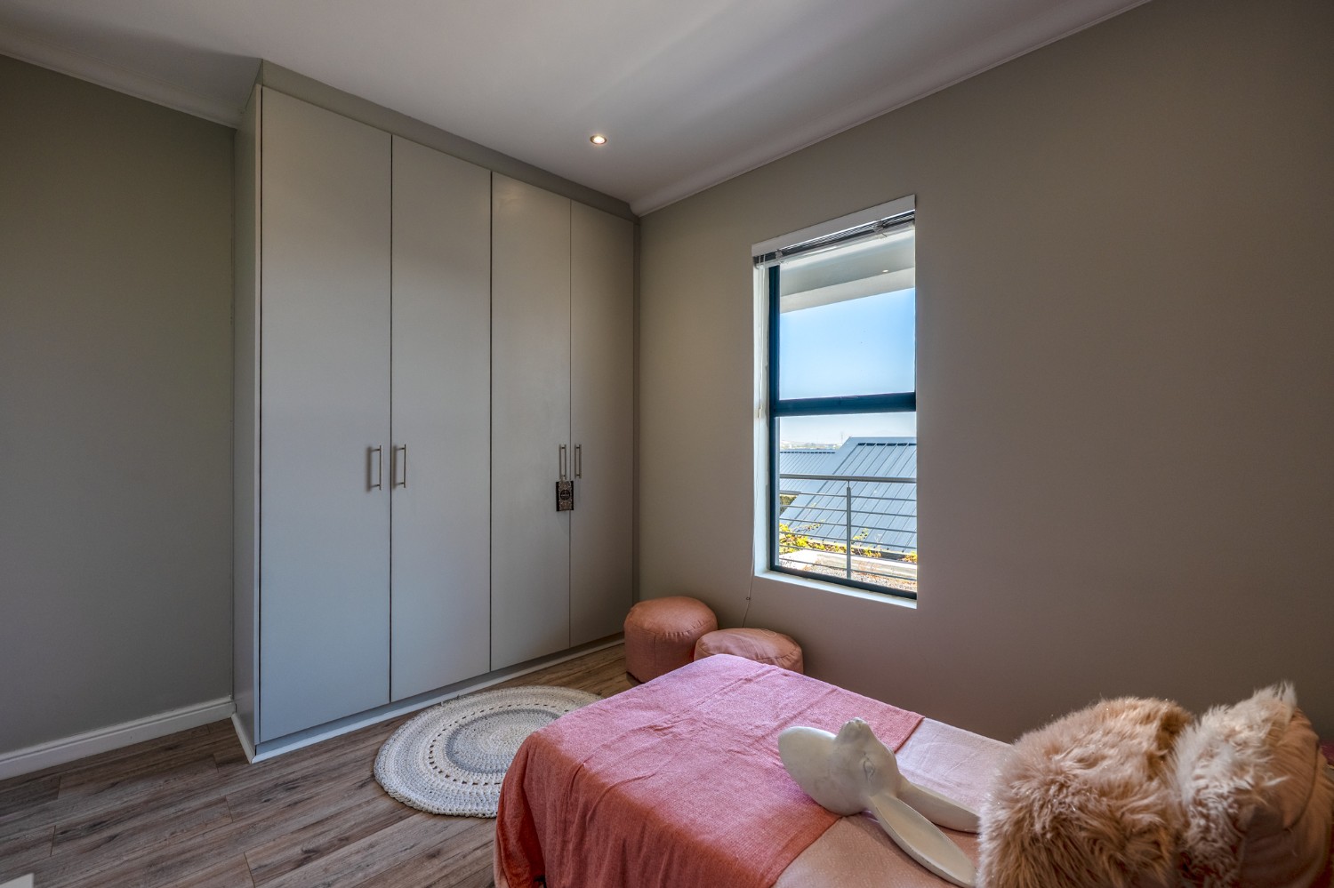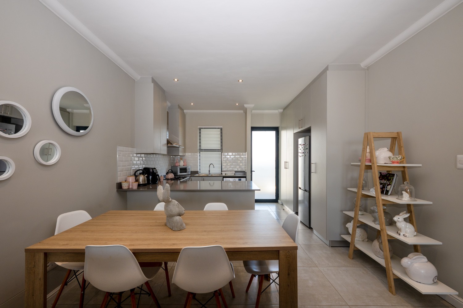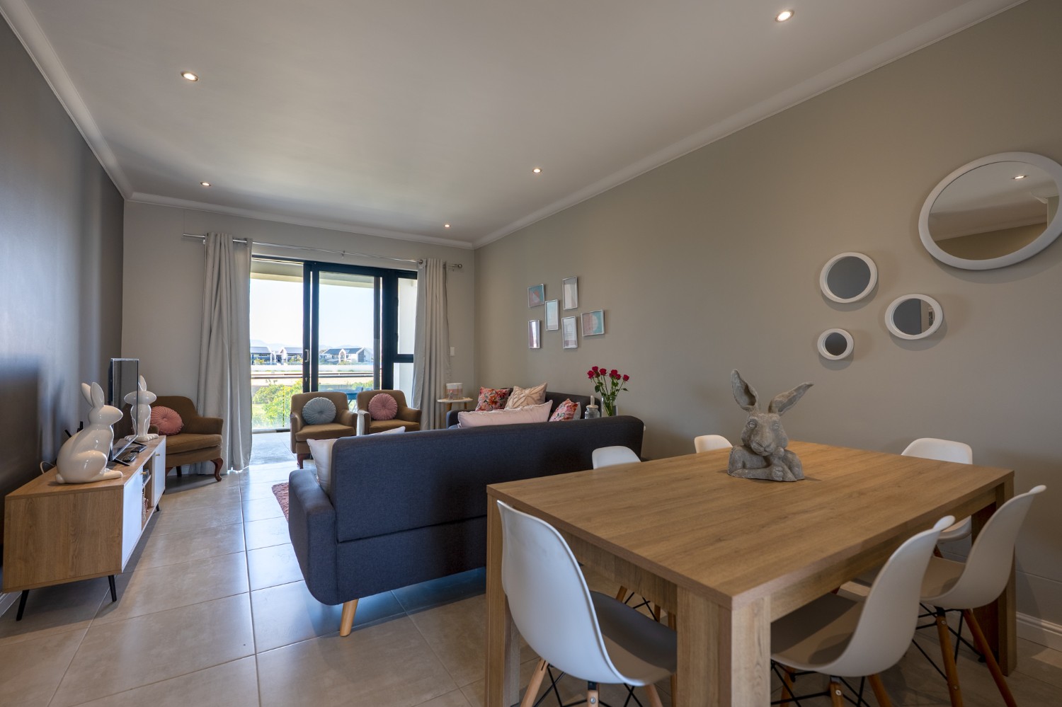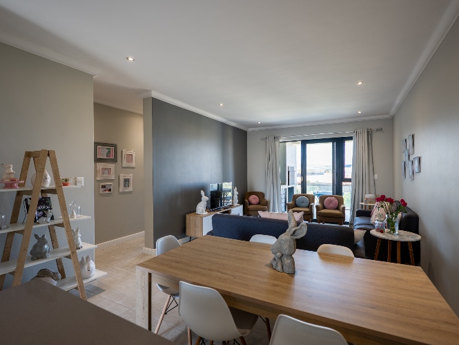 The home features downlights and blinds throughout and welcomes you into a spacious open-plan kitchen, dining and lounge area that flows effortlessly onto the balcony, which includes a built-in braai and enjoys beautiful mountain views — perfect for relaxed entertaining.