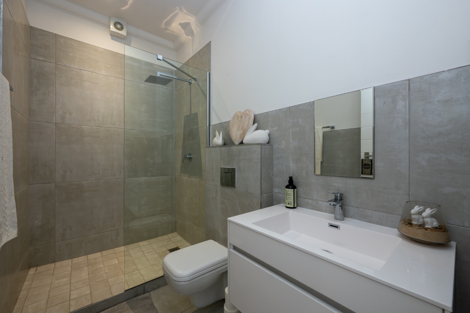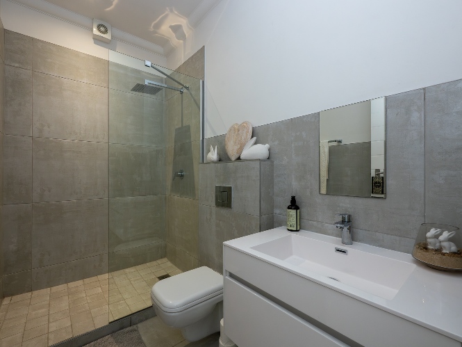 The main bedroom includes built-in bedside tables and a modern full en-suite bathroom with a large shower. The family bathroom also features a generous double-volume shower.