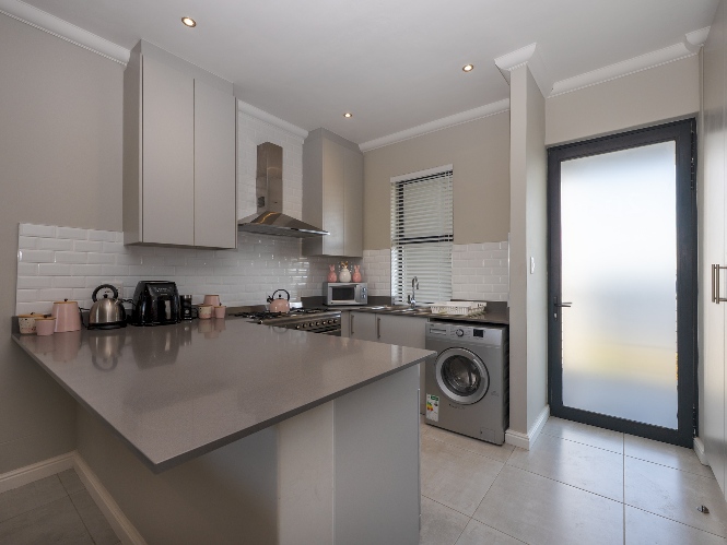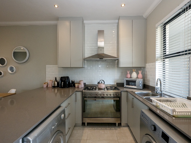 The well-designed kitchen is fitted with a 6-plate stove (4 gas and 2 solid plates), a double sink, one water point and space for a double fridge. Additional storage is provided by a broom cupboard and two pantry cupboards.