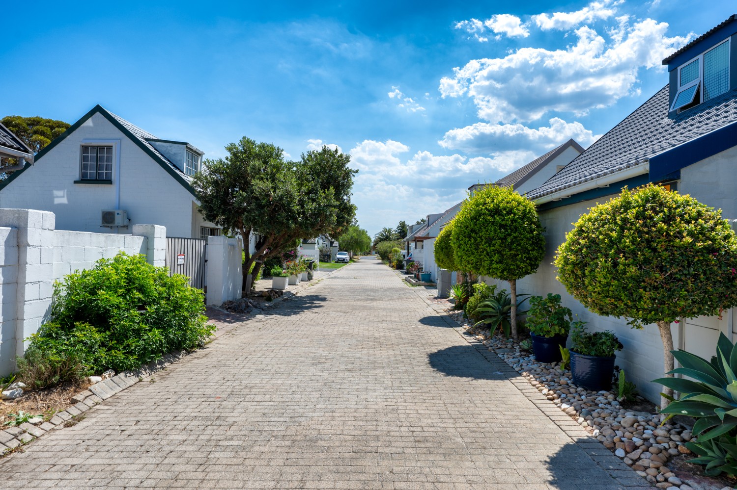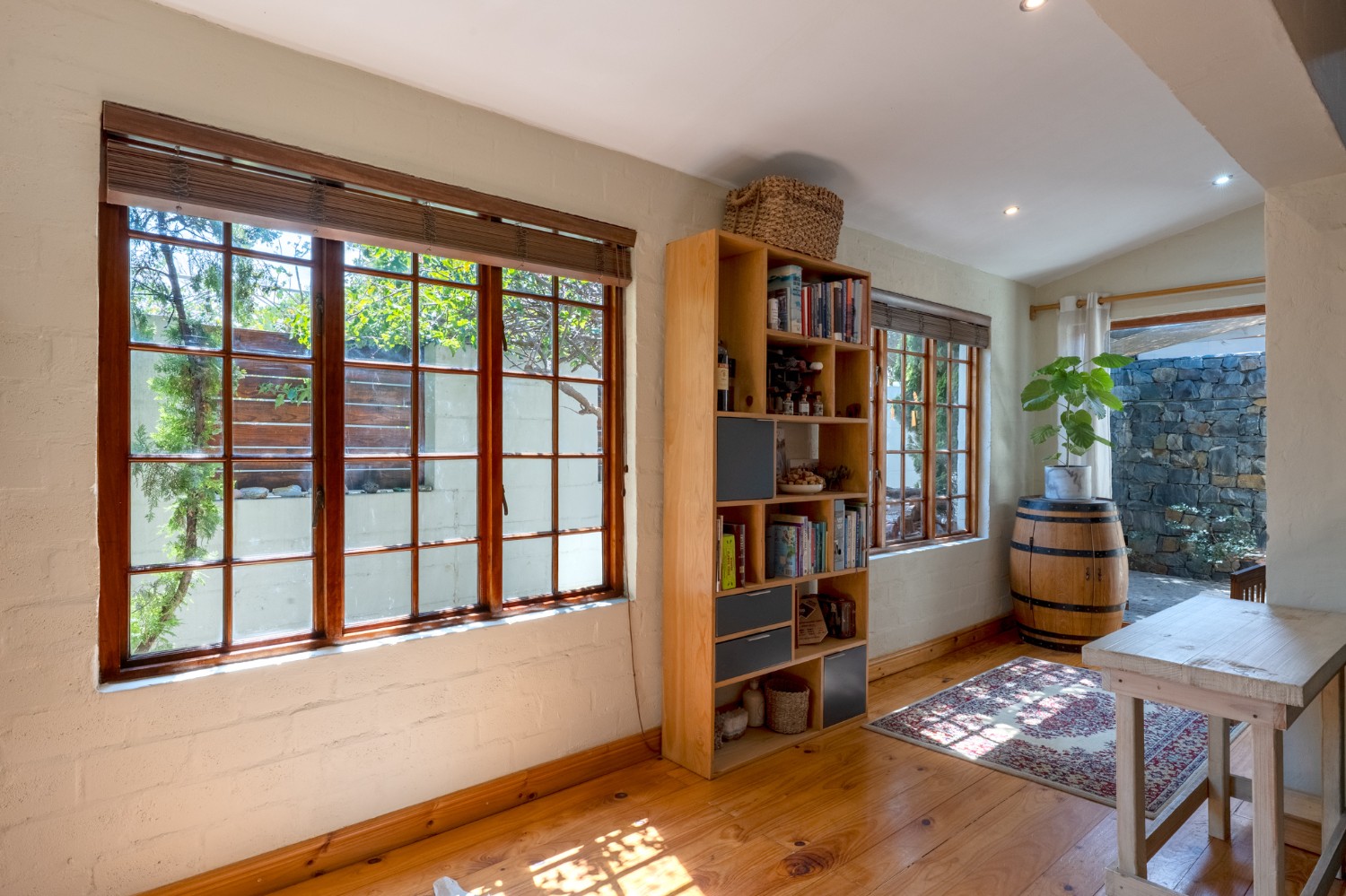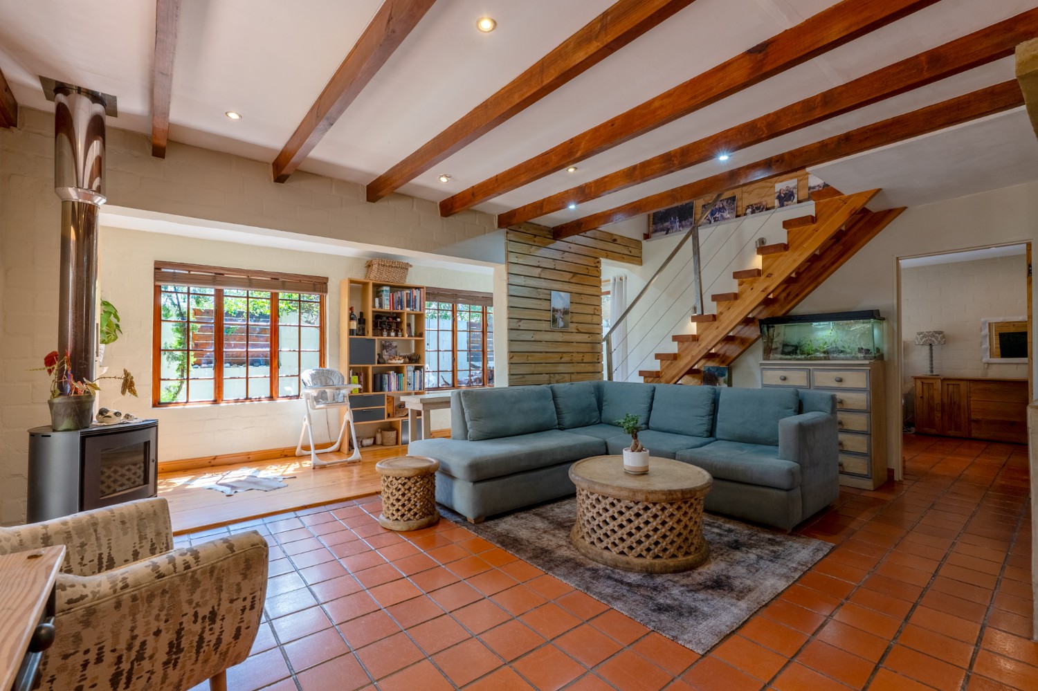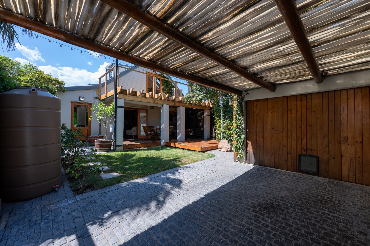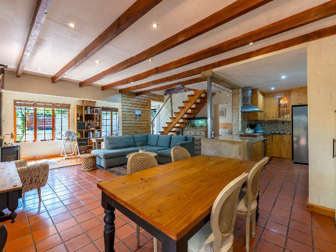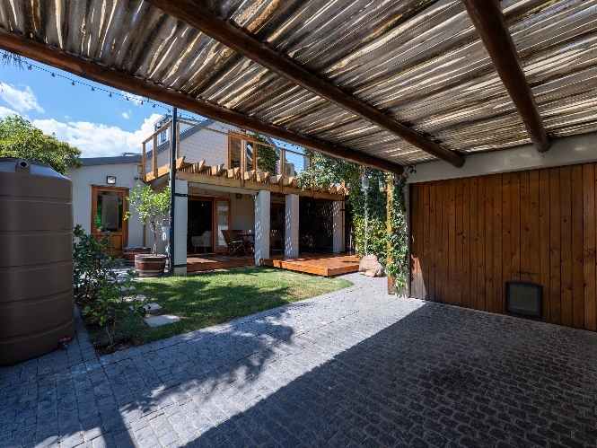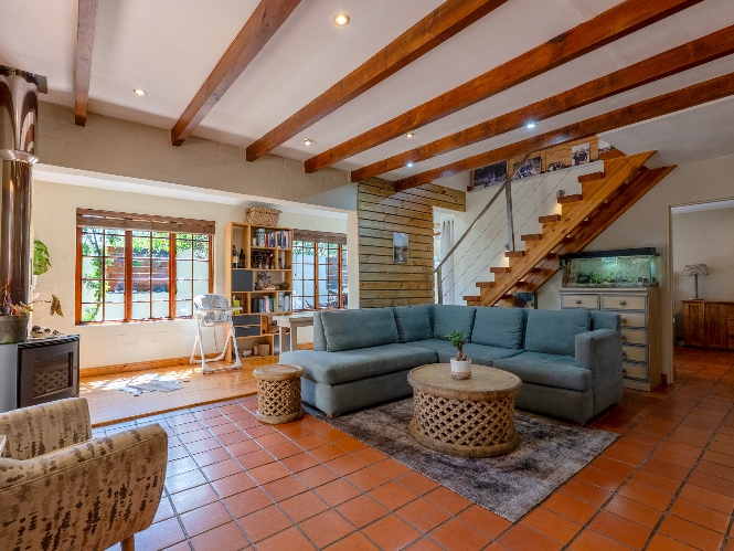 The home features a single garage with additional secure parking, and a lush yet low-maintenance garden complete with a borehole, irrigation system, two JoJo tanks, and a pressure pump.