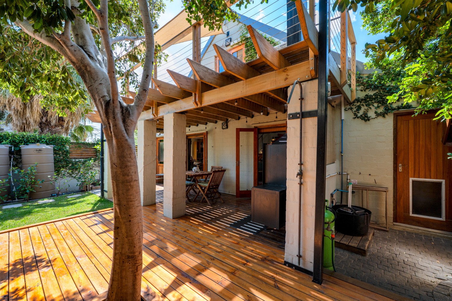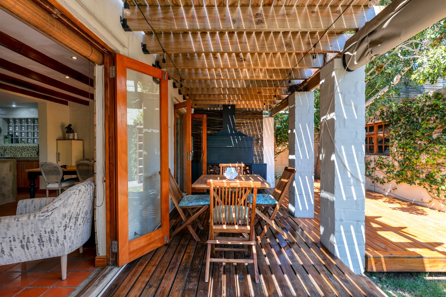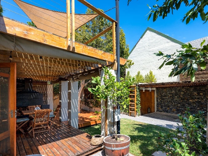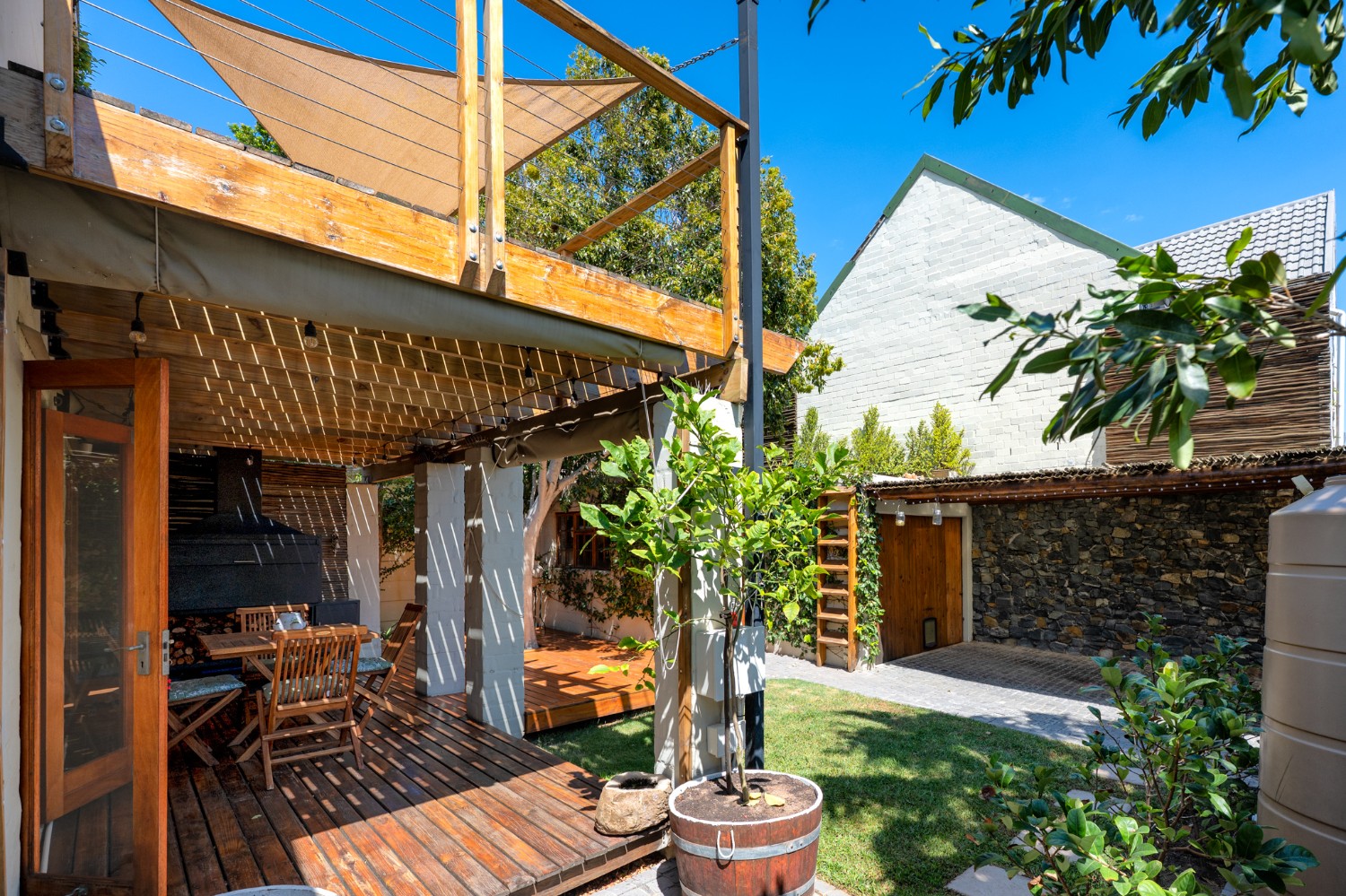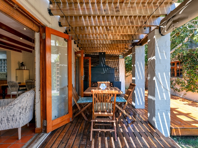 A beautiful wooden deck entertainment area with built-in braai overlooks the garden — perfect for relaxed outdoor living.