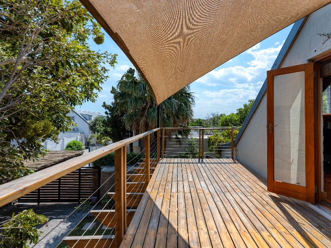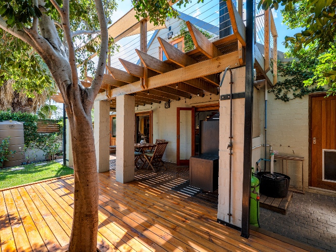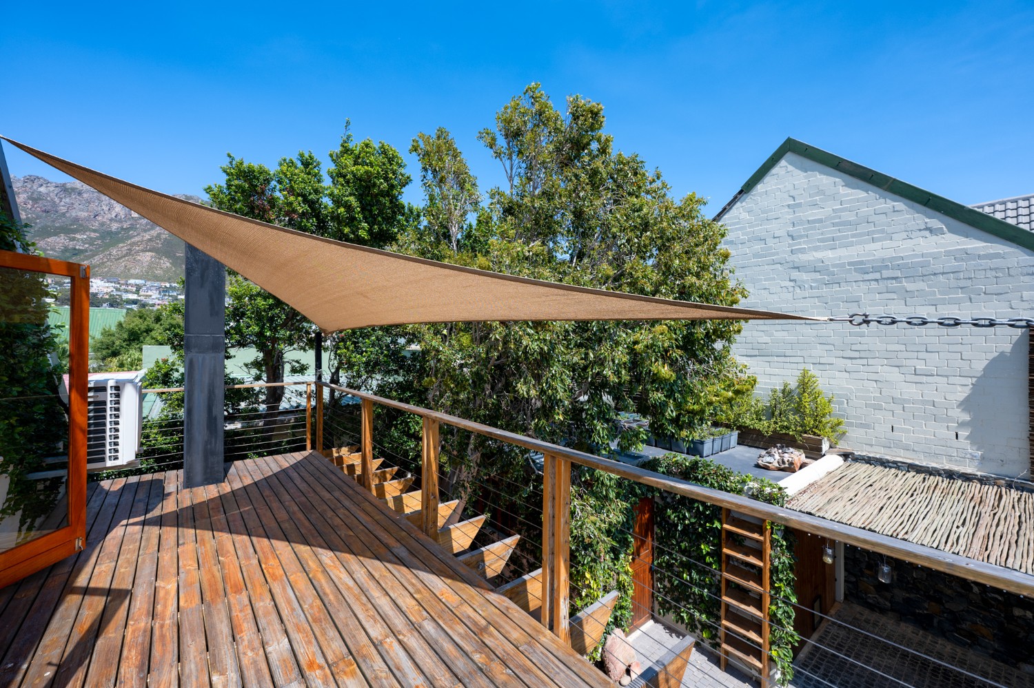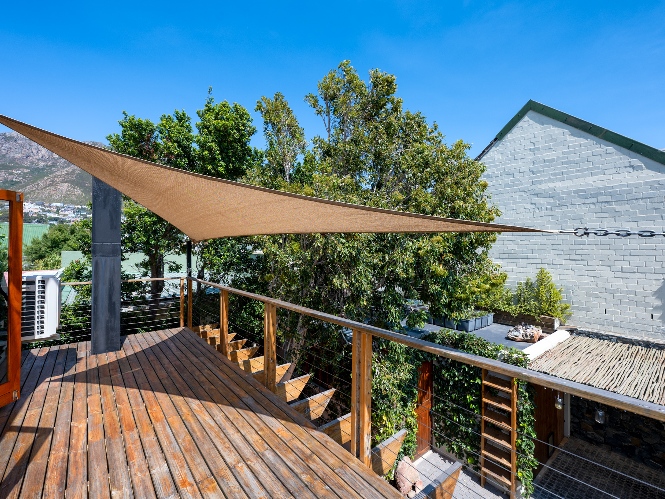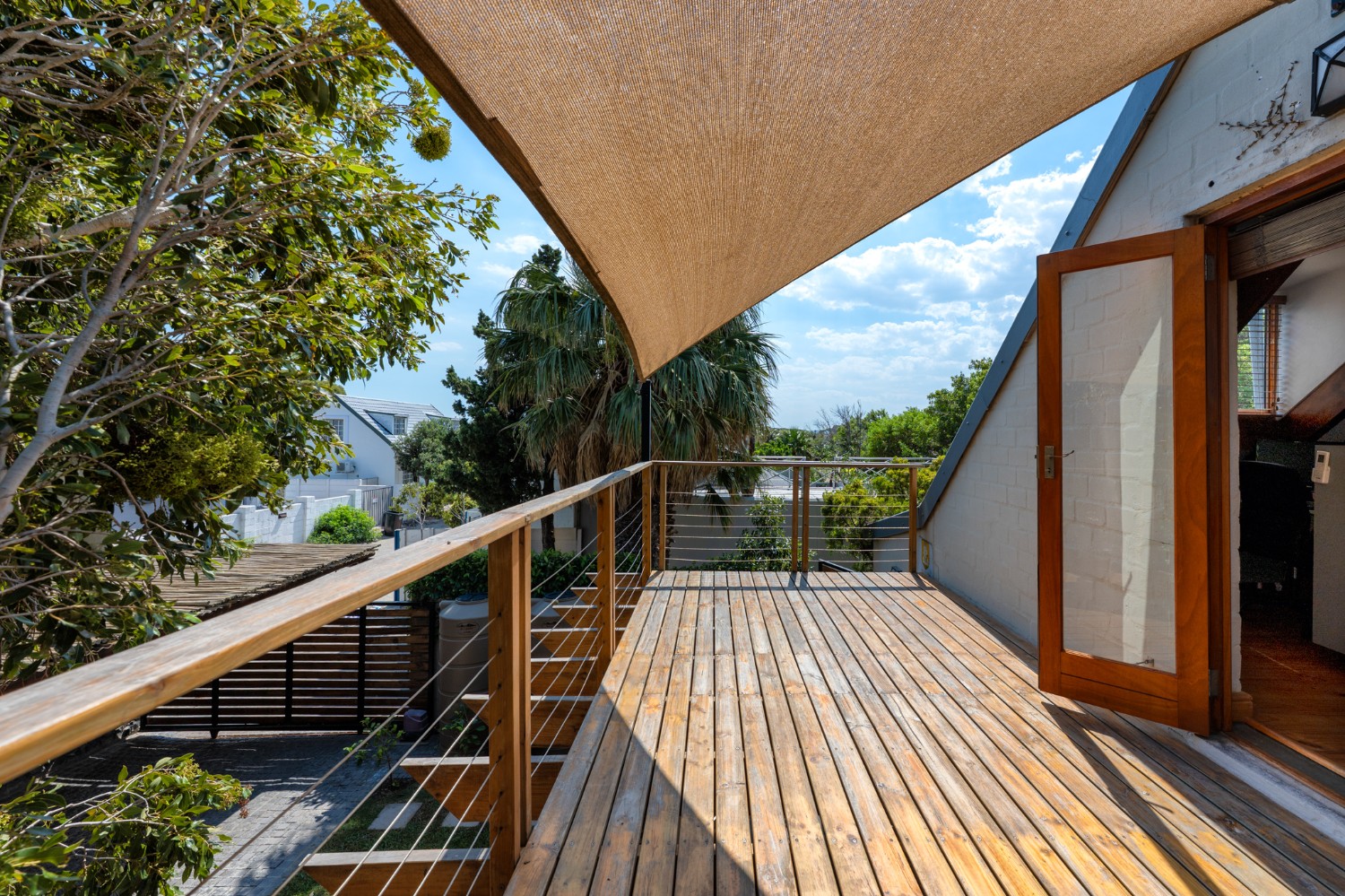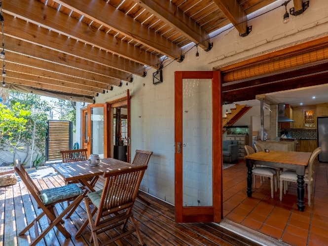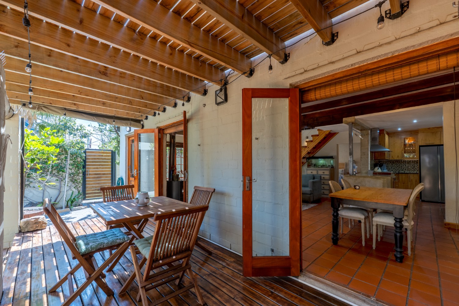 A beautiful wooden deck entertainment area with built-in braai overlooks the garden — perfect for relaxed outdoor living.