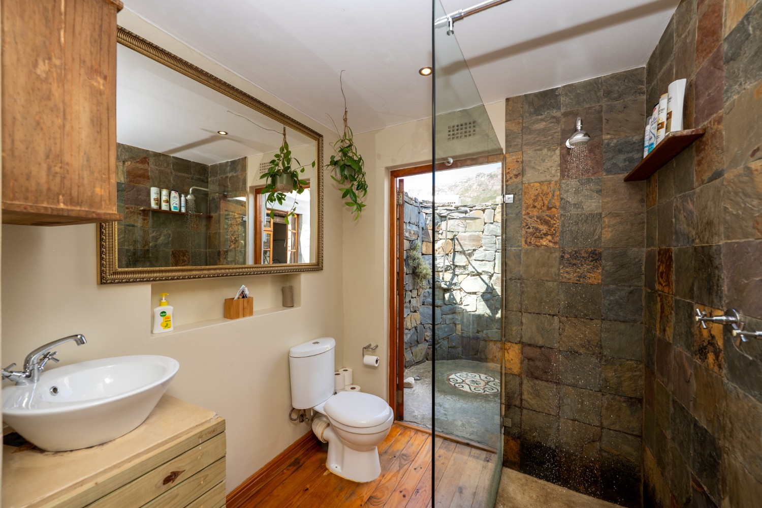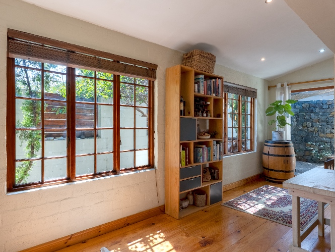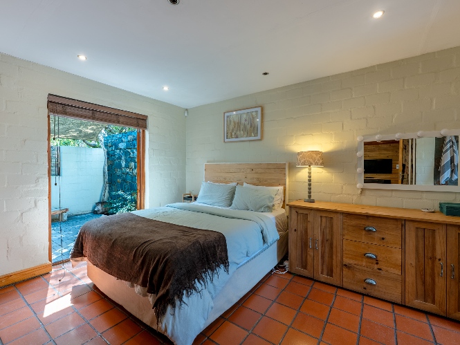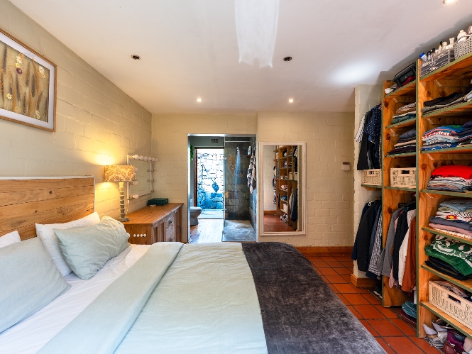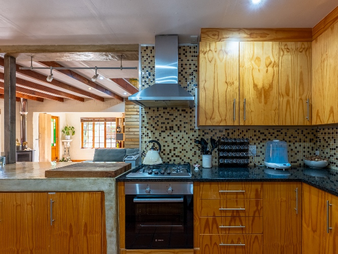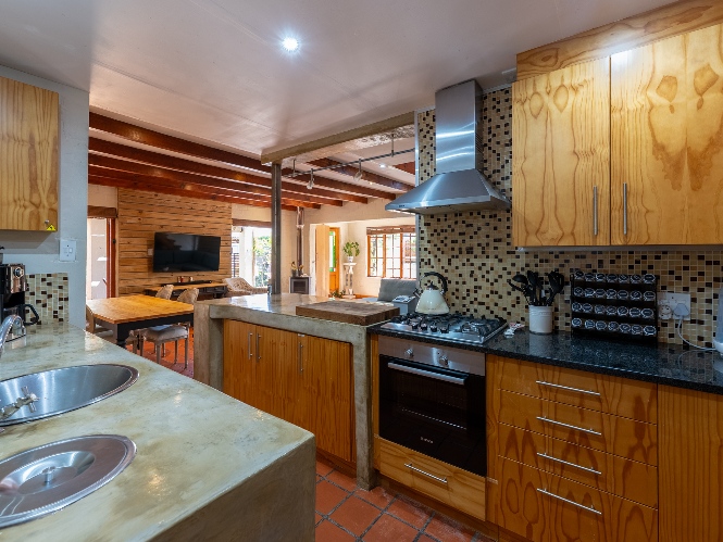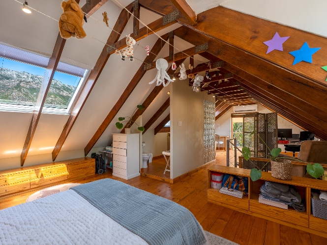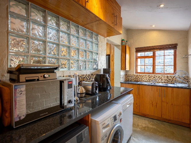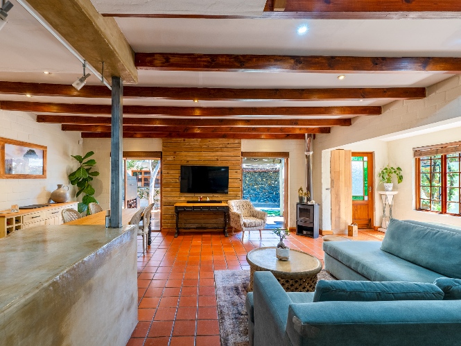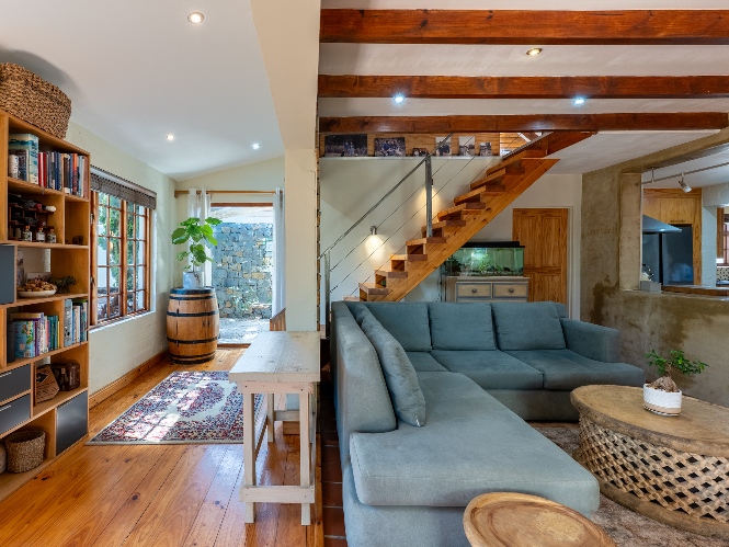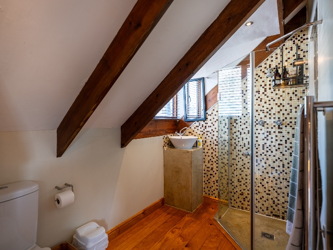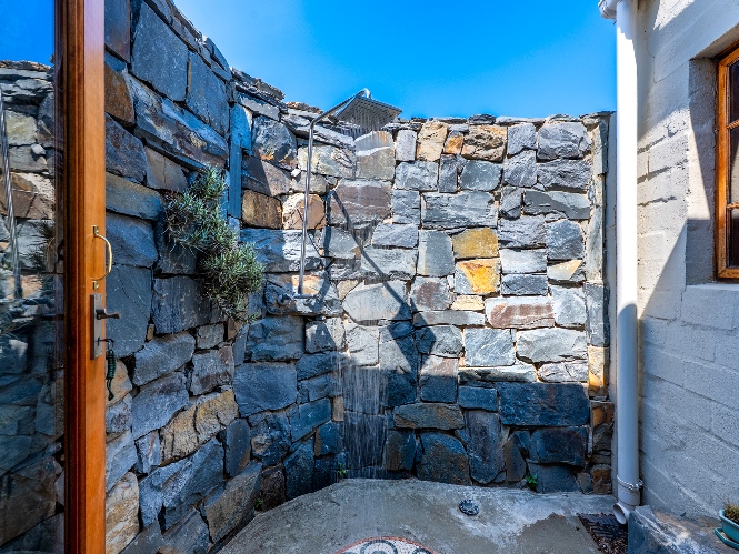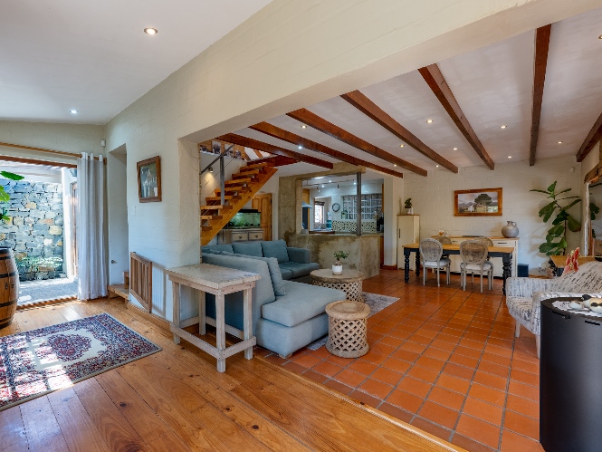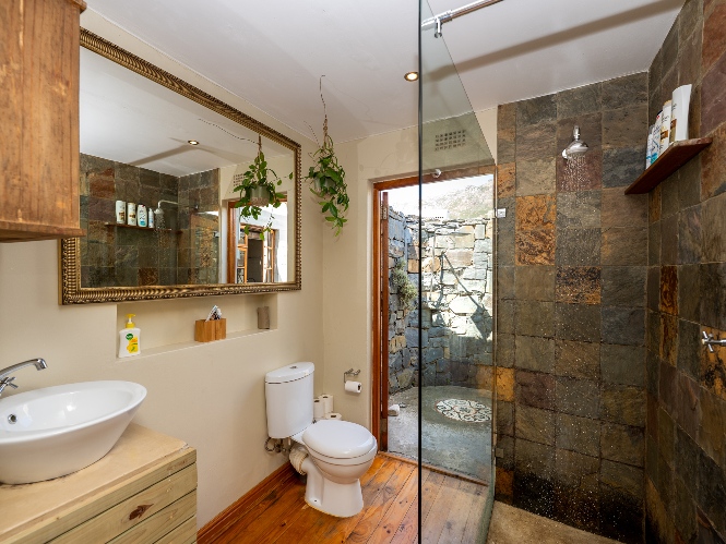 Inside, the open-plan living area flows into a charming cottage-style kitchen with a spacious pantry/scullery. The main bedroom (downstairs) offers an en-suite bathroom and a stunning outdoor shower with mountain views.