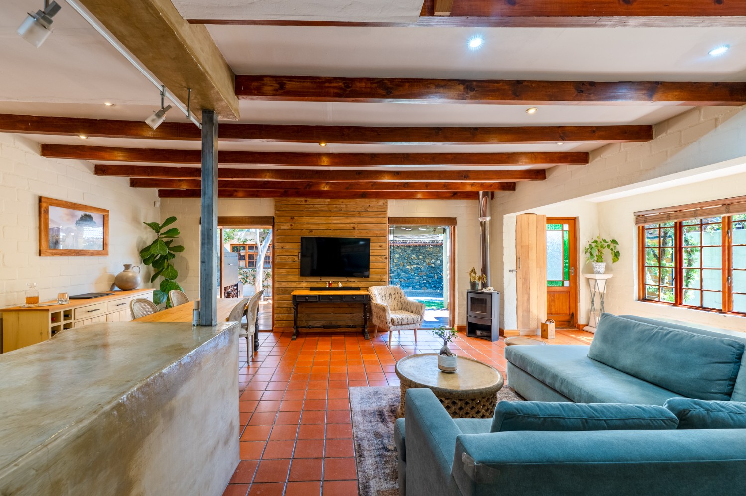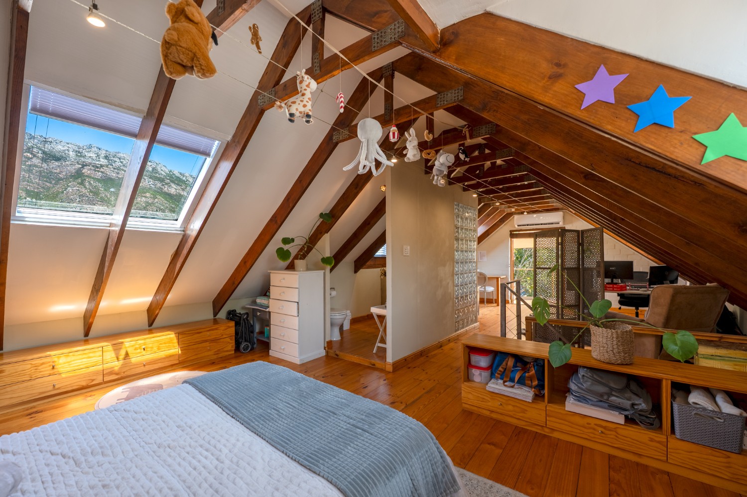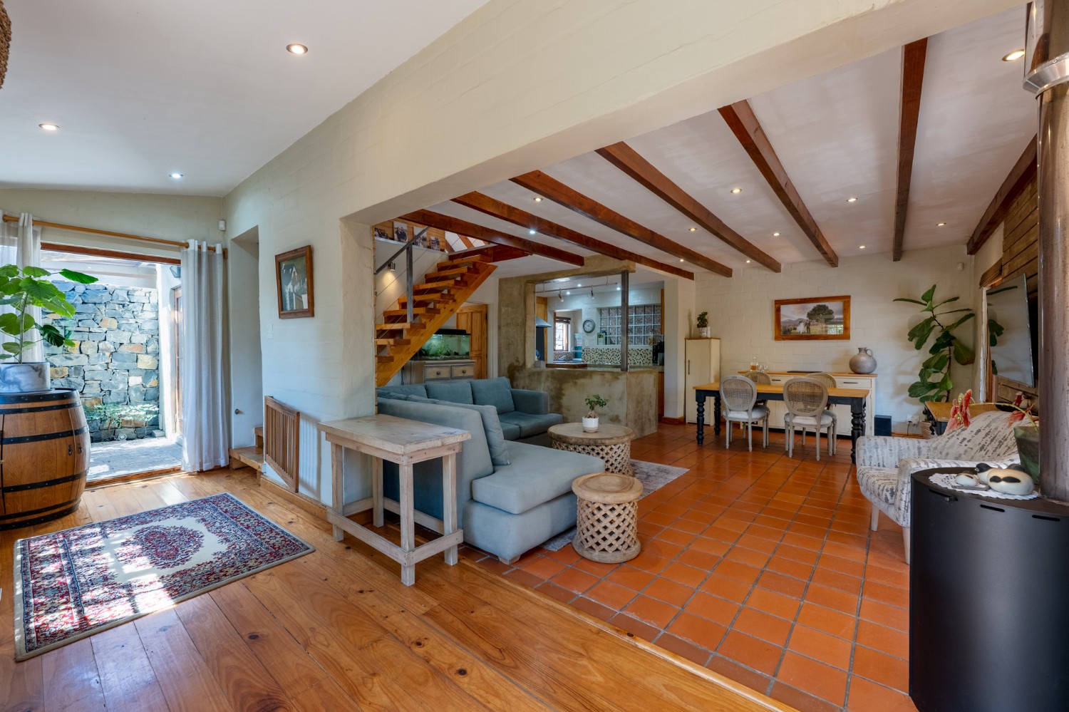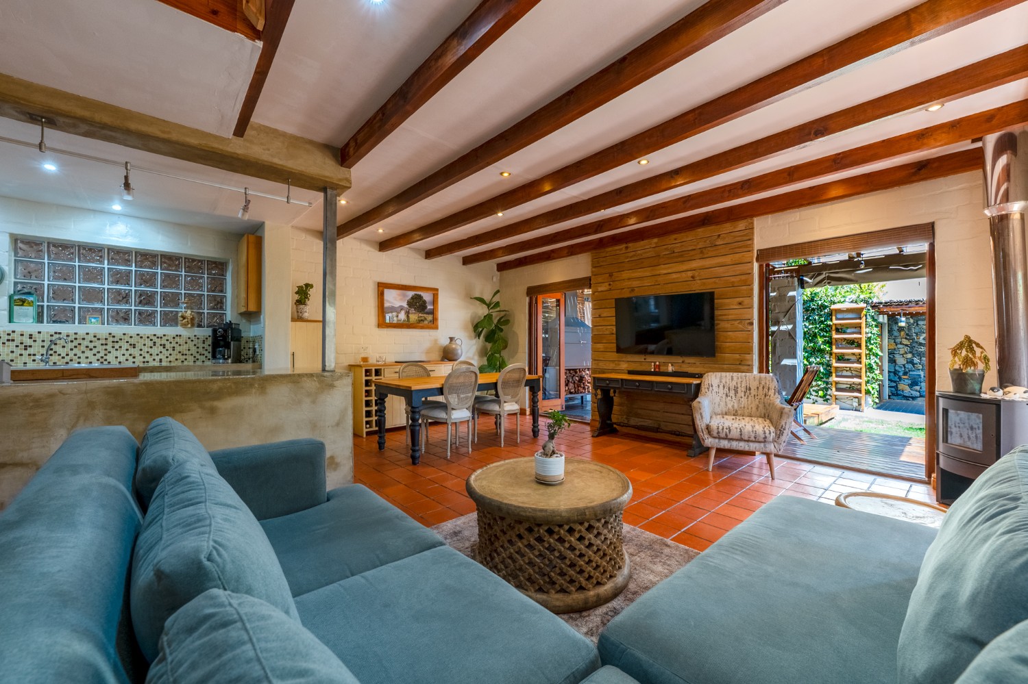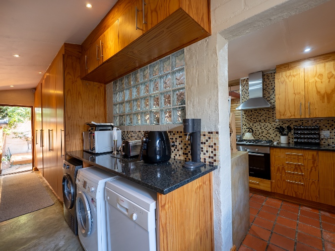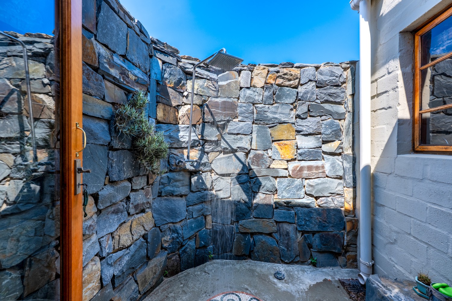 Inside, the open-plan living area flows into a charming cottage-style kitchen with a spacious pantry/scullery. The main bedroom (downstairs) offers an en-suite bathroom and a stunning outdoor shower with mountain views.