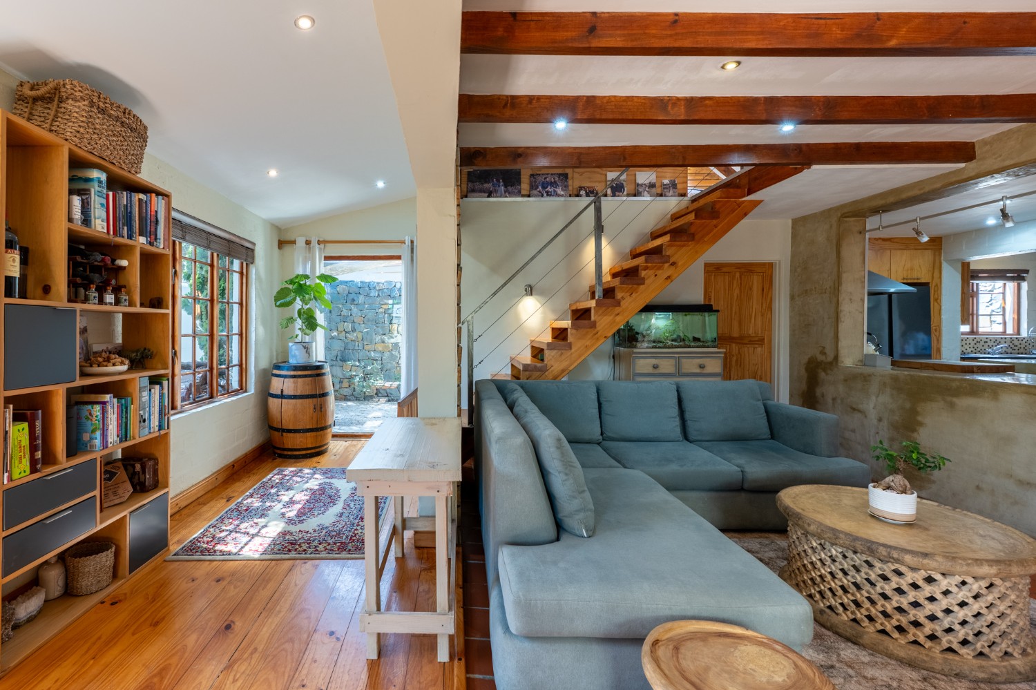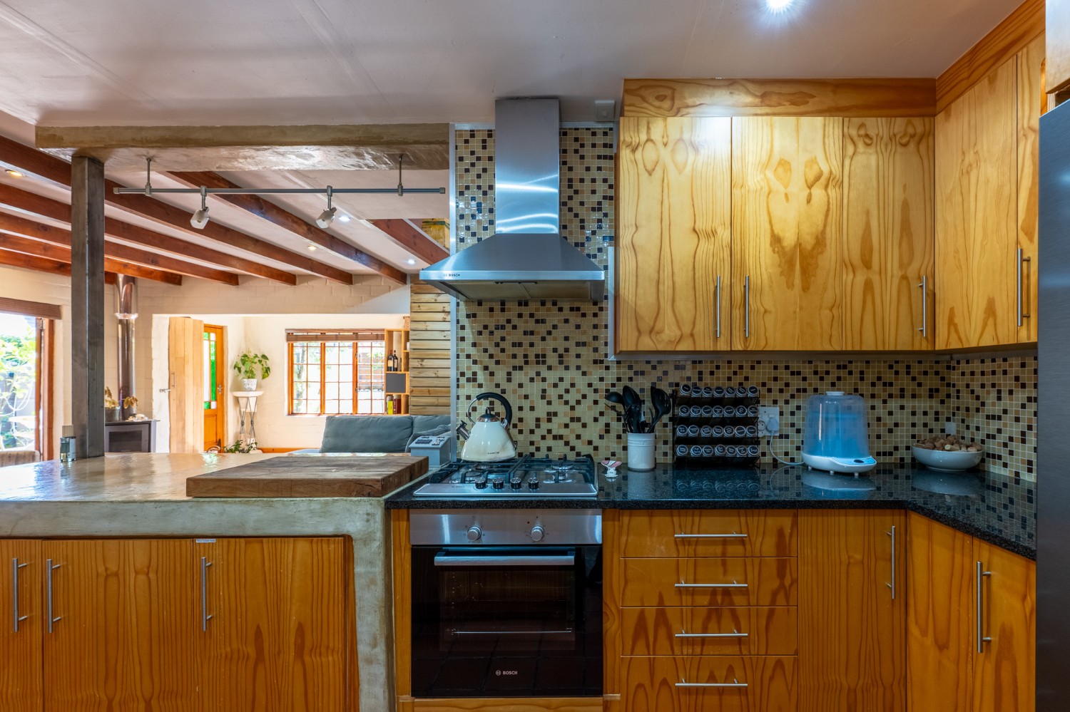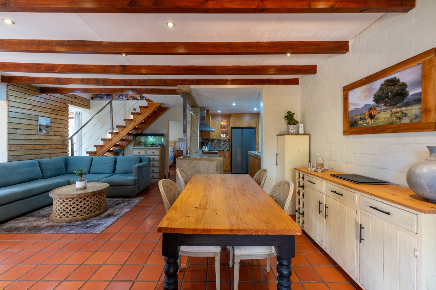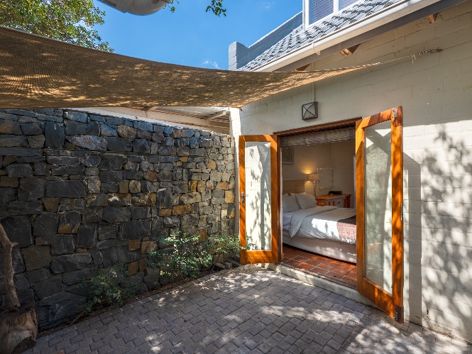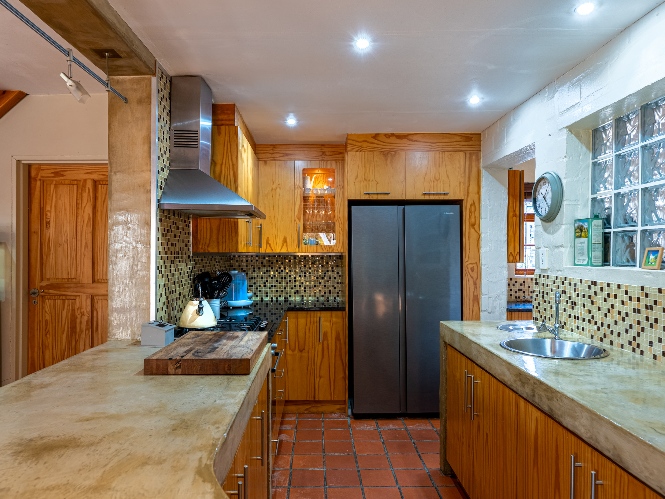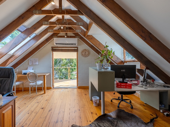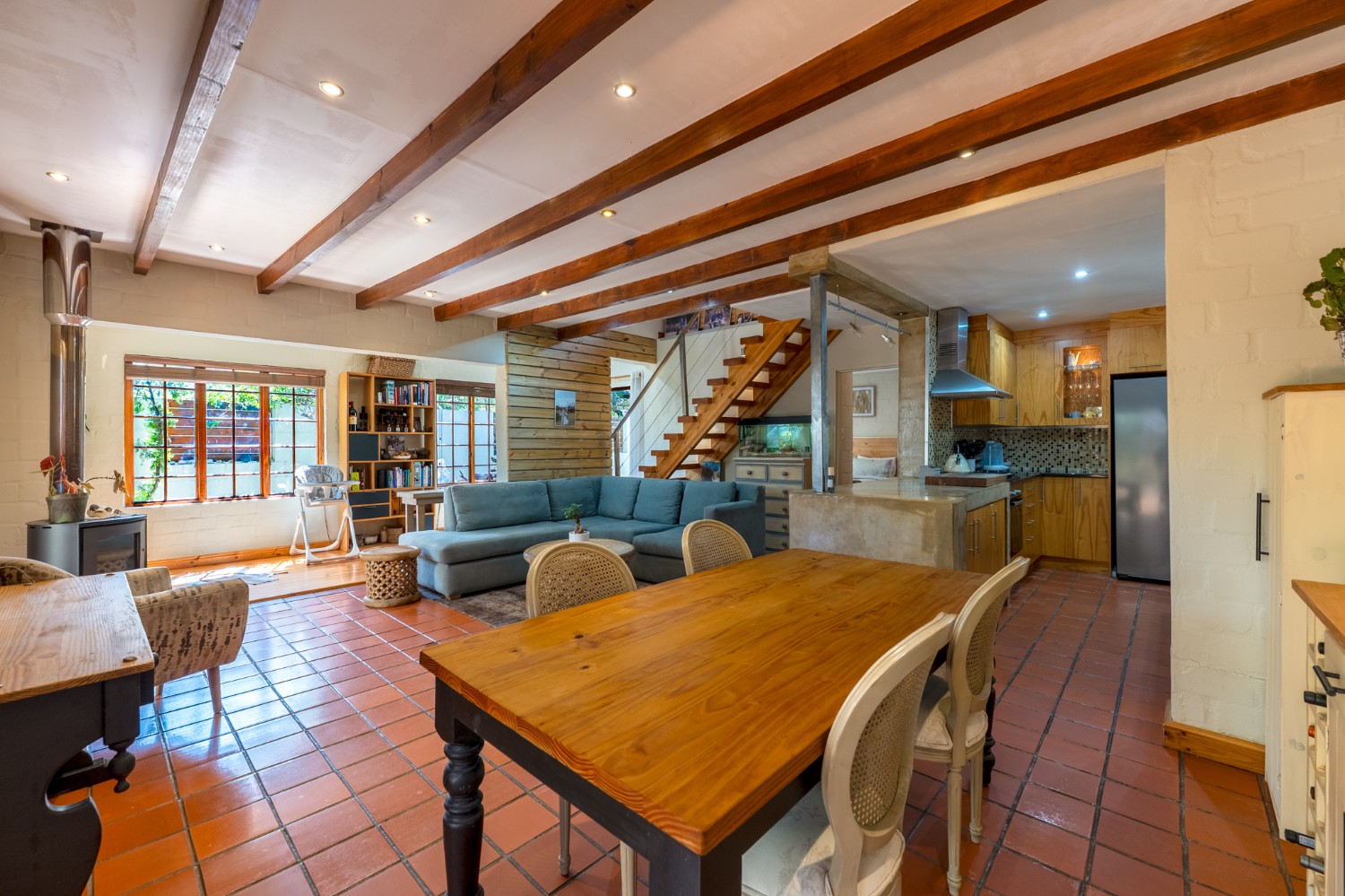 Inside, the open-plan living area flows into a charming cottage-style kitchen with a spacious pantry/scullery. The main bedroom (downstairs) offers an en-suite bathroom and a stunning outdoor shower with mountain views.