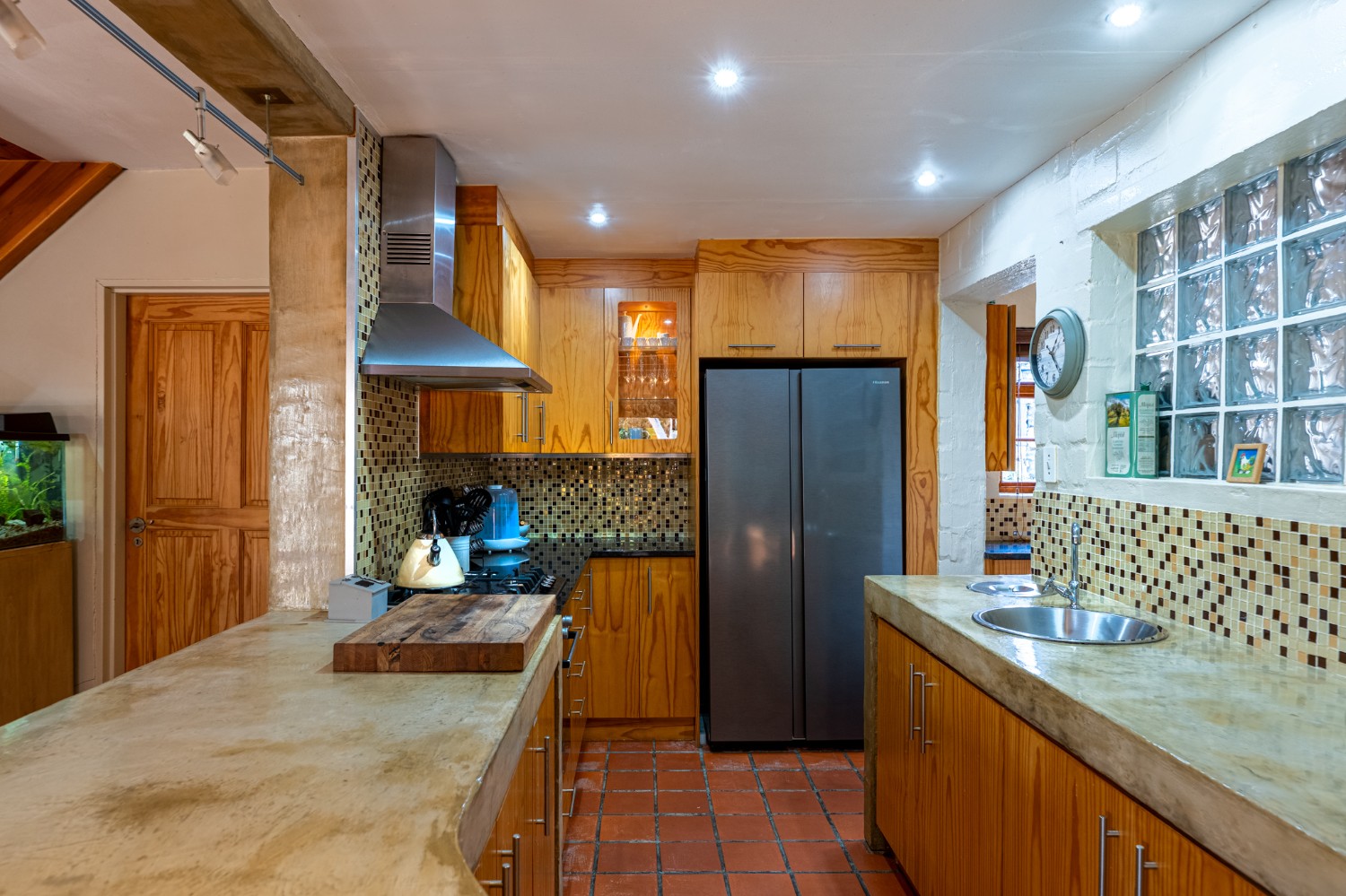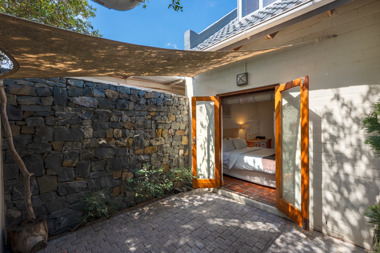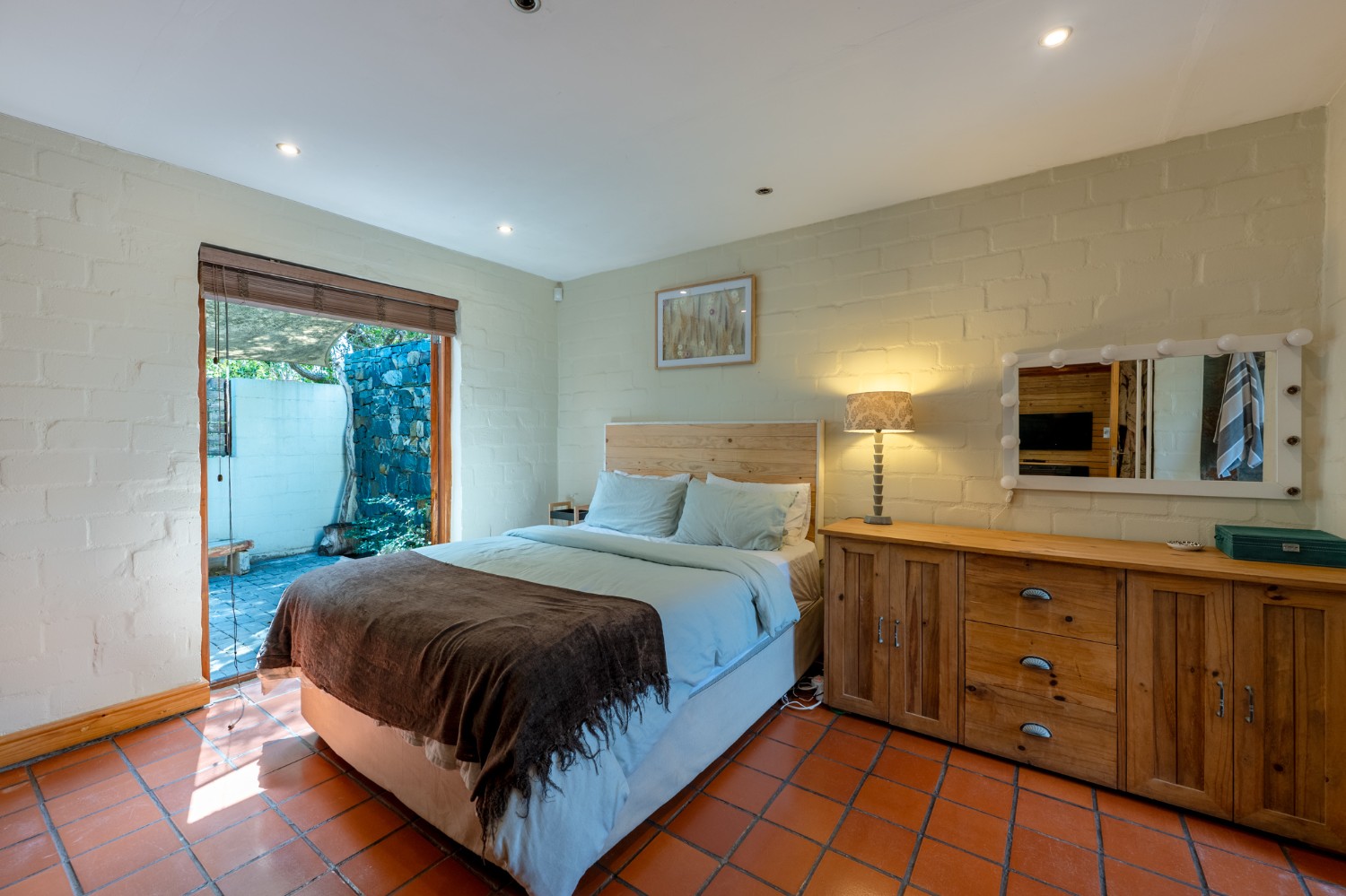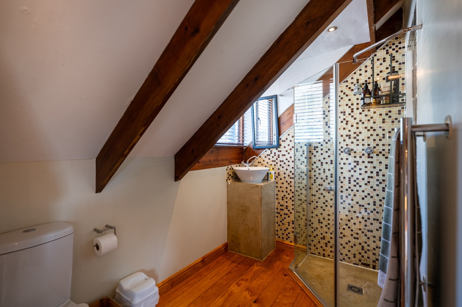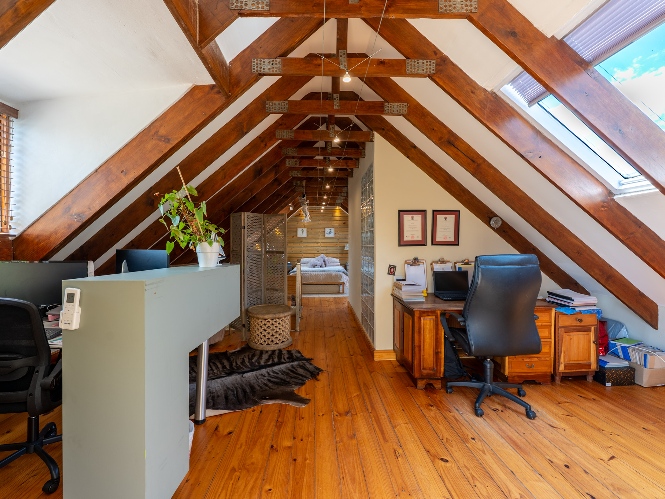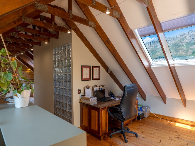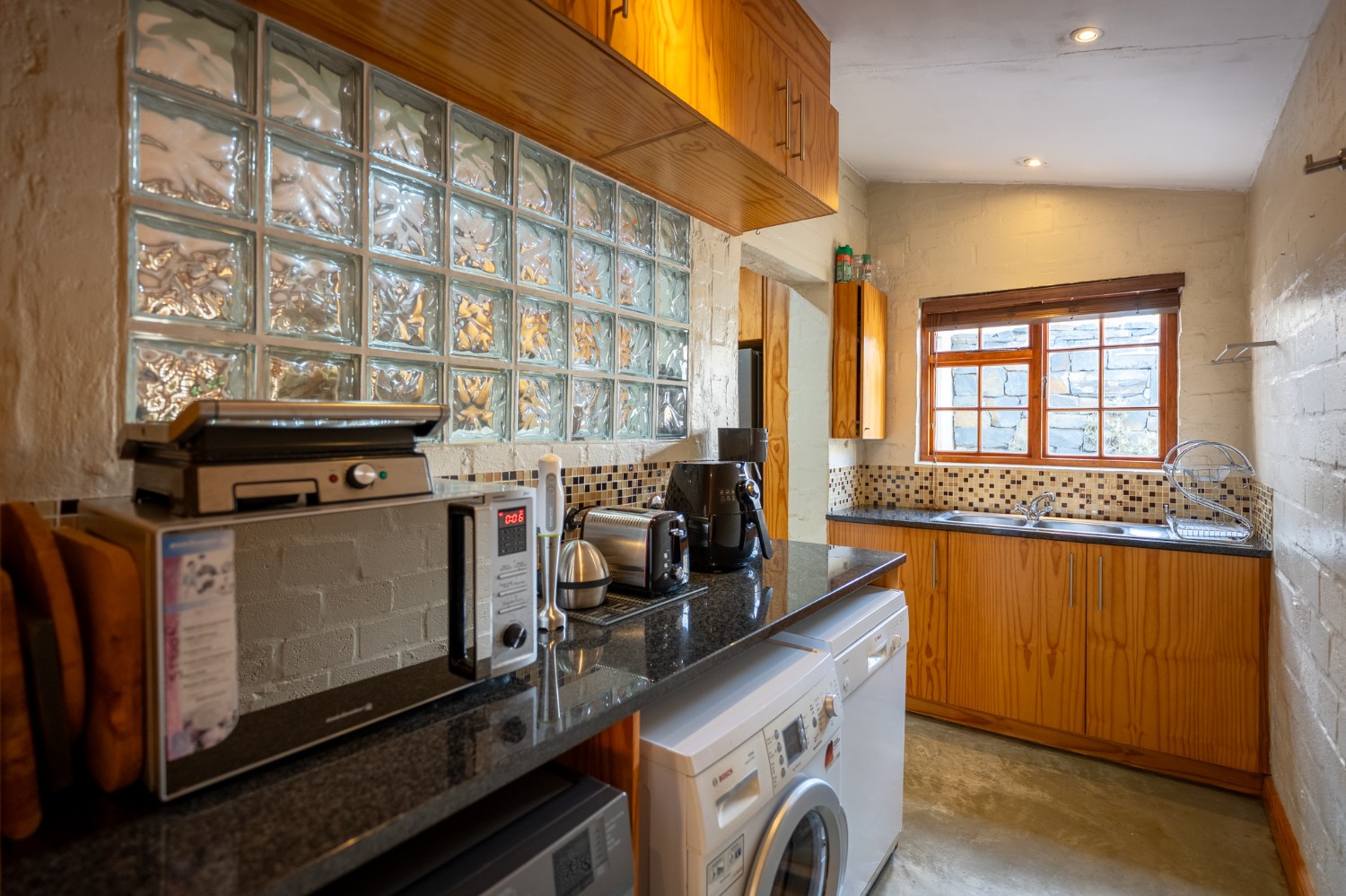 Inside, the open-plan living area flows into a charming cottage-style kitchen with a spacious pantry/scullery. The main bedroom (downstairs) offers an en-suite bathroom and a stunning outdoor shower with mountain views.