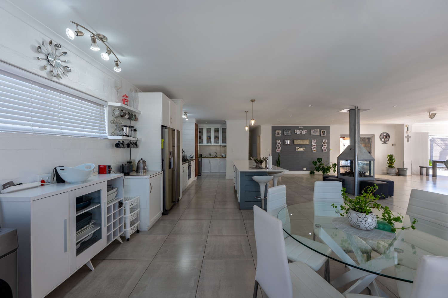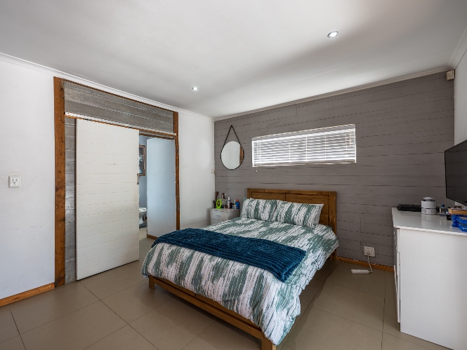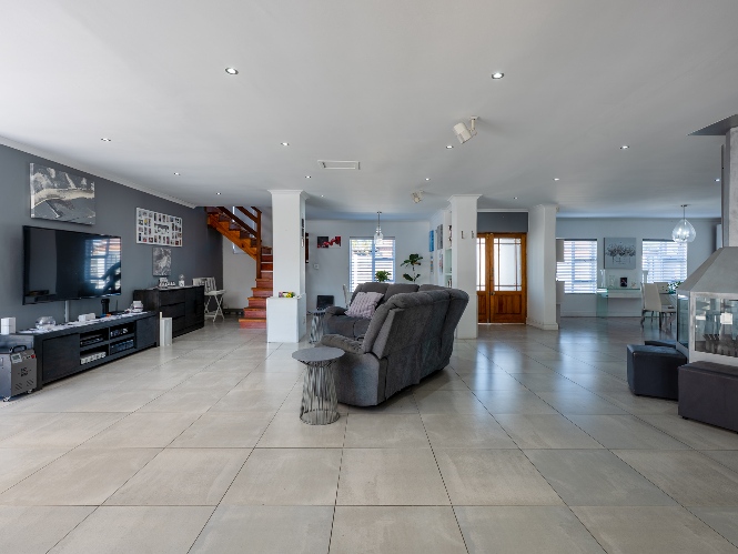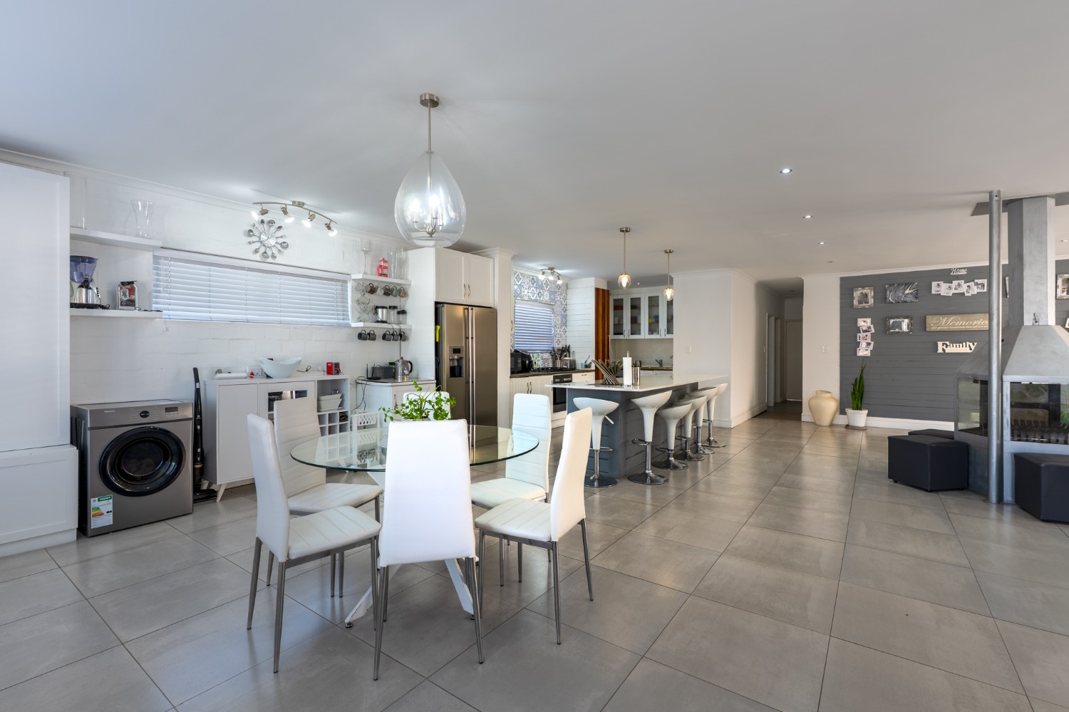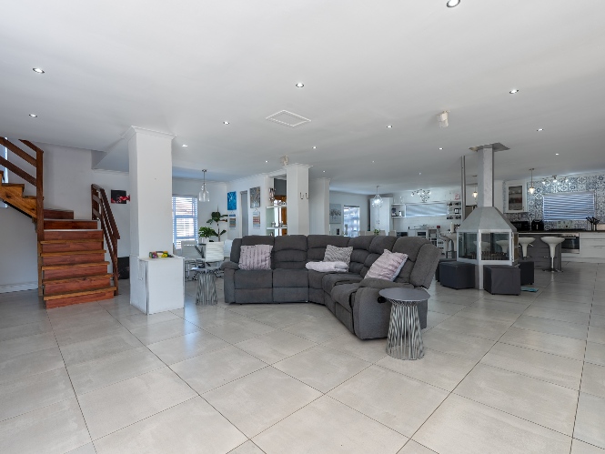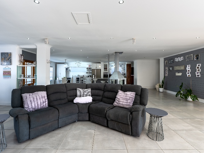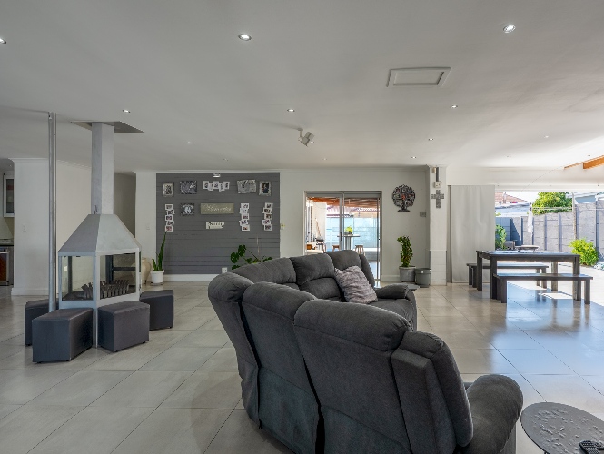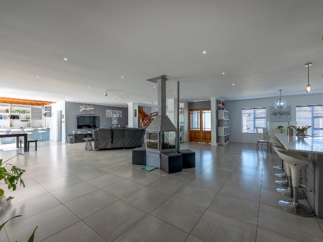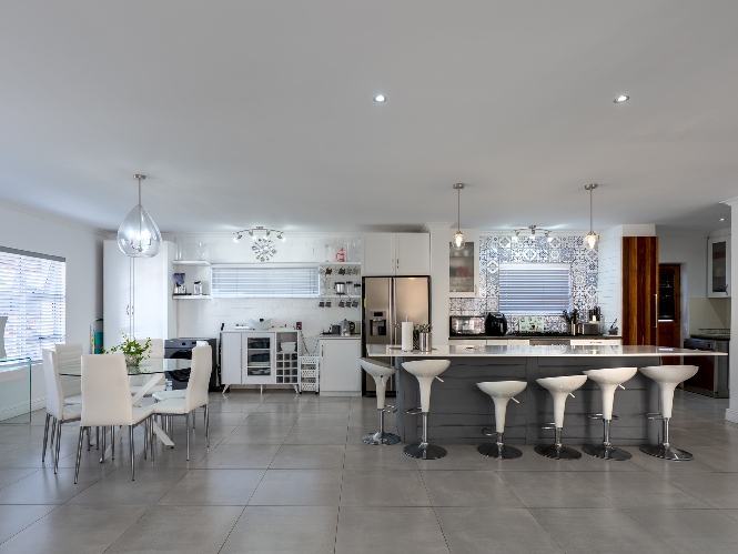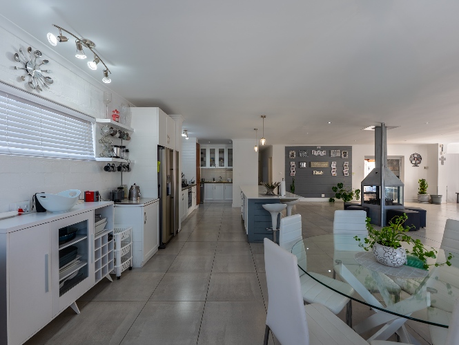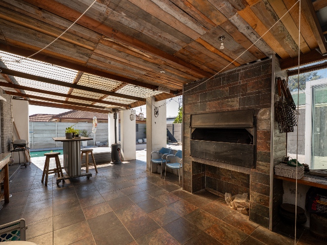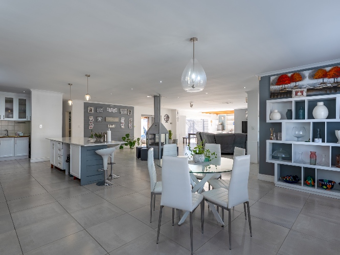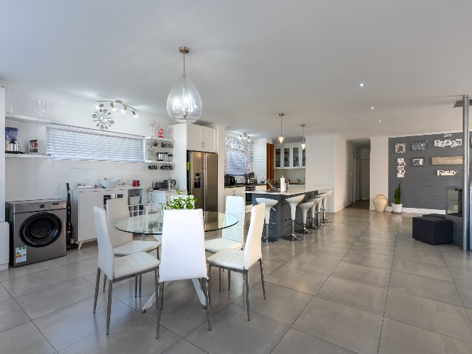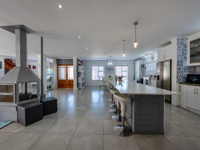 At the heart of the home lies an expansive open-plan lounge, dining room, and kitchen, seamlessly connected by a beautiful fireplace that creates a warm and inviting atmosphere. The lounge and dining space flow effortlessly into a stylish bar area, with stackable doors opening up to the backyard. A second sliding door from the lounge leads to a covered outdoor entertainment area, complete with a built-in braai, making indoor-outdoor living a breeze. The stunning kitchen is both functional and elegant, featuring ample cabinetry, quartz countertops, an under-counter oven with a gas stovetop, and a centre island ideal for cooking and socialising. A separate laundry/scullery with plumbing points adds convenience and keeps the main kitchen space neat and organised.