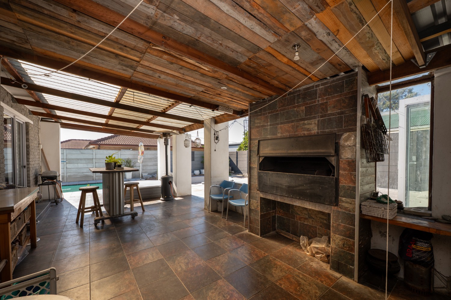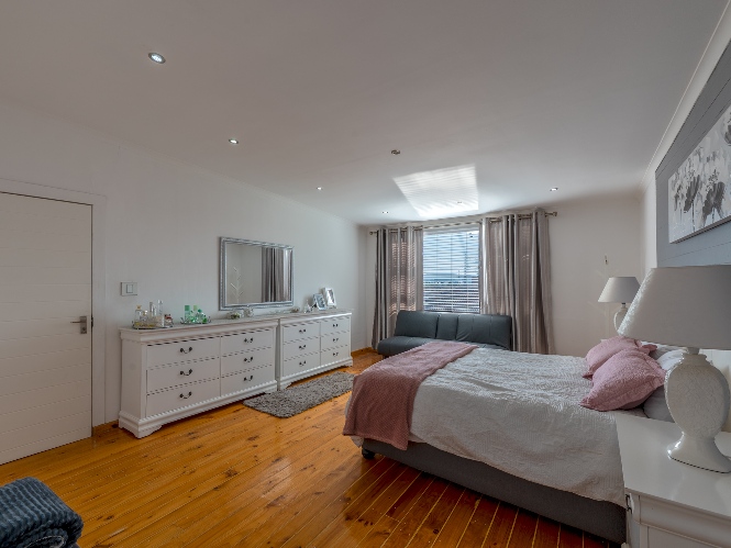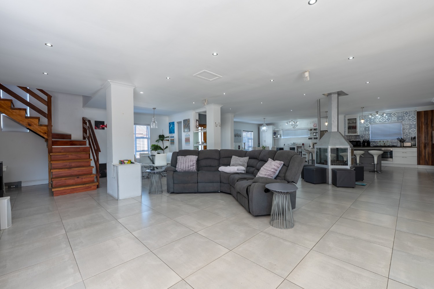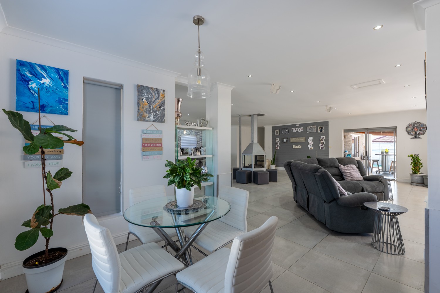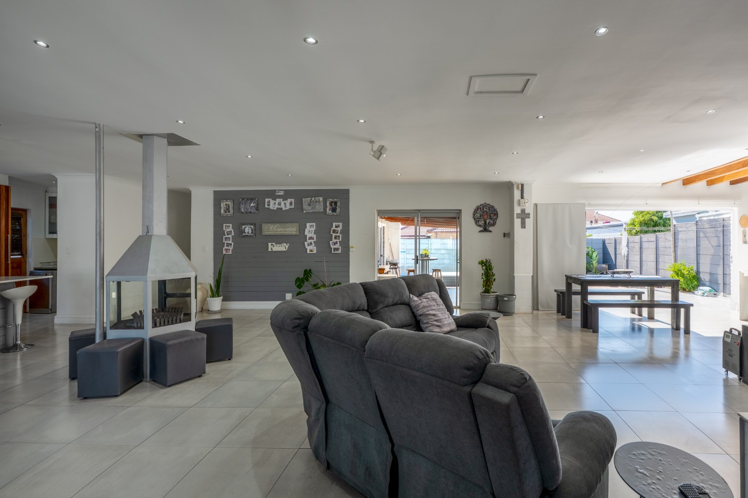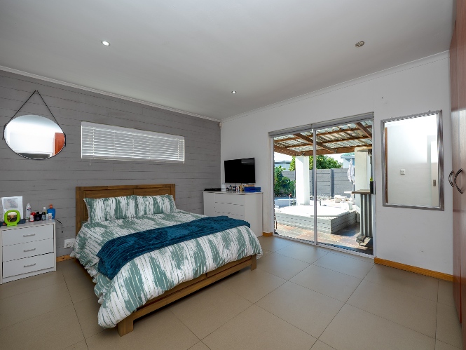 At the heart of the home lies an expansive open-plan lounge, dining room, and kitchen, seamlessly connected by a beautiful fireplace that creates a warm and inviting atmosphere. The lounge and dining space flow effortlessly into a stylish bar area, with stackable doors opening up to the backyard. A second sliding door from the lounge leads to a covered outdoor entertainment area, complete with a built-in braai, making indoor-outdoor living a breeze. The stunning kitchen is both functional and elegant, featuring ample cabinetry, quartz countertops, an under-counter oven with a gas stovetop, and a centre island ideal for cooking and socialising. A separate laundry/scullery with plumbing points adds convenience and keeps the main kitchen space neat and organised.