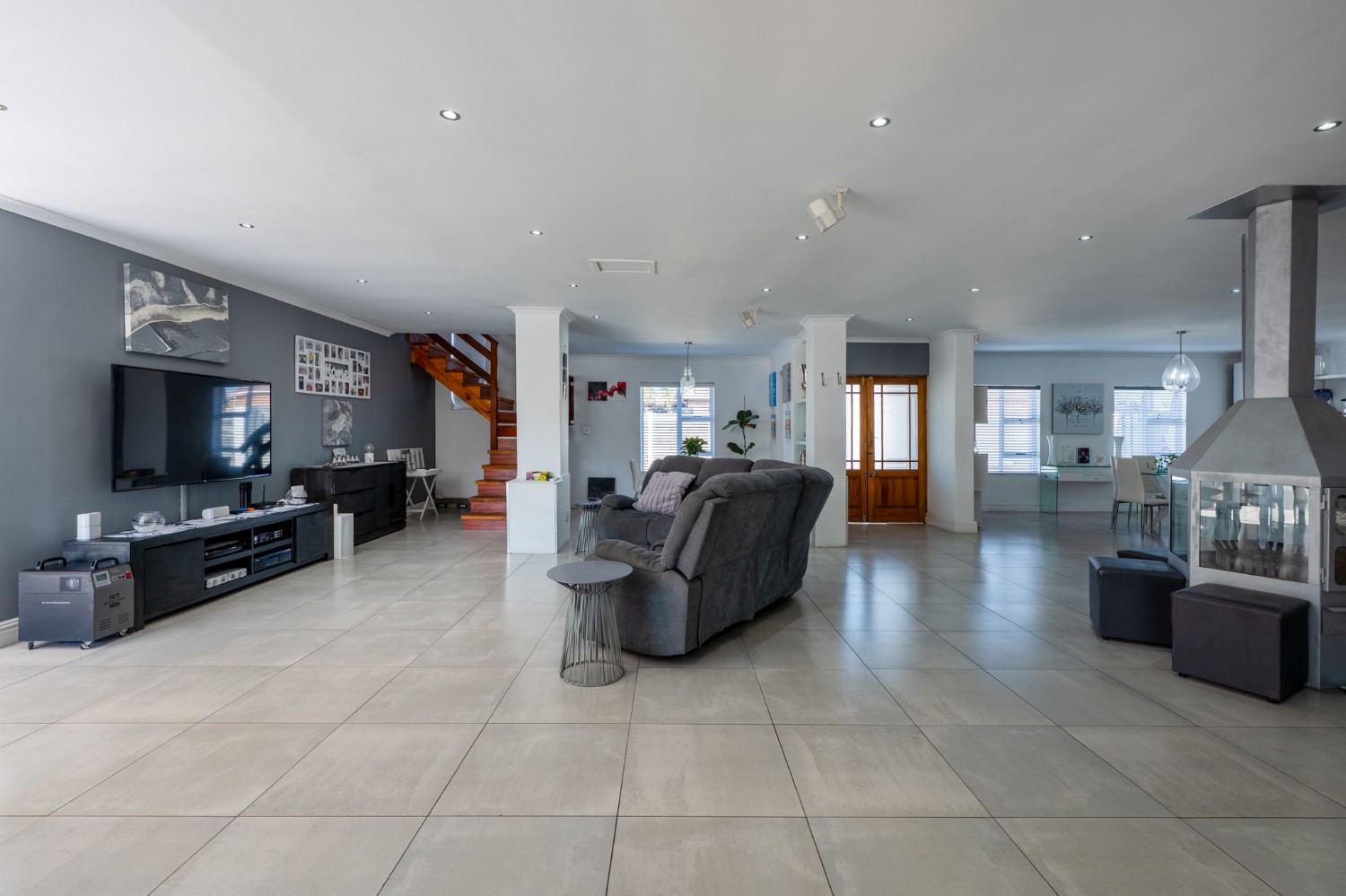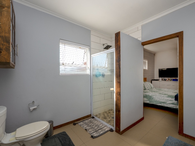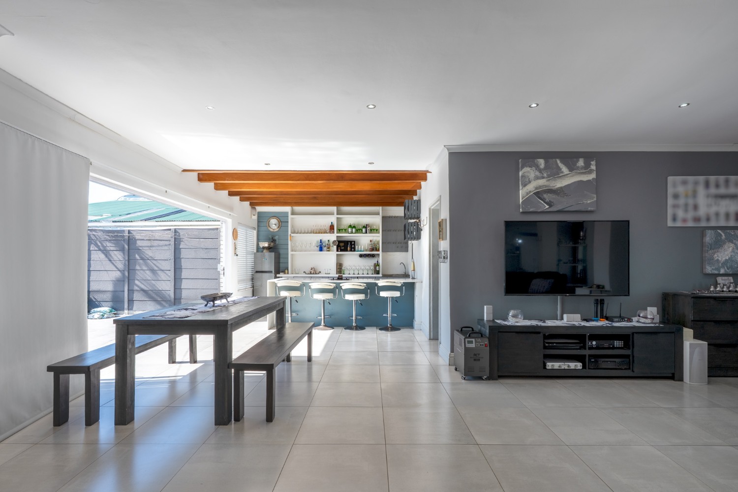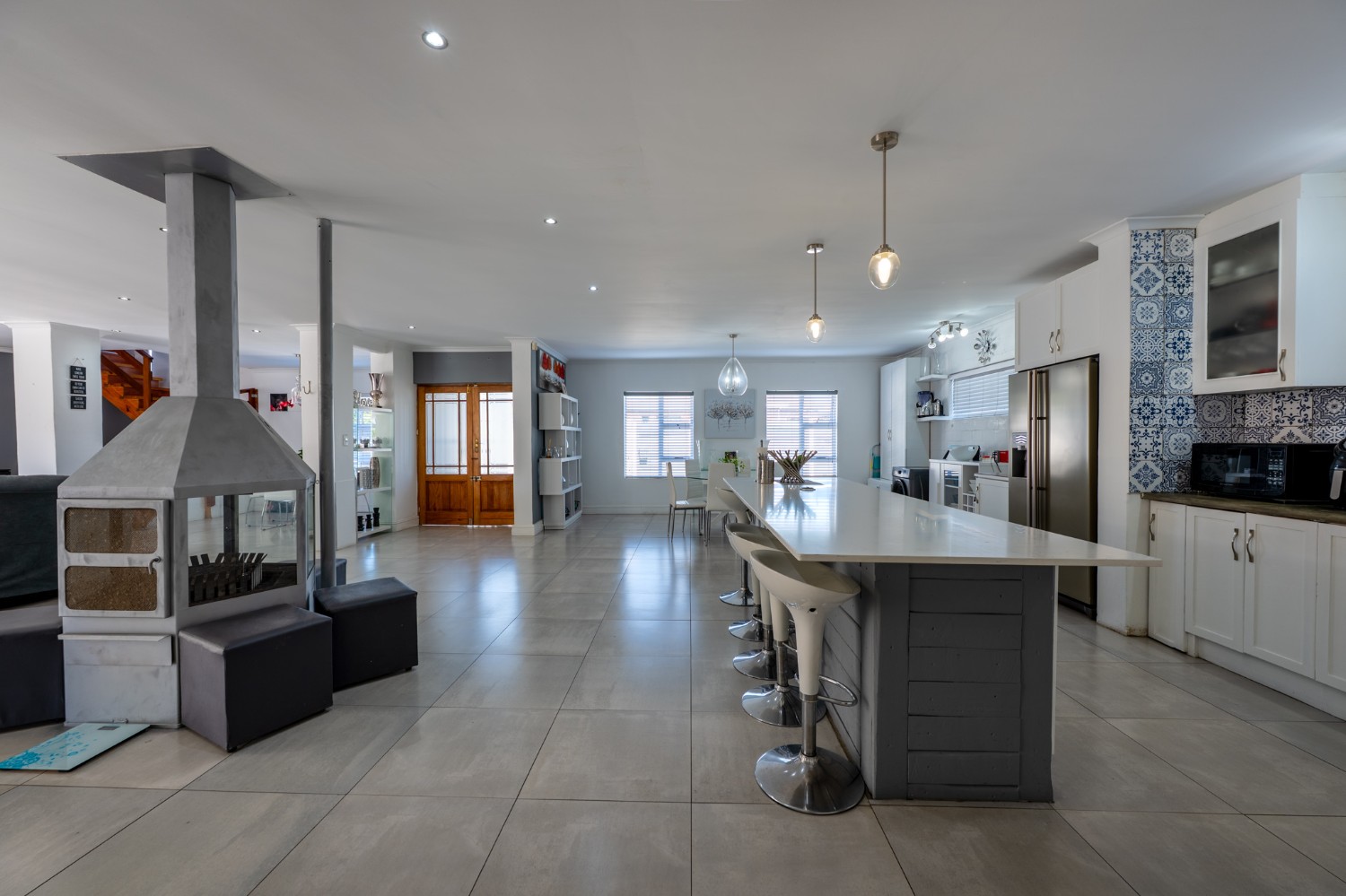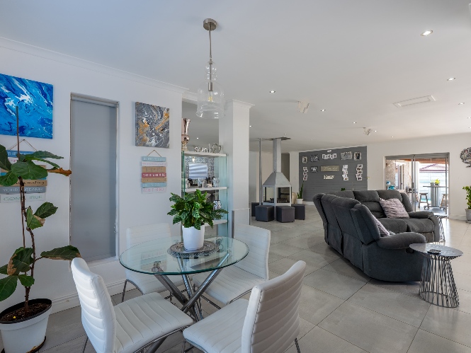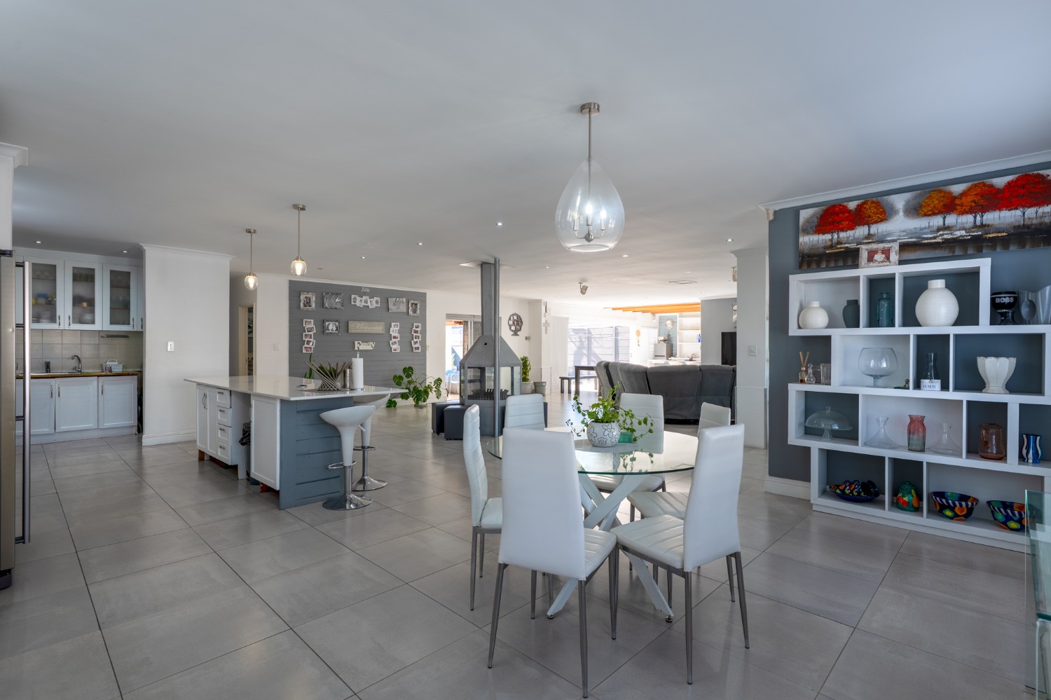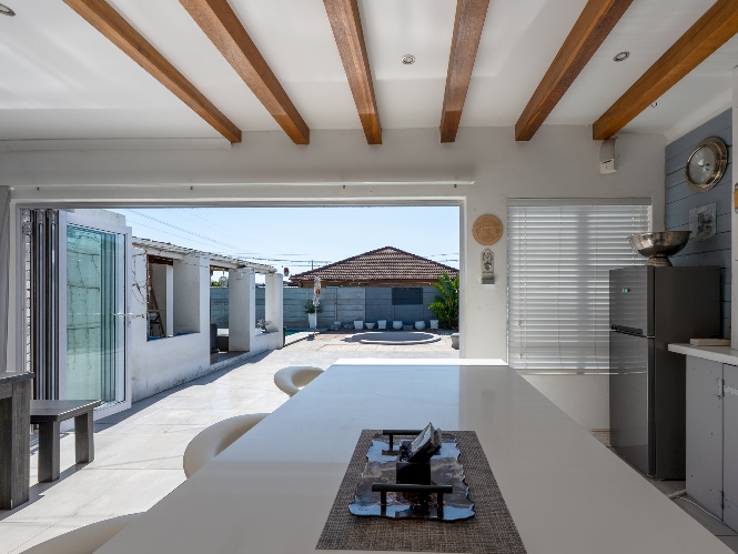 At the heart of the home lies an expansive open-plan lounge, dining room, and kitchen, seamlessly connected by a beautiful fireplace that creates a warm and inviting atmosphere. The lounge and dining space flow effortlessly into a stylish bar area, with stackable doors opening up to the backyard. A second sliding door from the lounge leads to a covered outdoor entertainment area, complete with a built-in braai, making indoor-outdoor living a breeze. The stunning kitchen is both functional and elegant, featuring ample cabinetry, quartz countertops, an under-counter oven with a gas stovetop, and a centre island ideal for cooking and socialising. A separate laundry/scullery with plumbing points adds convenience and keeps the main kitchen space neat and organised.