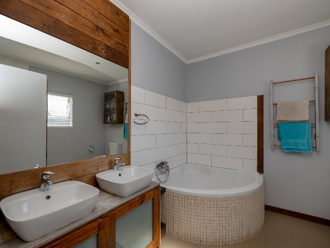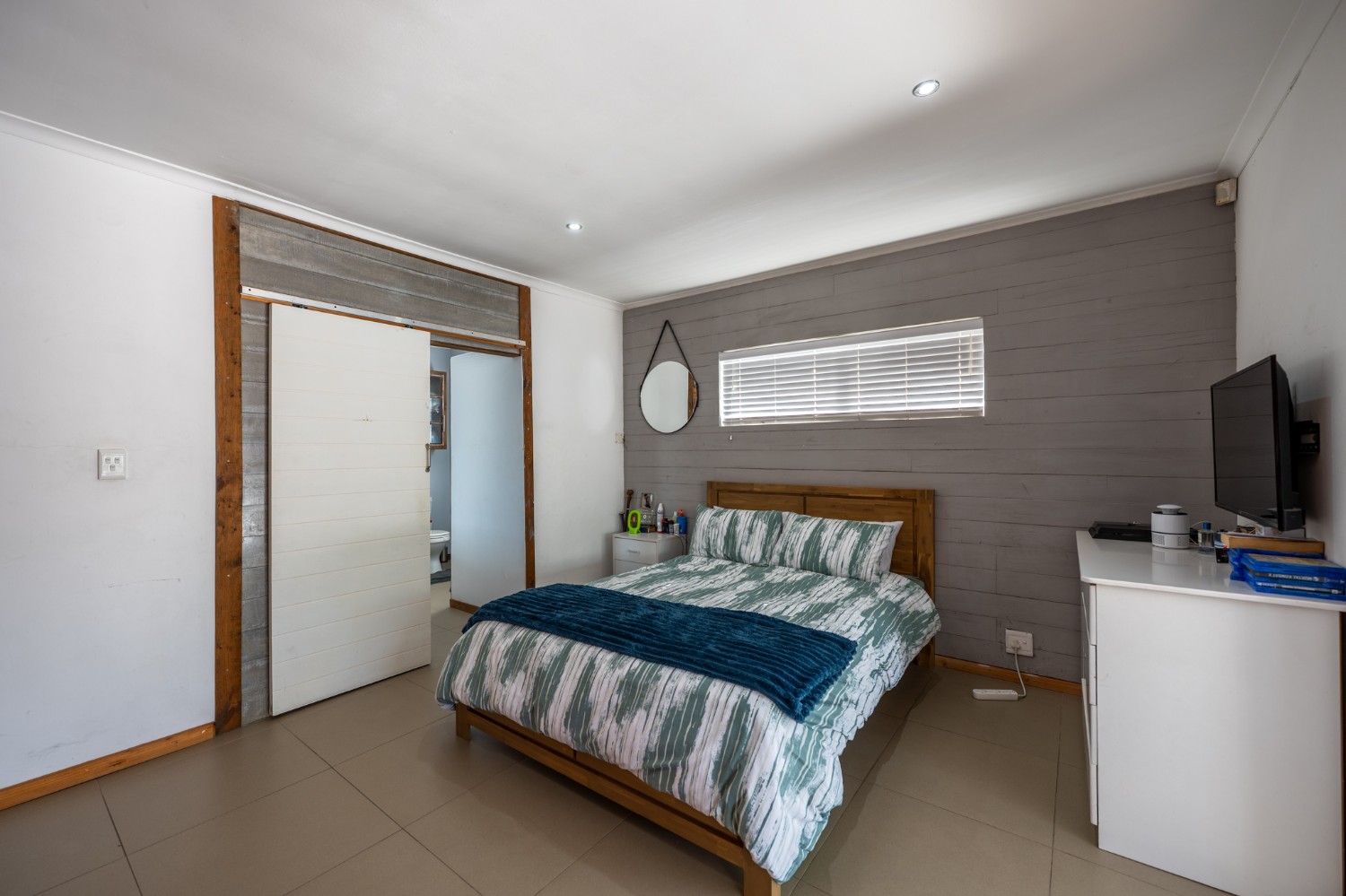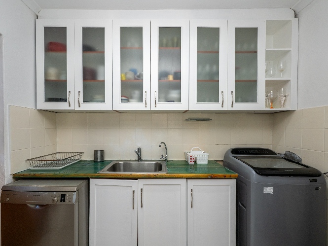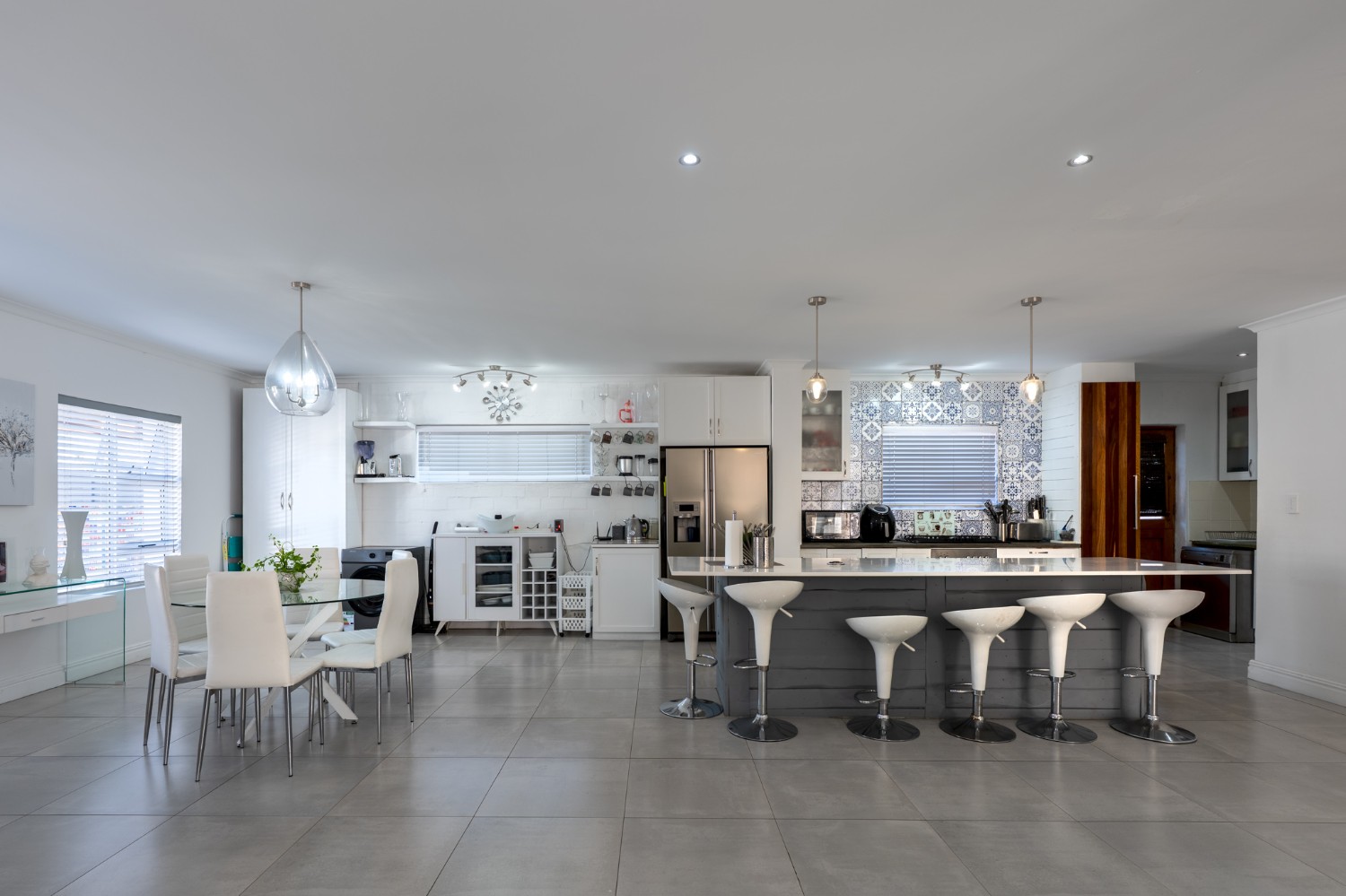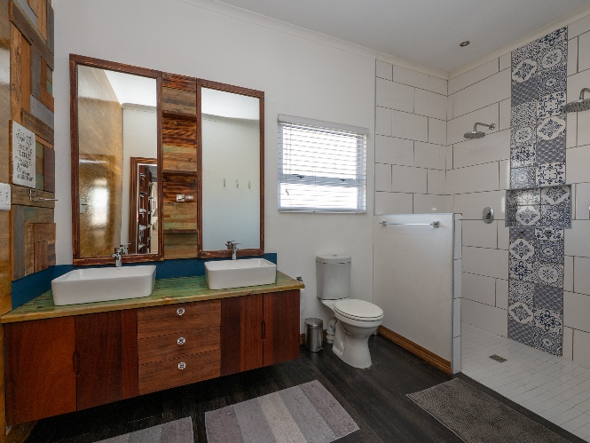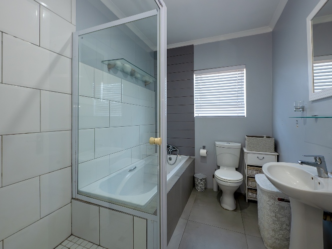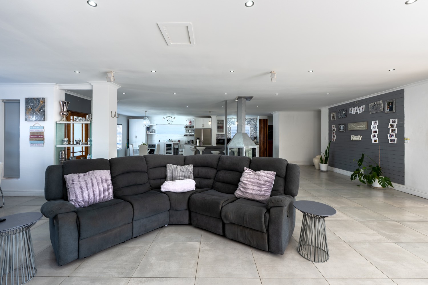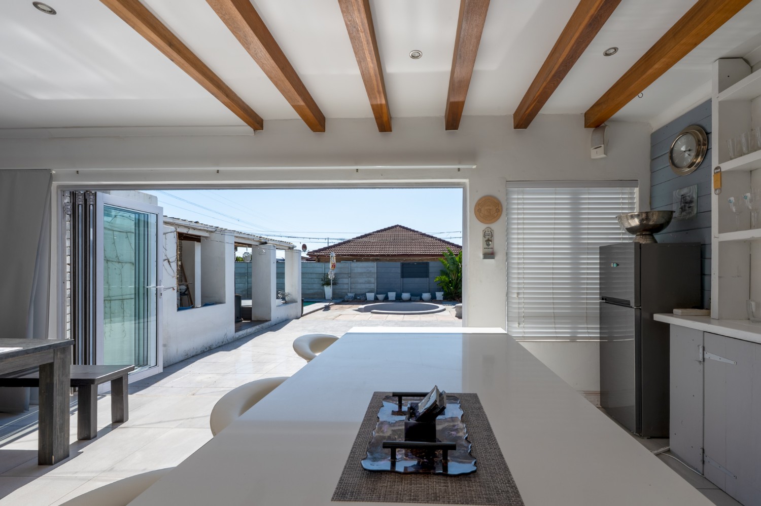 At the heart of the home lies an expansive open-plan lounge, dining room, and kitchen, seamlessly connected by a beautiful fireplace that creates a warm and inviting atmosphere. The lounge and dining space flow effortlessly into a stylish bar area, with stackable doors opening up to the backyard. A second sliding door from the lounge leads to a covered outdoor entertainment area, complete with a built-in braai, making indoor-outdoor living a breeze. The stunning kitchen is both functional and elegant, featuring ample cabinetry, quartz countertops, an under-counter oven with a gas stovetop, and a centre island ideal for cooking and socialising. A separate laundry/scullery with plumbing points adds convenience and keeps the main kitchen space neat and organised.
