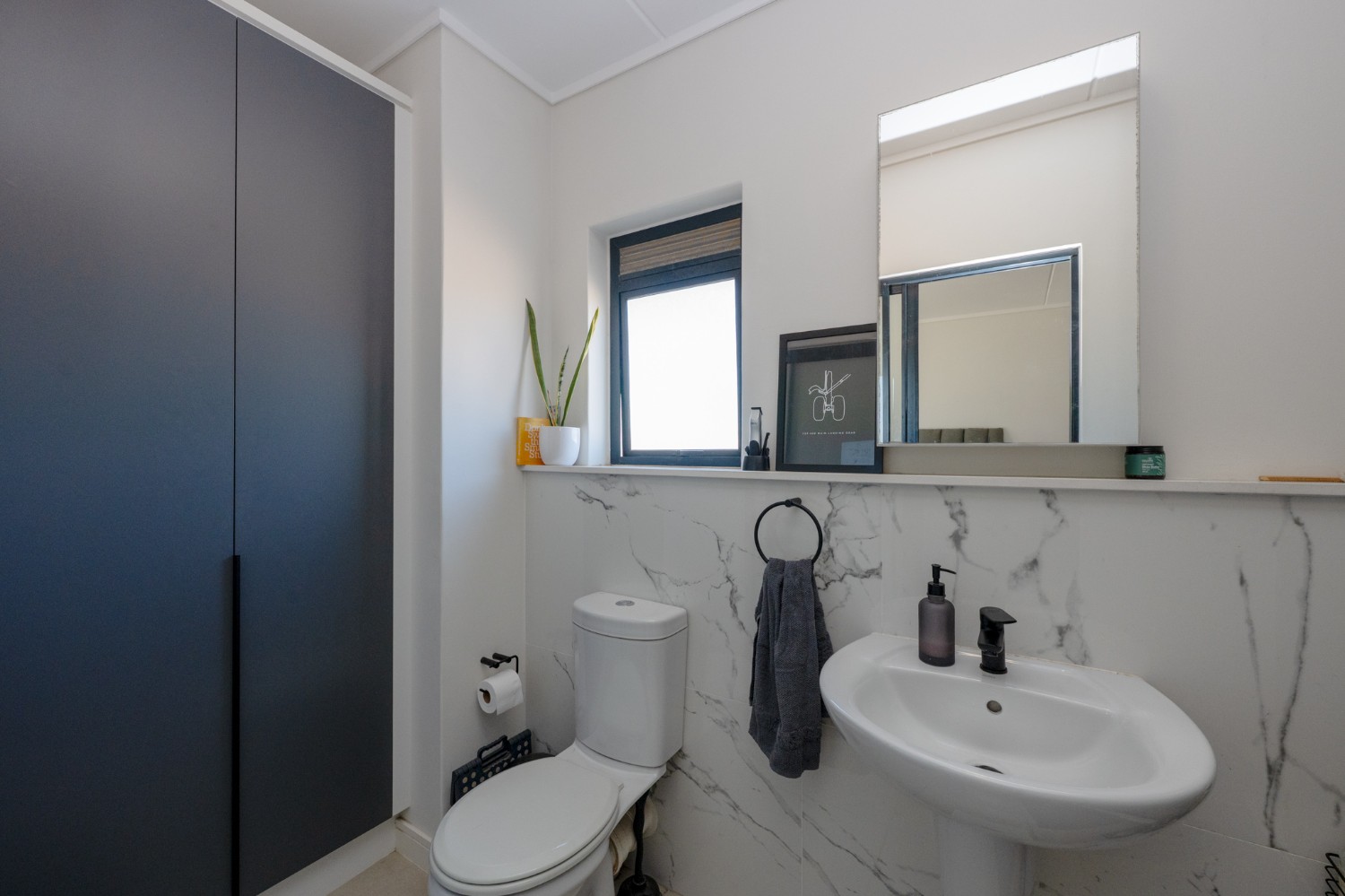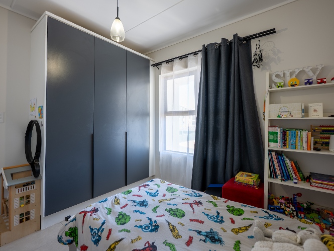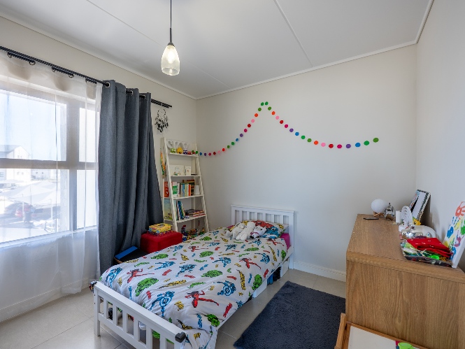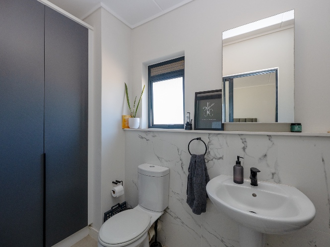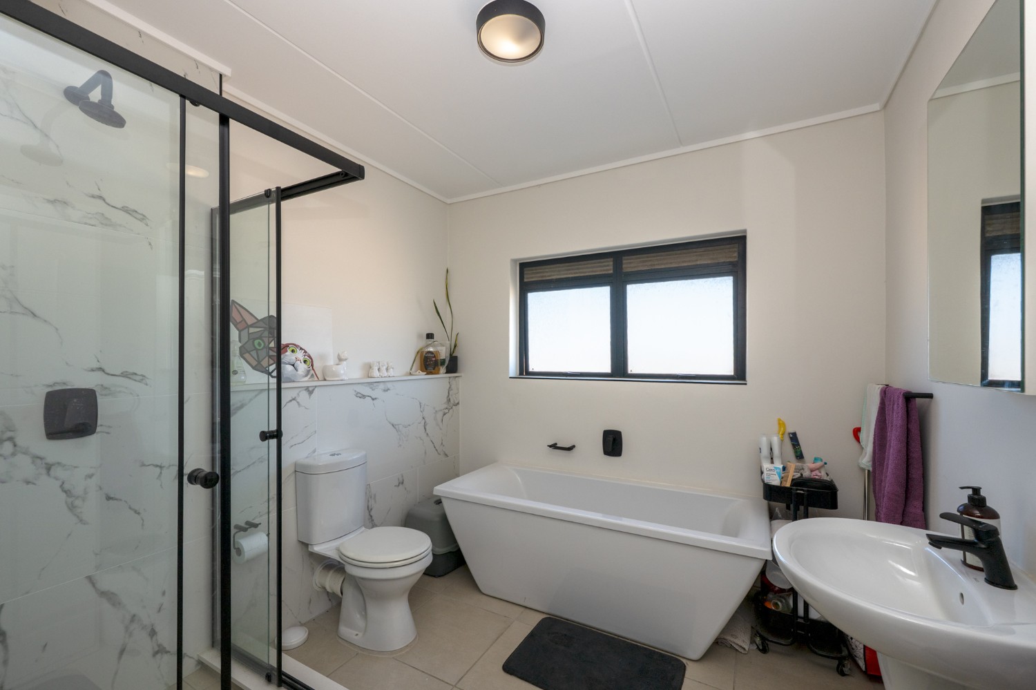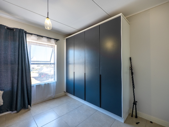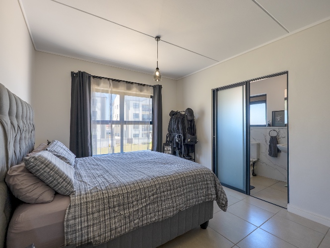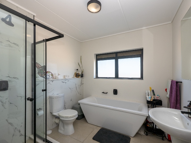 All three bedrooms are tiled, featuring curtain rails, ample cupboard space, and immaculate finishes. The main bedroom boasts an en-suite with a luxurious double-volume shower, while the family bathroom offers both a large modern shower and a bath.