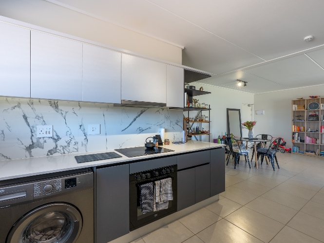 The spacious open-plan lounge and kitchen is designed for effortless living, fitted with blinds, a double sink, fridge, washing machine, and dishwasher – making it both functional and modern.