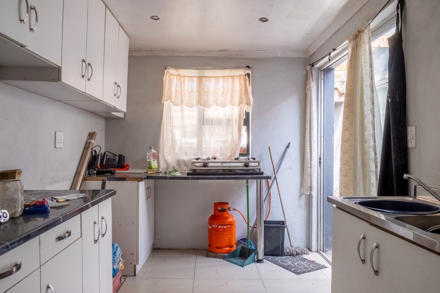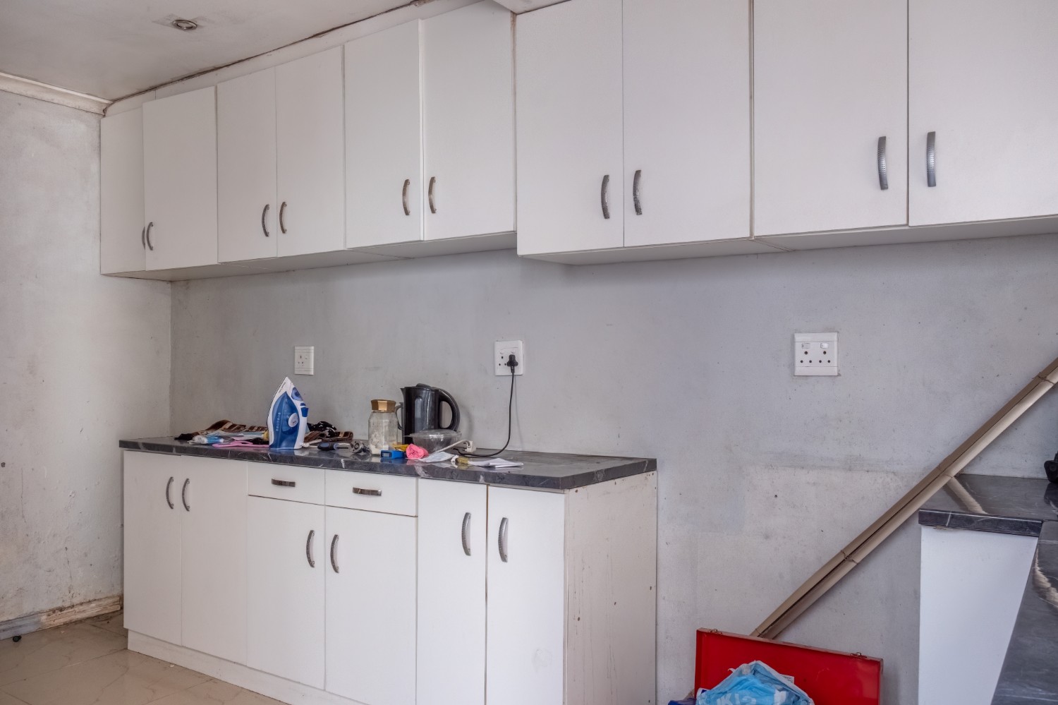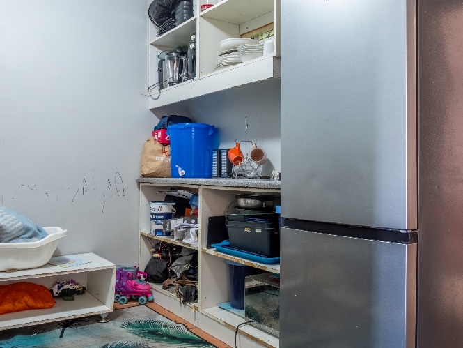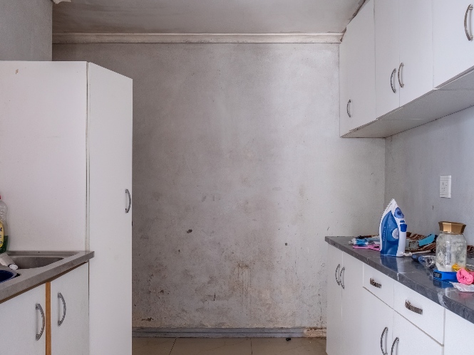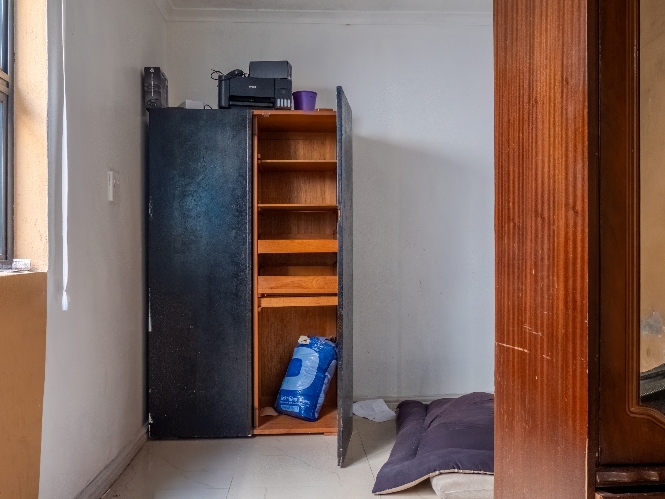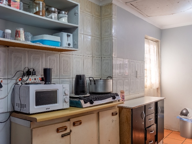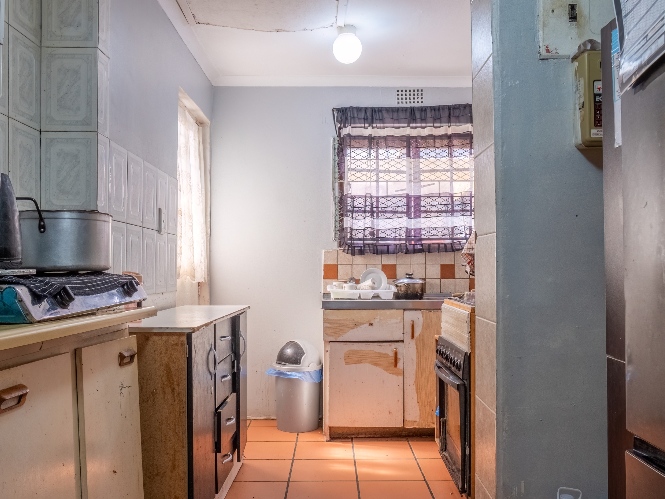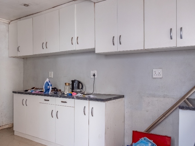The kitchen offers built-in cupboards, providing practical storage and functionality.