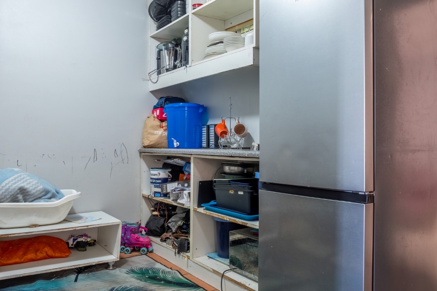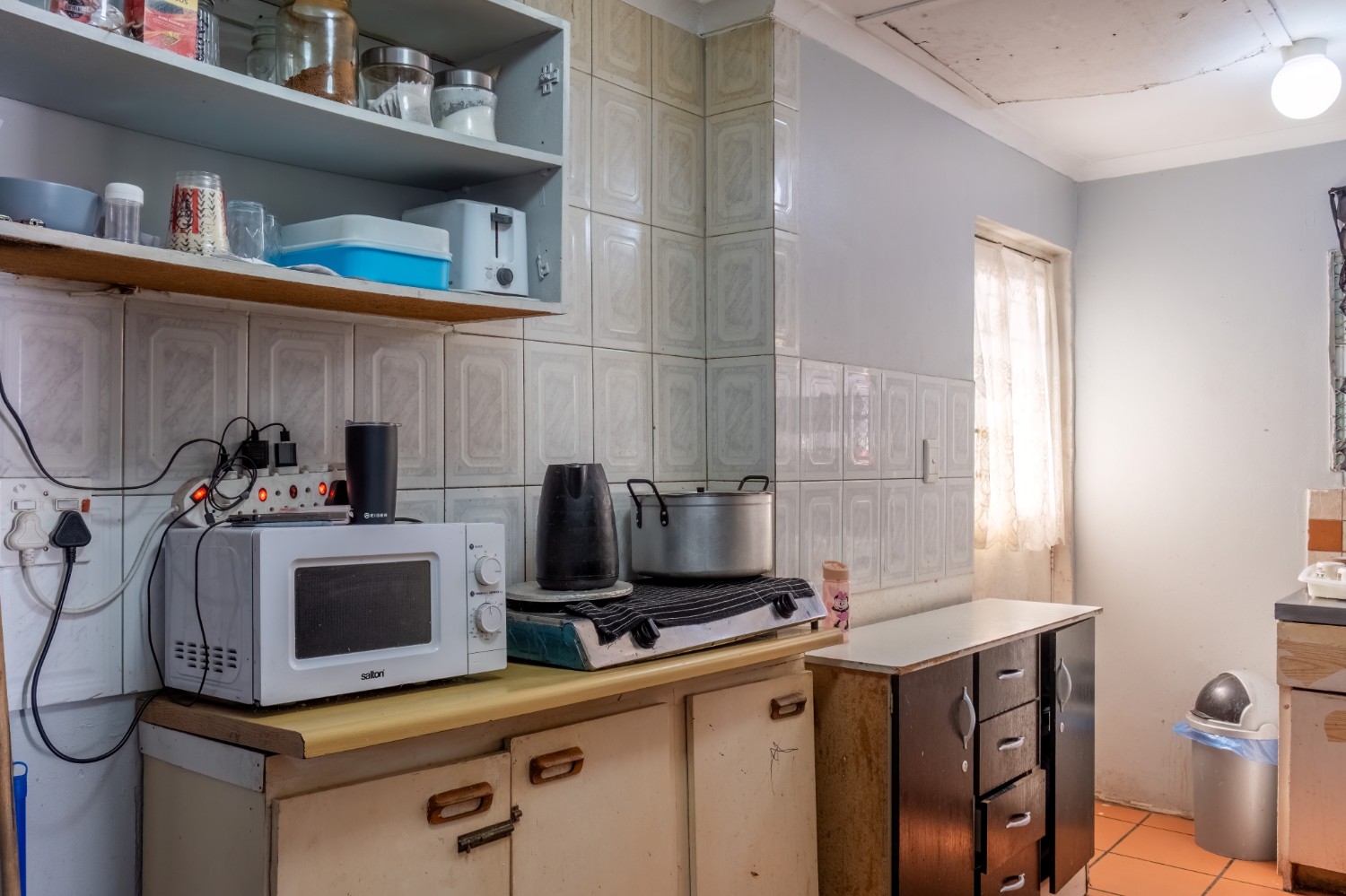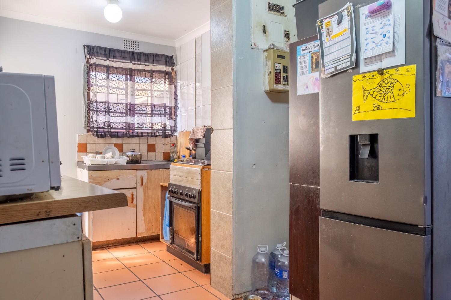The kitchen offers built-in cupboards, providing practical storage and functionality.