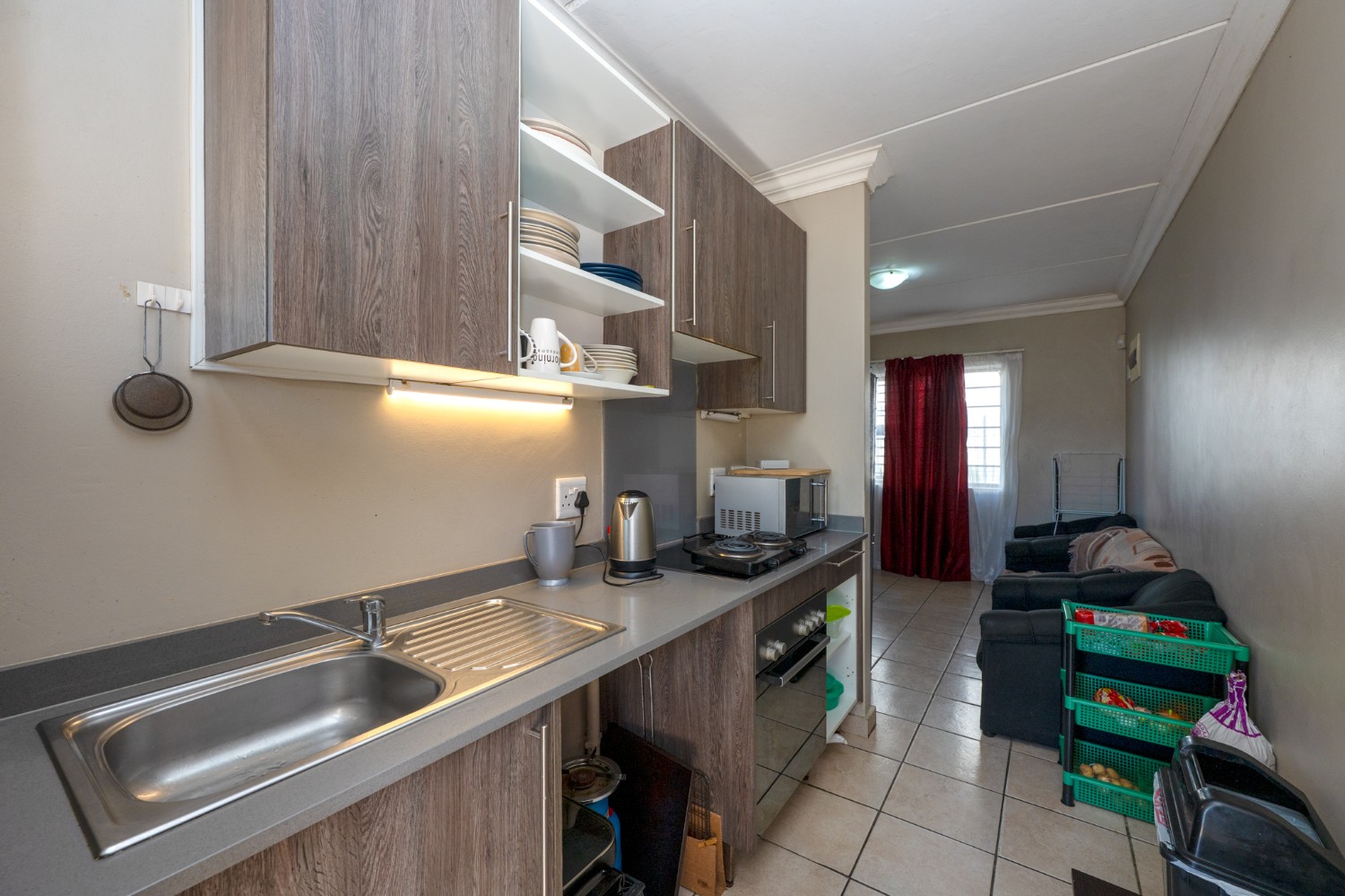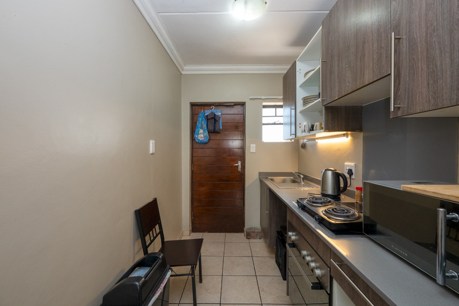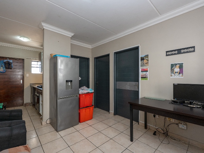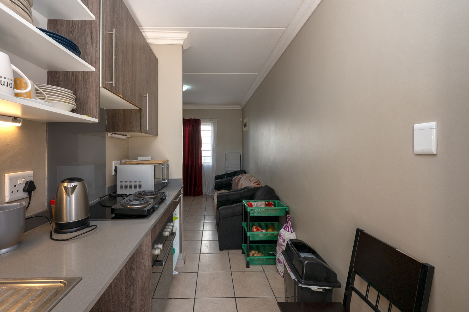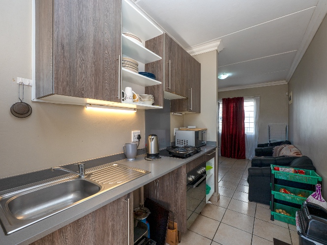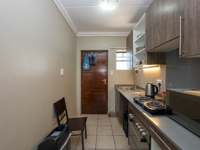 The apartment features a well-sized lounge with tiled flooring, creating a low-maintenance and welcoming living space perfect for relaxing or entertaining guests. The kitchen is practical and functional, fitted with built-in cupboards, quartz countertops, an under-counter oven and hob, one plumbing point and space for a fridge, making it convenient for everyday use.