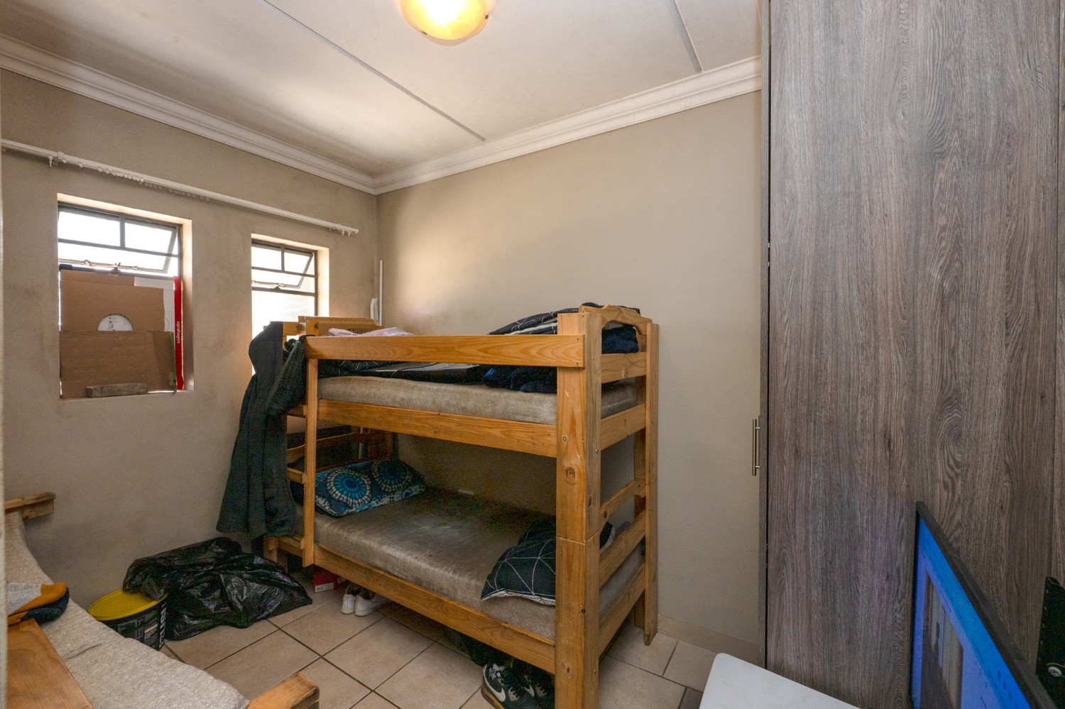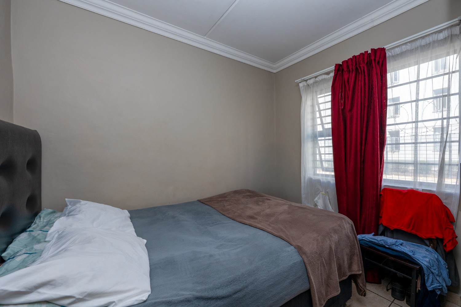Both bedrooms are fitted with tiled flooring and built-in cupboards, providing comfortable accommodation with ample storage. The bathroom is neatly finished with tiled flooring and includes a bathtub, basin, and toilet.