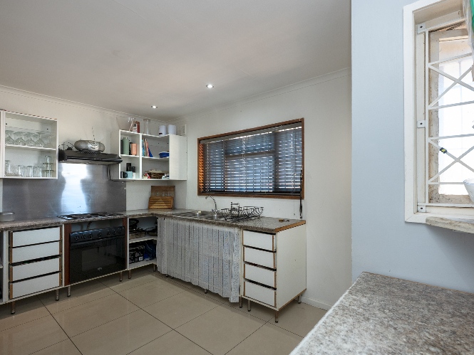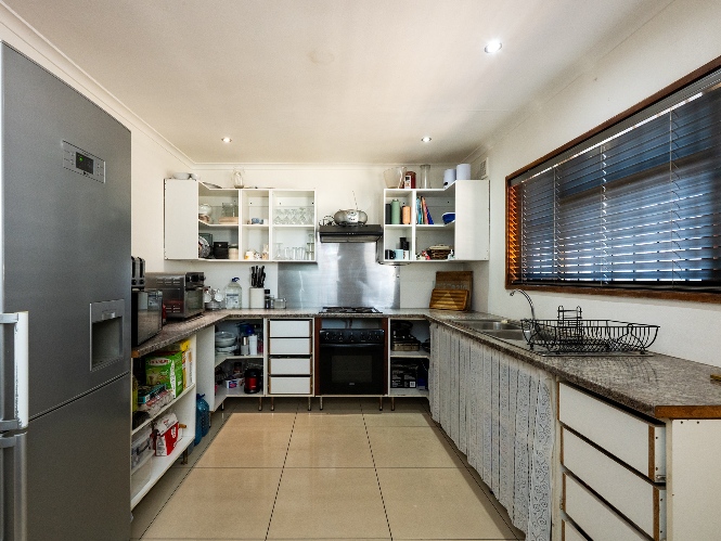 The spacious lounge is filled with natural light and features a sliding door that seamlessly connects the indoor living space to a beautiful outdoor area. Outside, you will find a gorgeous swimming pool, the perfect setting for relaxing summer days, family gatherings, and entertaining guests. The kitchen is both practical and inviting, offering ample cupboard space, an under-counter oven and hob, a double sink, and room for a fridge, making it ideal for everyday living and home cooking.