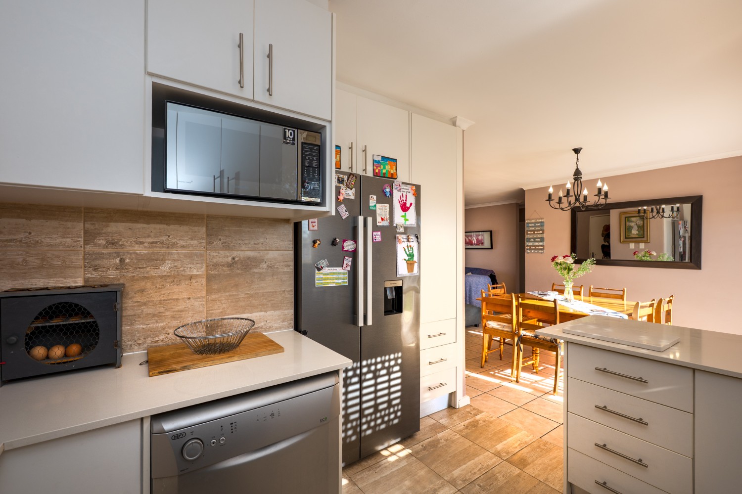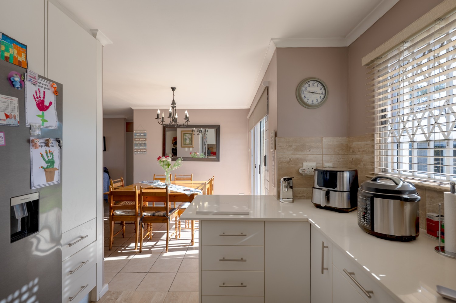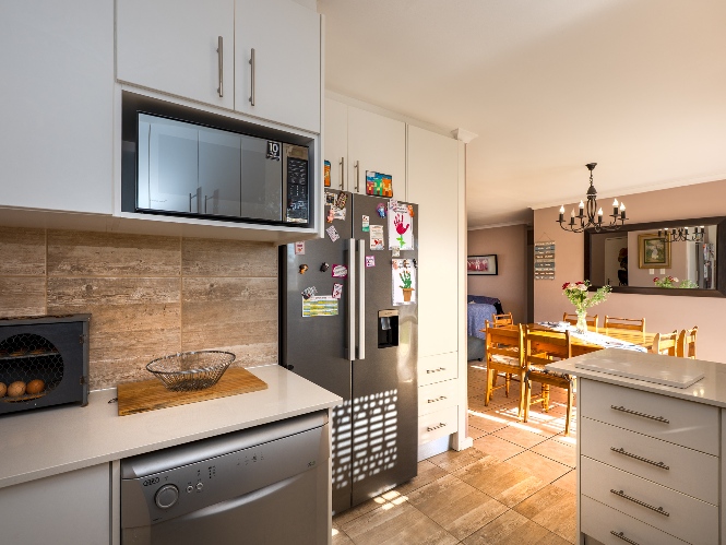 Step inside and be welcomed by a spacious open-plan lounge and dining room, beautifully finished with tiled flooring. The lounge is fitted with an air-conditioning unit, ensuring year-round comfort. The dining room features a sliding door that opens to the backyard, perfect for entertaining and relaxed family living. The modern kitchen is both stylish and functional, boasting light wood cupboards, quartz countertops, an under-counter oven with a gas stovetop, one plumbing point, and ample space for a double-door fridge.