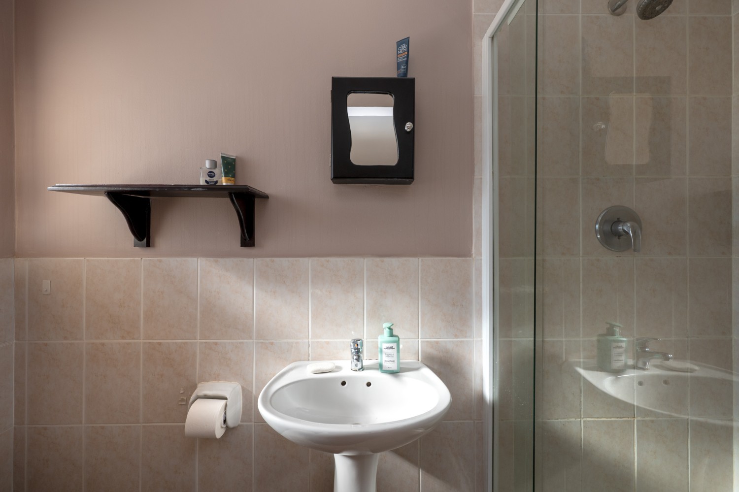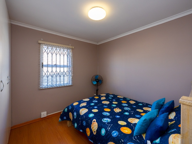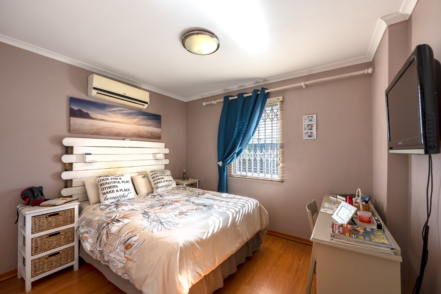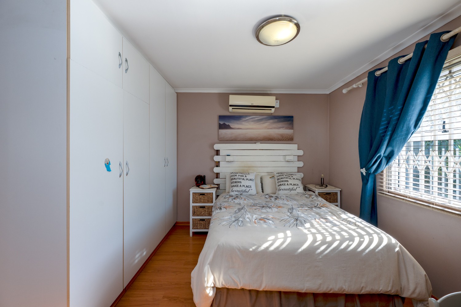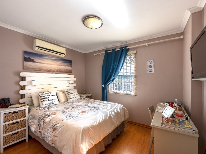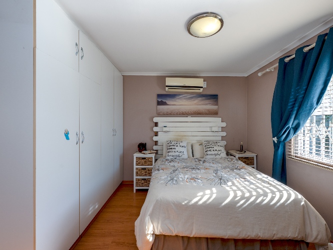 There are 2 generously sized bedrooms with built-in cupboards and ample natural lighting. The master bedroom is a true retreat, complete with its own air-conditioning unit and a private en-suite bathroom. The family bathroom is tastefully tiled and fitted with a bathtub, basin, and toilet.