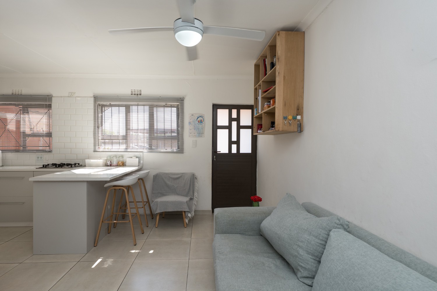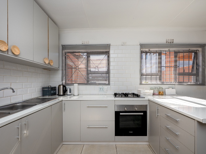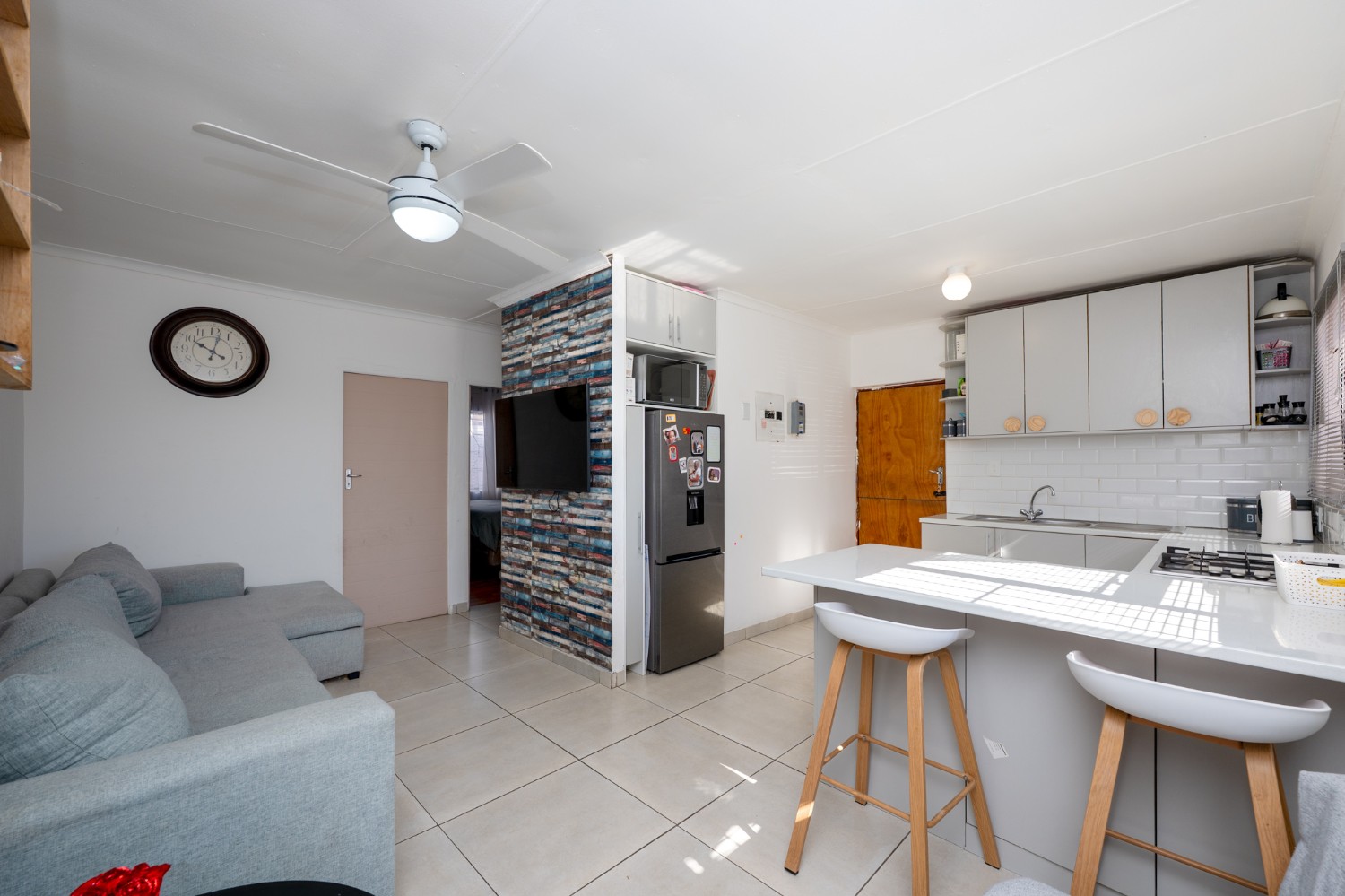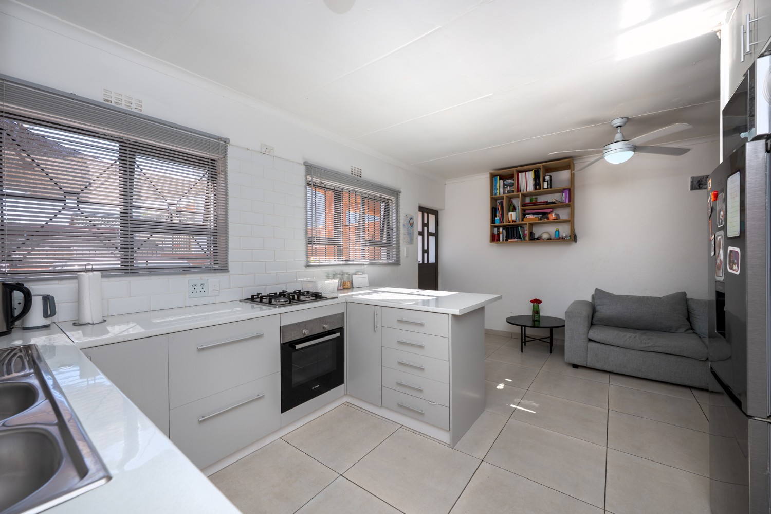 Step inside to a bright and inviting lounge featuring sleek tiled flooring, creating a clean and contemporary space to relax or entertain guests. The heart of the home is the beautifully designed kitchen, fitted with light wood cupboards that add warmth and elegance, an under-counter oven and gas stovetop, ample countertop space, and a dedicated room for a fridge, perfect for effortless meal preparation and everyday convenience.