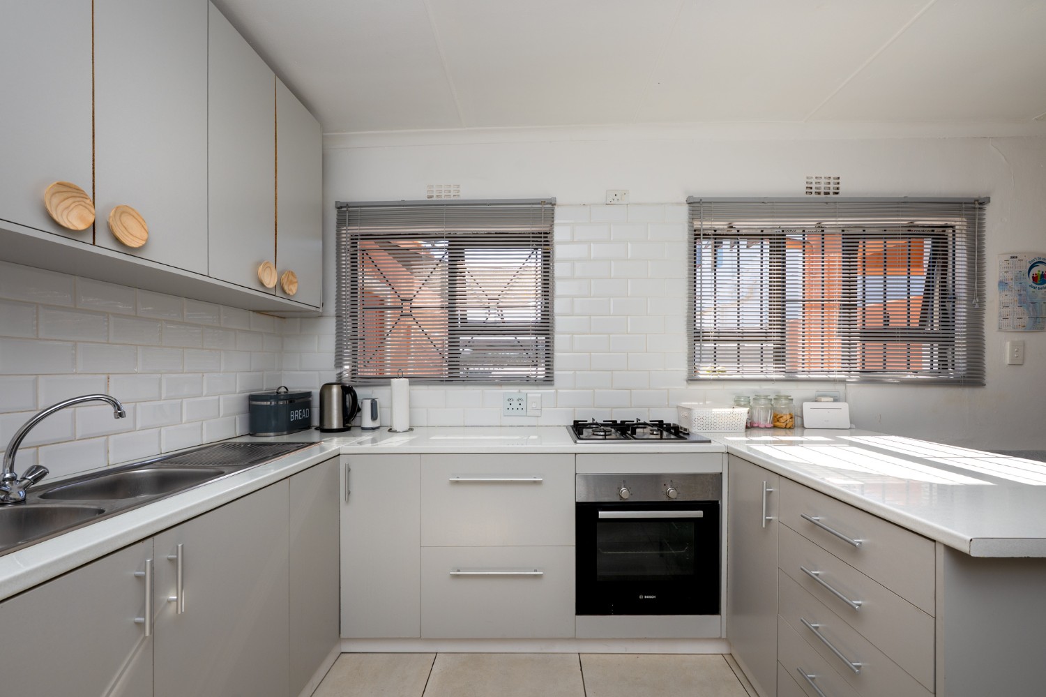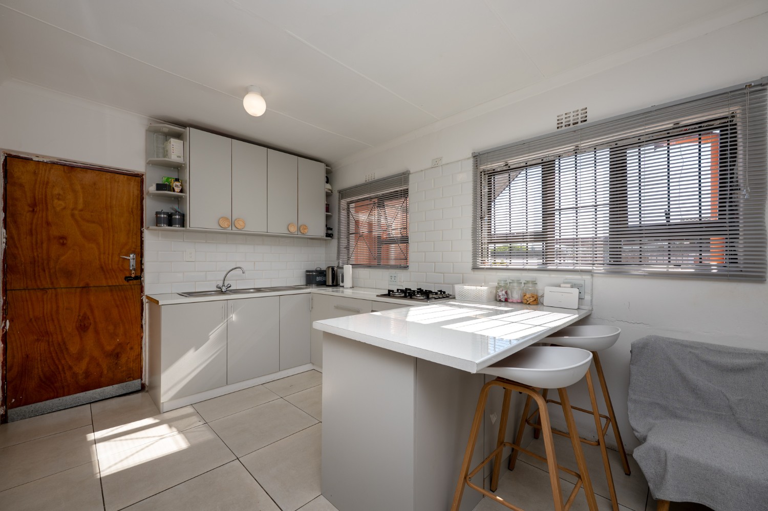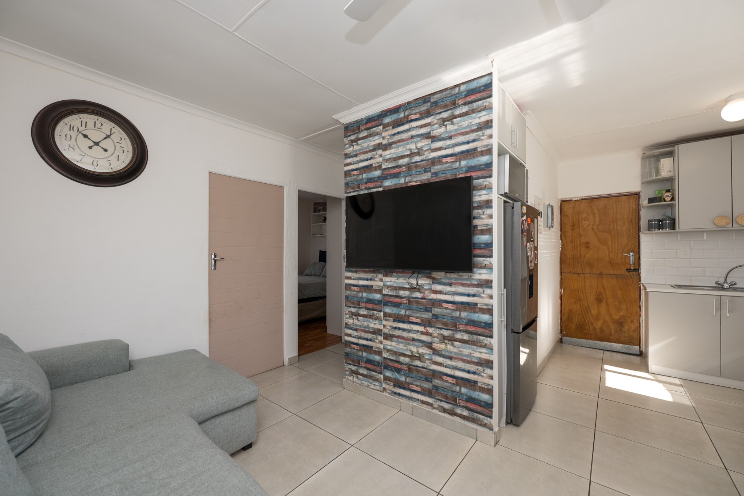 Step inside to a bright and inviting lounge featuring sleek tiled flooring, creating a clean and contemporary space to relax or entertain guests. The heart of the home is the beautifully designed kitchen, fitted with light wood cupboards that add warmth and elegance, an under-counter oven and gas stovetop, ample countertop space, and a dedicated room for a fridge, perfect for effortless meal preparation and everyday convenience.