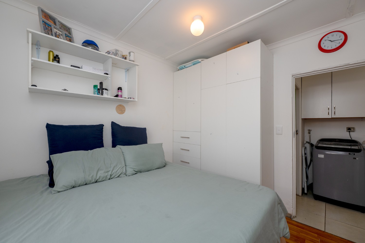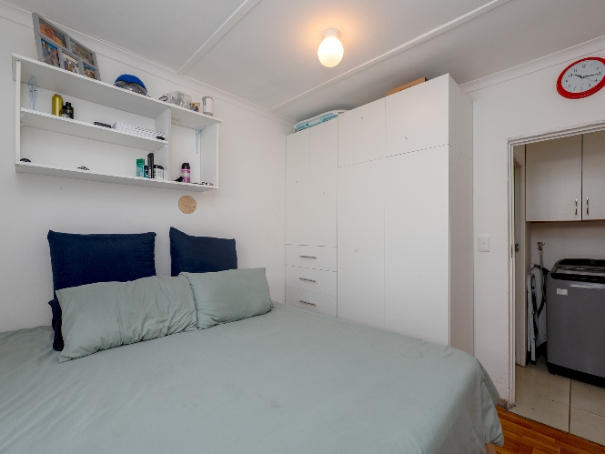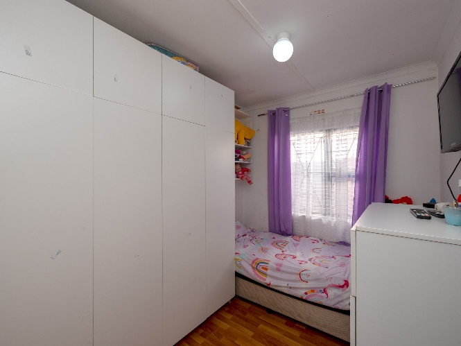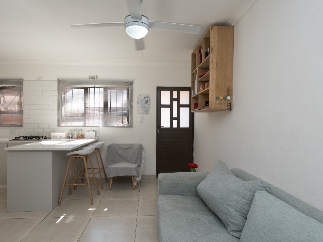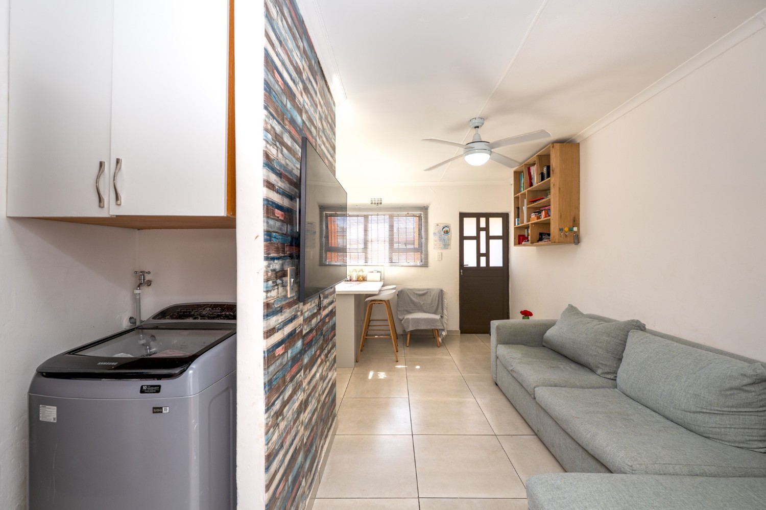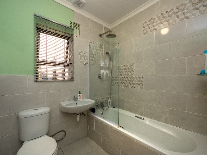 The home offers two well-sized bedrooms, both fitted with built-in cupboards and stylish laminated flooring, providing comfort and ample storage. Just off the bedrooms, you will find a practical laundry nook with a plumbing point, adding to the home’s functional design. The bathroom is fully tiled from floor to ceiling, offering a neat and modern finish. It includes a bath with a showerhead, toilet, and basin.