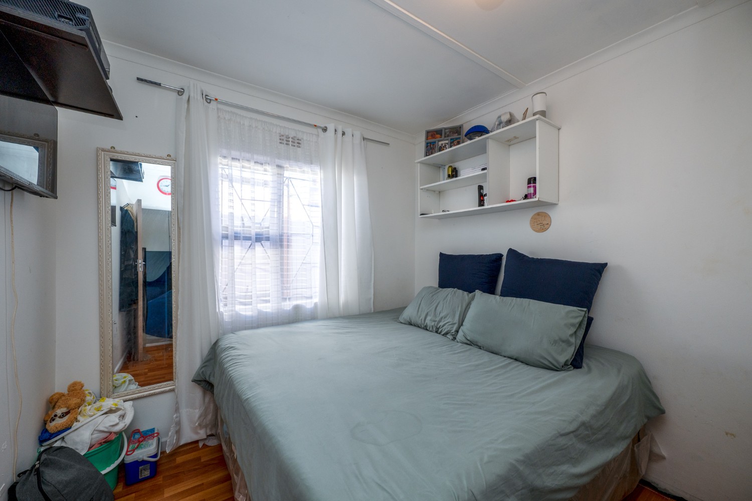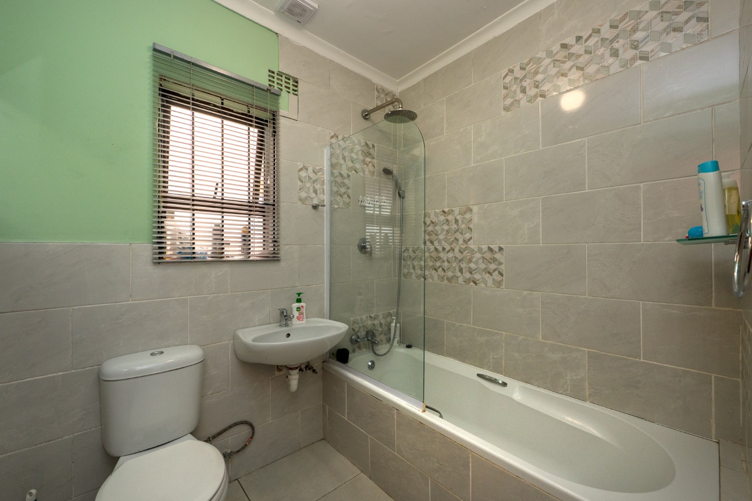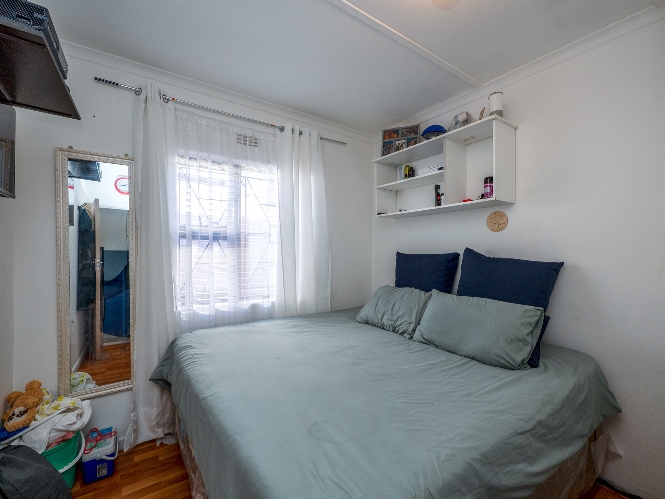 The home offers two well-sized bedrooms, both fitted with built-in cupboards and stylish laminated flooring, providing comfort and ample storage. Just off the bedrooms, you will find a practical laundry nook with a plumbing point, adding to the home’s functional design. The bathroom is fully tiled from floor to ceiling, offering a neat and modern finish. It includes a bath with a showerhead, toilet, and basin.