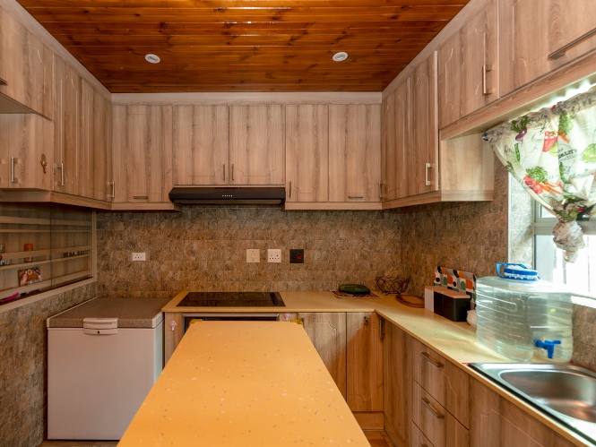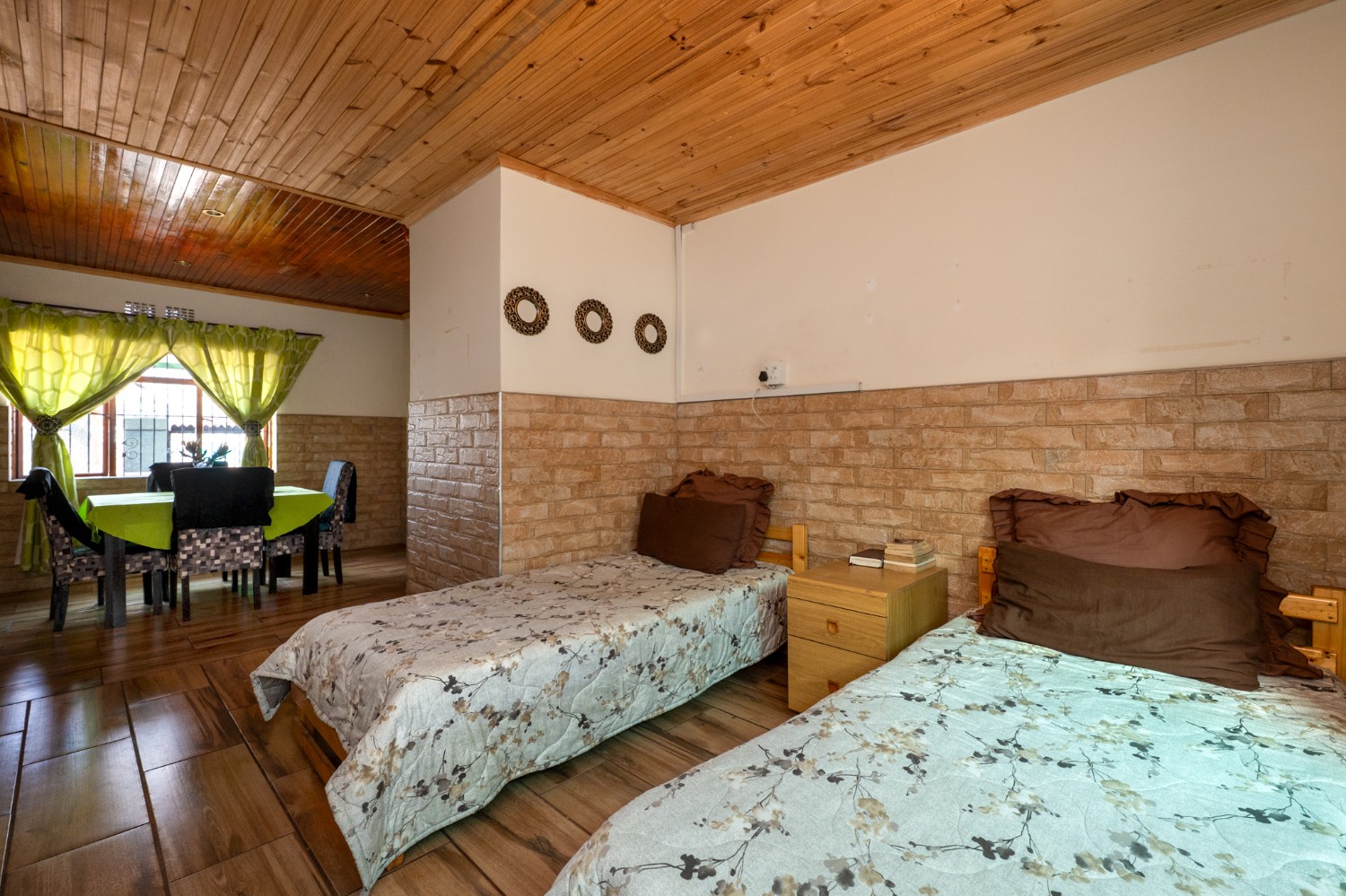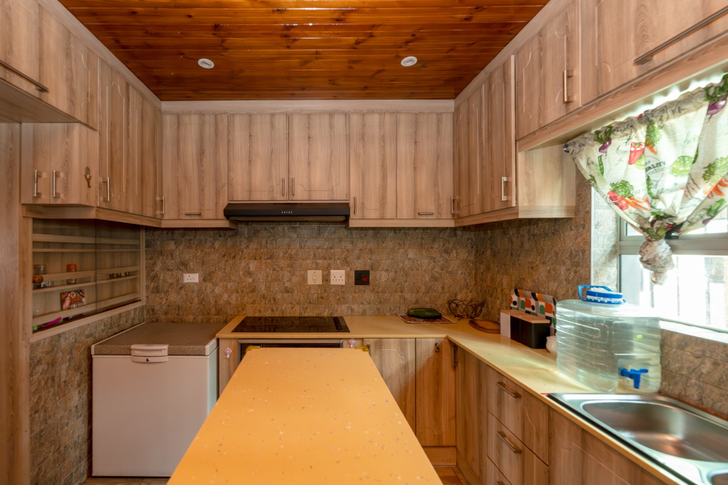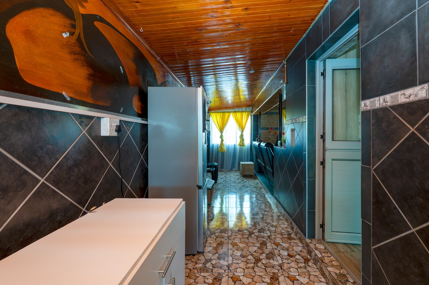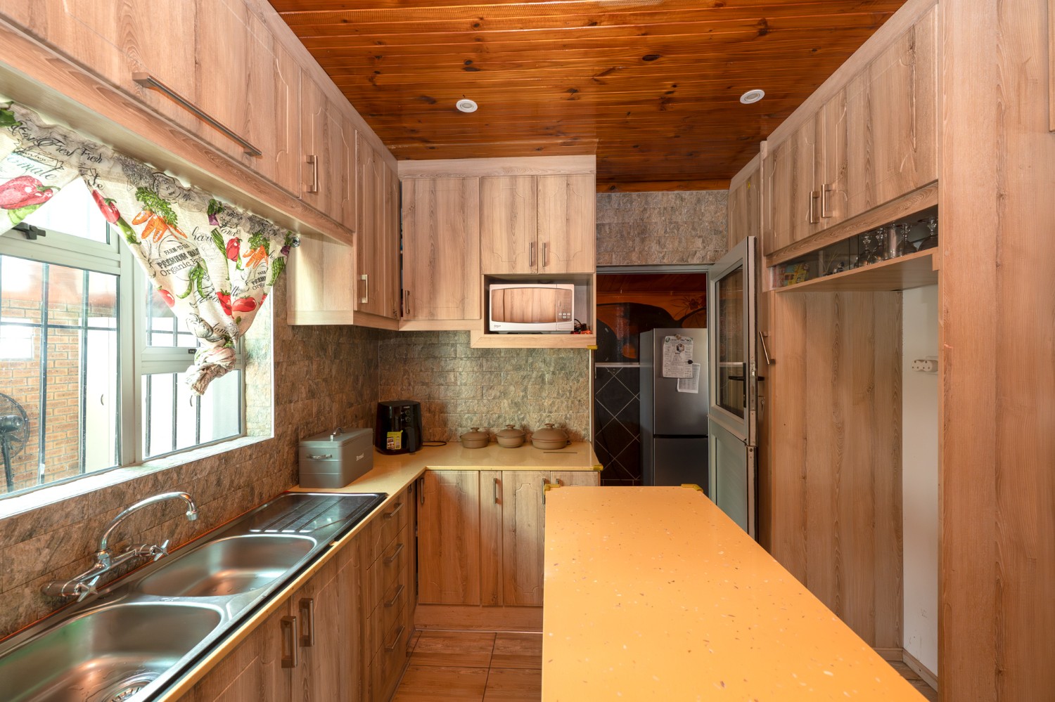 As you enter, you are welcomed by a well-sized lounge featuring sleek tiled flooring and large windows that flood the space with natural light, creating a warm and airy atmosphere. A charming dining area is situated just off the bedrooms. The kitchen is thoughtfully designed with light wood cupboards, offering ample storage space, an eye-level oven and hob, a double sink and a dedicated space for a fridge.